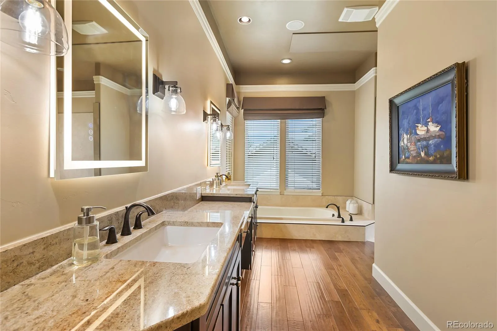 The spacious family room invites you to unwind with built-in surround sound and a cozy gas fireplace, creating the perfect ambiance for relaxation or entertaining. On the main level, two luxurious suites await, including a master retreat with a fully remodeled spa-inspired bath. Experience radiant ceiling heating that gently pours warmth over you as you soak in the sumptuous tub — pure indulgence for cold winter nights.