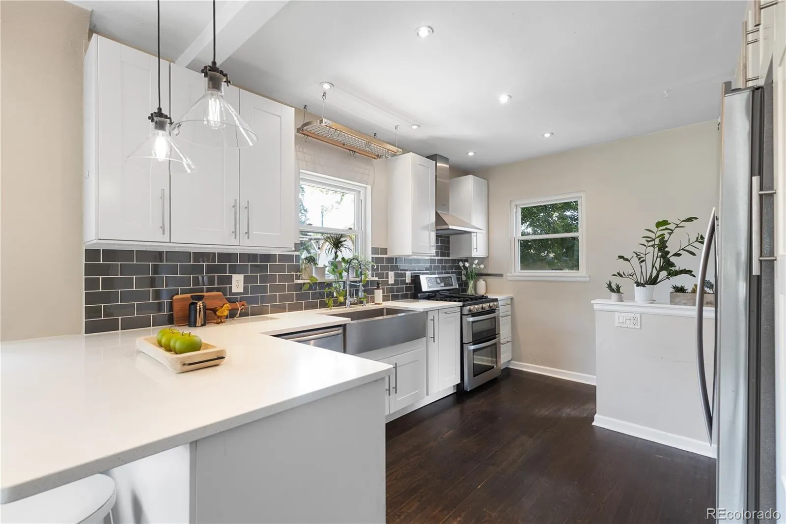 Brand new modern HVAC with forced-air heat and central cooling. There are 4 bedrooms and 2 full bathrooms. An open design, light-filled layout, fresh designer paint, ebony hardwood floors, stylish trim, open-concept living/dining area—with a perfect flow for entertaining. An Updated kitchen featuring stainless steel appliances, subway-tile backsplash, a farm-style sink, quartz counters, 42-inch cabinetry, pantry, and breakfast bar for casual meals. There is a large, finished basement, with extra storage and the laundry room. The backyard is completely fenced for dogs and kids, raised vegetable garden beds, a huge shade tree over a cement pad for seating, grilling, and socializing. The best part is a rare 3-car garage, which has easy entry from the alley. All on a serene, leafy mature landscaped street—yet steps from Denver’s best urban amenities. Great for families, creative souls, and anyone who values a walkable, vibrant community lifestyle.