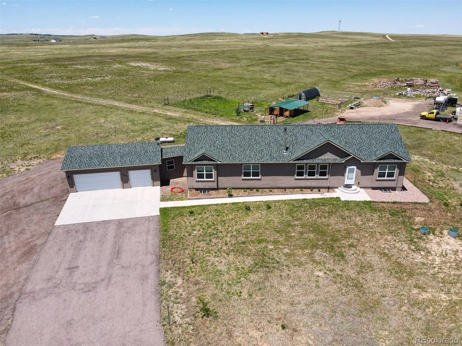 Rare 40-Acre Homestead with Panoramic Views and Exceptional Amenities Discover the unparalleled opportunity to own 40 acres of pristine Colorado landscape, offering breathtaking 360-degree views—including an unobstructed panorama of Pikes Peak and the Front Range—just 30 minutes from Powers Blvd. (North and/or South) This expansive 4,408 sq. ft. home features a luminous, open-concept floor plan with three spacious bedrooms, two bathrooms, and an unfinished basement ready for your personal touch. The chef’s kitchen is equipped with a side-by-side refrigerator, double oven, gas range, oversized pantry, dishwasher, and reverse osmosis filtration, making it ideal for both daily living and entertaining. Enjoy peace of mind with security gates at both entrances, a comprehensive video camera system, and a backup generator. Additional features include a 40-gun Liberty safe, water softener, whole-house ozone filtration, washer, and dryer. Outdoor amenities are tailored for self-sufficiency and recreation: a double chicken coop with free-range area, irrigated greenhouse, and fenced raised-bed gardens producing a variety of fruits, vegetables, and herbs. End a vigorous day of country living in an awesome enclosed hot tub. The property also boasts three apple and three cherry trees, pasture mix, a 40-foot storage Conex has – Elastomeric heat resistant painted roof, rubber gym flooring, solar powered fans, commercial shelving and refrigerator/freezer—perfect for a workshop or extra storage. With approximately 70 cords of pine, 20 cords of hardwood firewood, a 200-yard shooting range, riding mower, and children’s play area, this property truly offers family security, and the freedom of rural living. Schedule your private showing today to experience this extraordinary homestead.