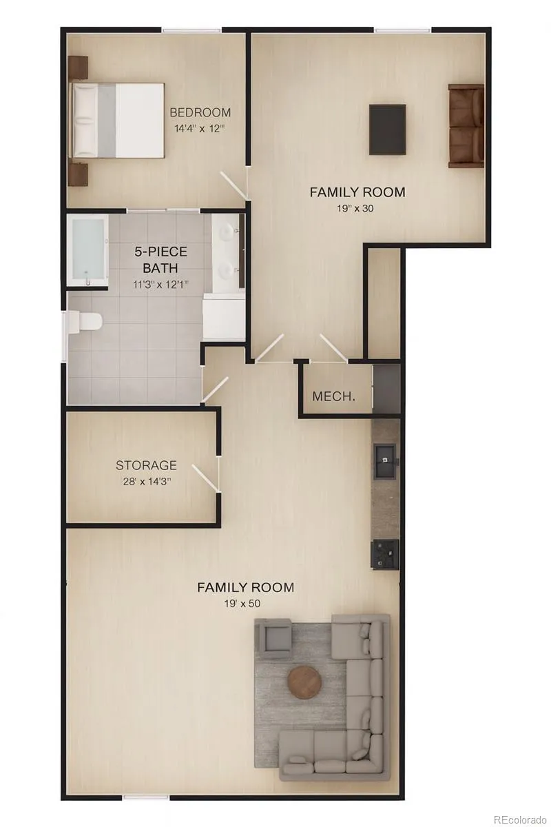 The last photo is AI generated to show a potential to finish the basement space into on additional bedroom, full bathroom and extra TV Living spaces.
