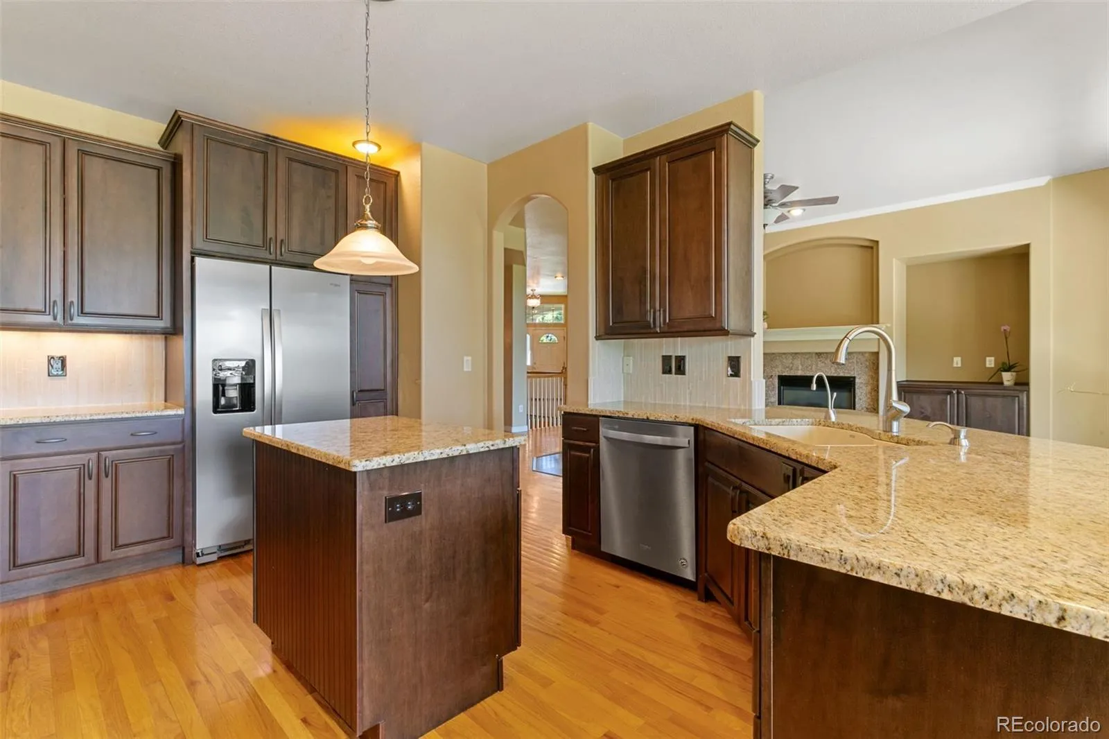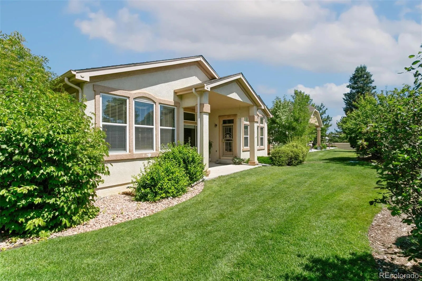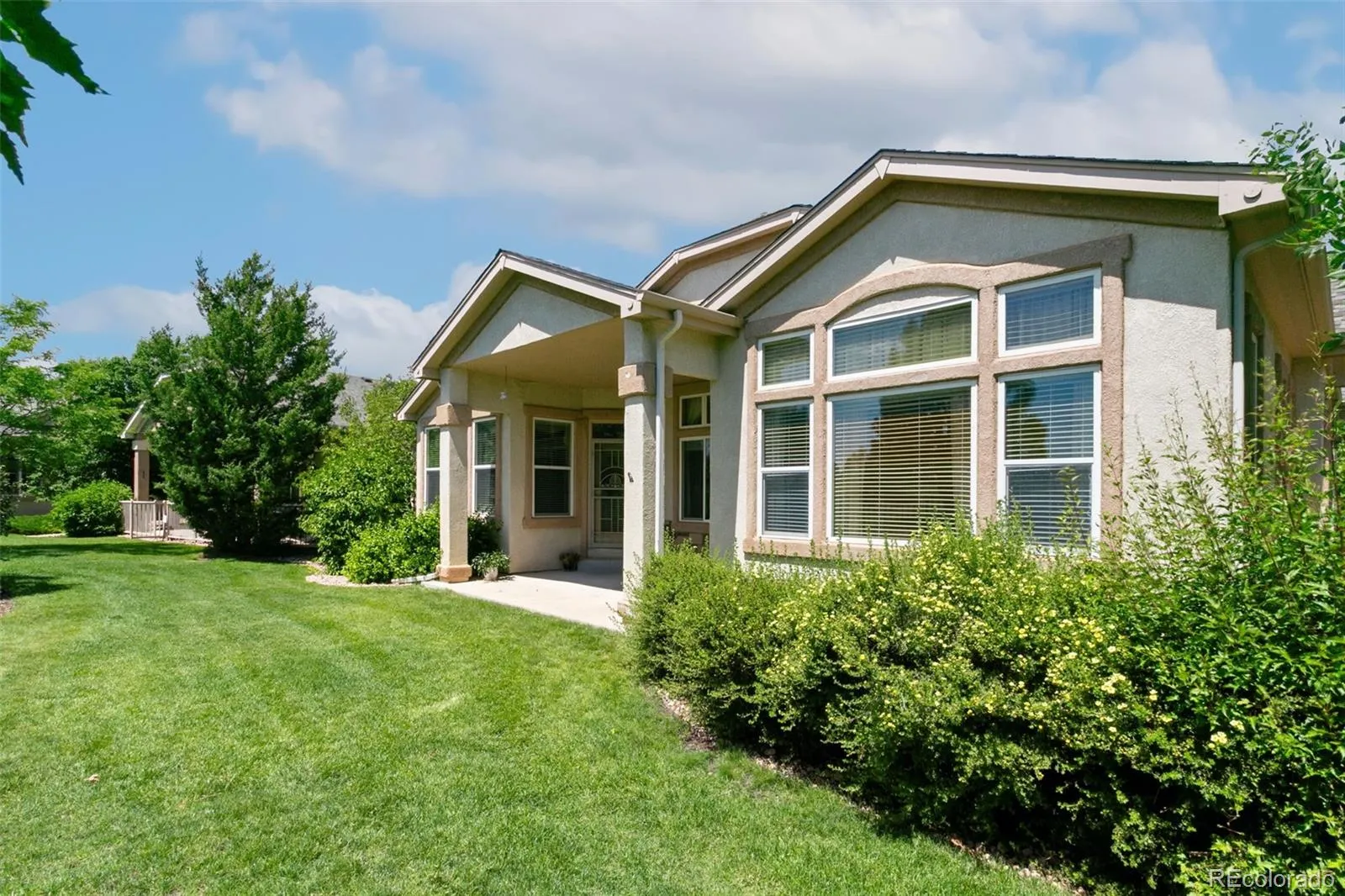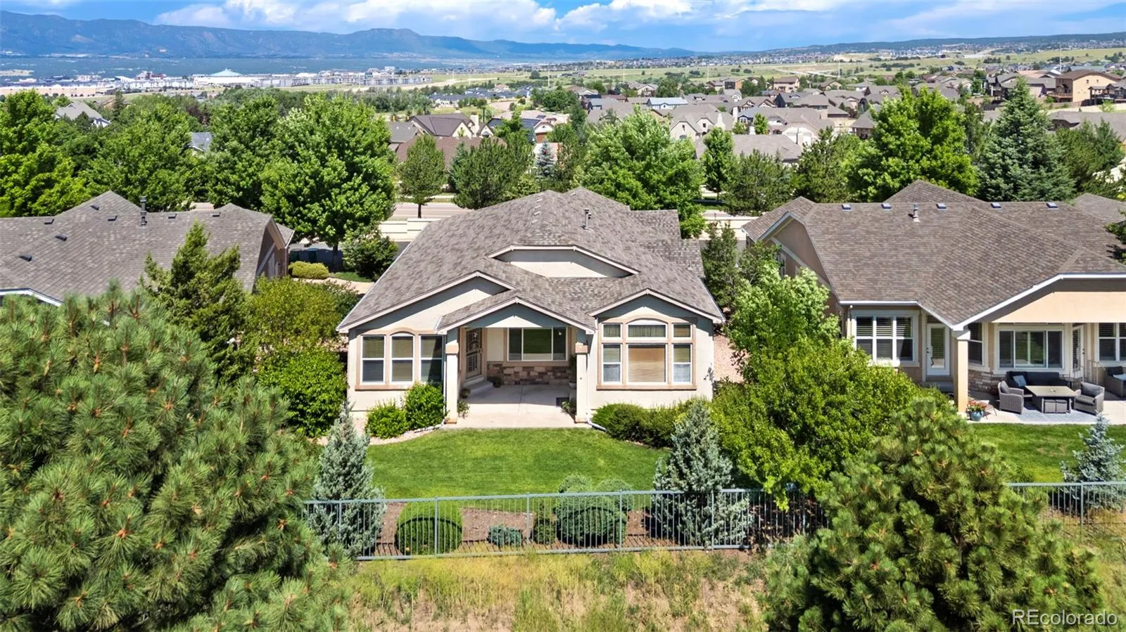 Enjoy low-maintenance living in this beautifully updated ranch-style home located on the golf course in the prestigious Pine Creek Community. This gorgeous home offers a spacious floor plan with 4 bedrooms, 4 bathrooms, and soaring 10-foot ceilings throughout the main level to create a bright, open atmosphere filled with natural light. The updated kitchen is the heart of the home, featuring abundant cabinetry, granite countertops, a central island with counter seating, and a spacious dining nook with a charming bay window overlooking the backyard and golf course. A formal dining room adds additional space for entertaining, while the great room offers a cozy gas fireplace and a wall of windows adorned with beautiful views. The main-level primary suite is a true retreat with a luxurious five-piece bath and generous walk-in closet. A second bedroom and ensuite full bath, along with the laundry room and another half bath round out the main level. The finished basement expands your living space with two additional bedrooms, a large family room, a bonus room perfect for crafts or hobbies, a full bath, and a spacious storage room. Enjoy outdoor living year-round on the covered back patio, with scenic views and room to relax. The home has been thoughtfully updated with quality finishes and attention to detail throughout. Conveniently located near I-25, hospitals, shopping centers, and restaurants—this home combines comfort, style, and accessibility in a highly desirable golf course setting.