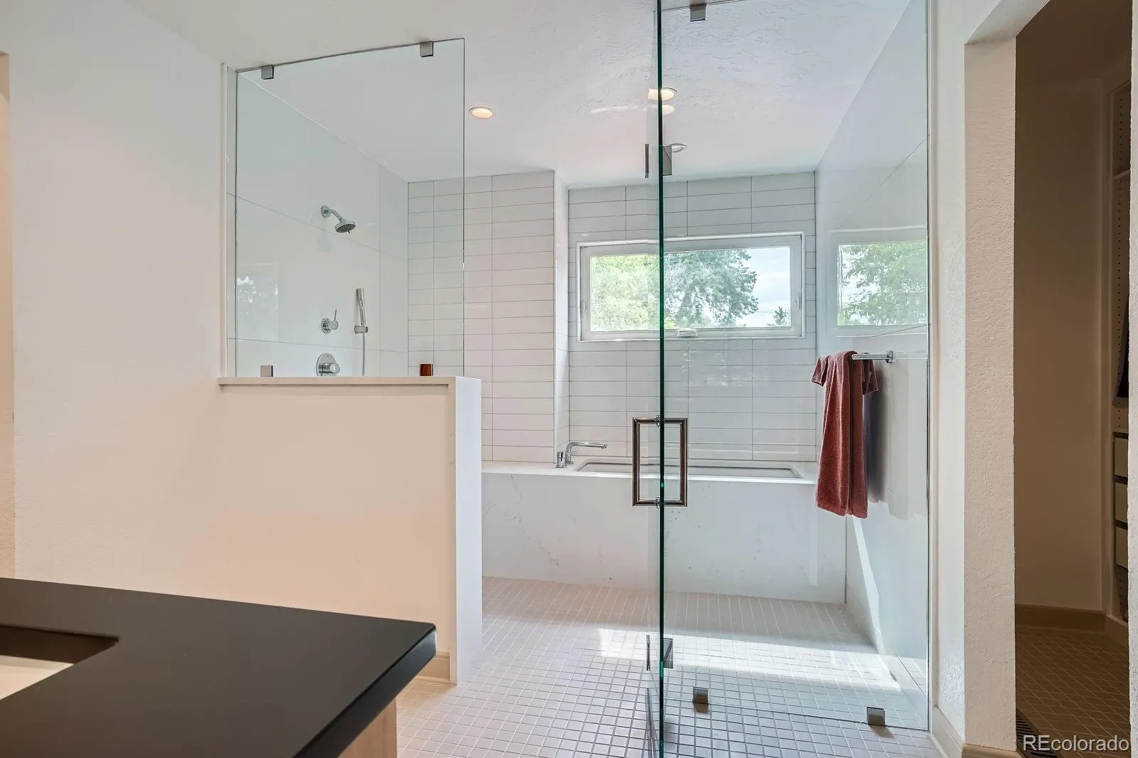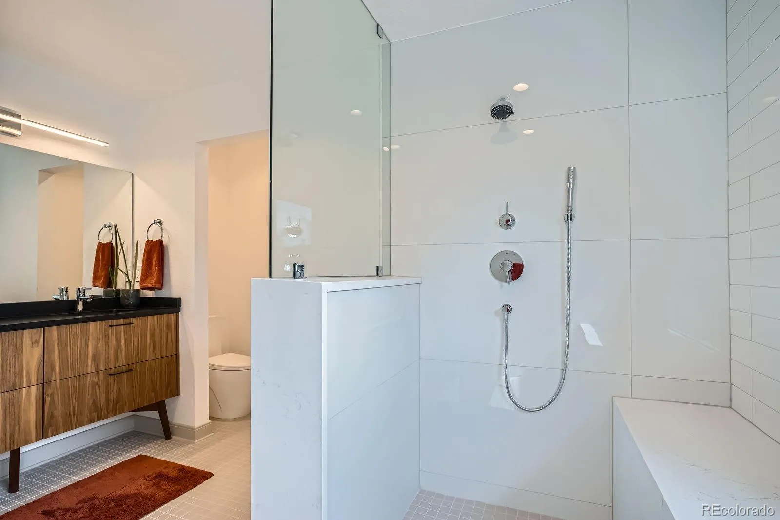 Upstairs, your spacious primary bedroom awaits. The recently renovated ensuite brings hotel luxury home. Unwind in your large walk-in shower or deep soaking tub wrapped in marbled quartz. The walk-in closet comes complete with built-ins that can be easily customized to fit your style. Across the landing is another bedroom and full bathroom. The lofted ceiling and mature trees give this bedroom a calm, secluded feel.