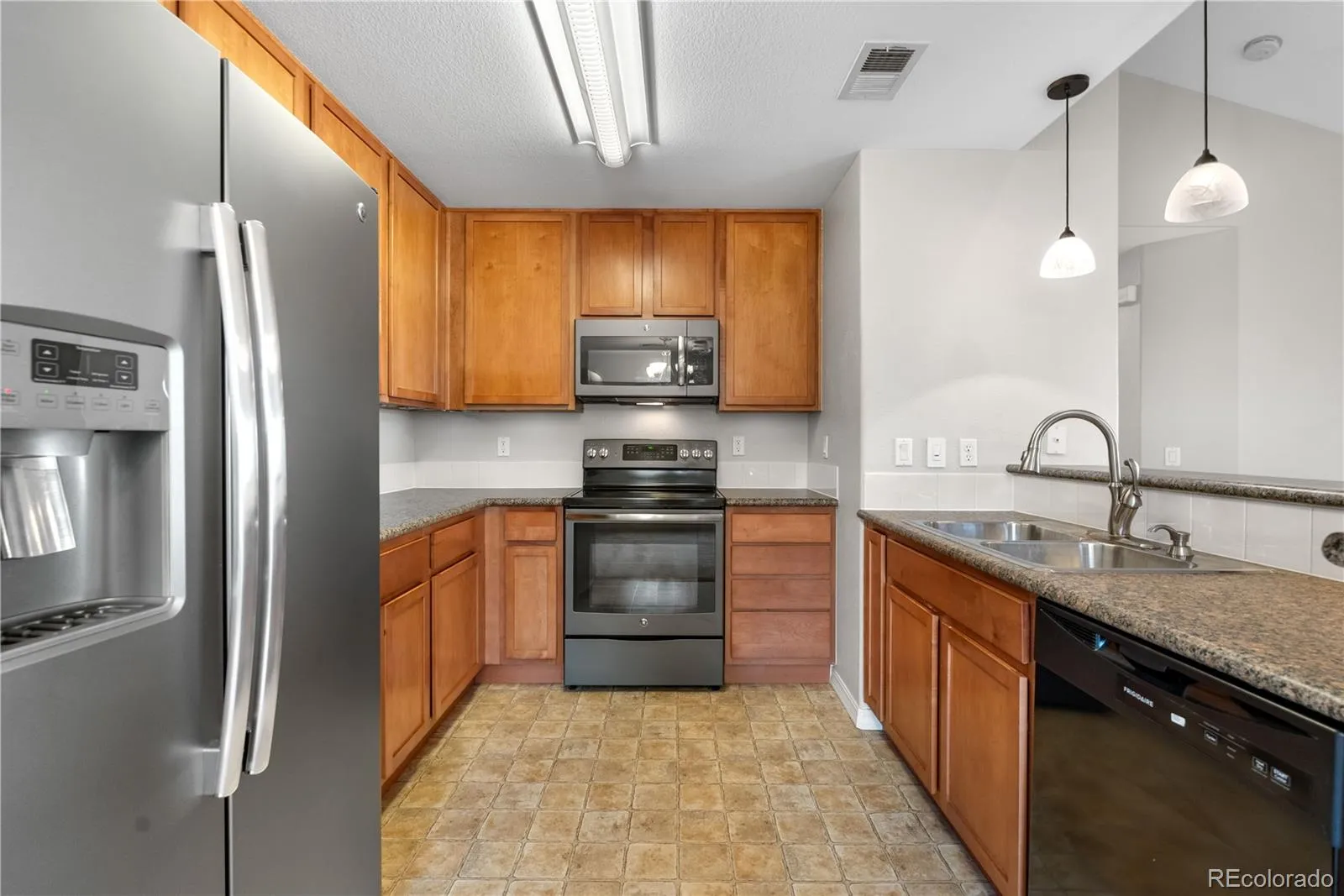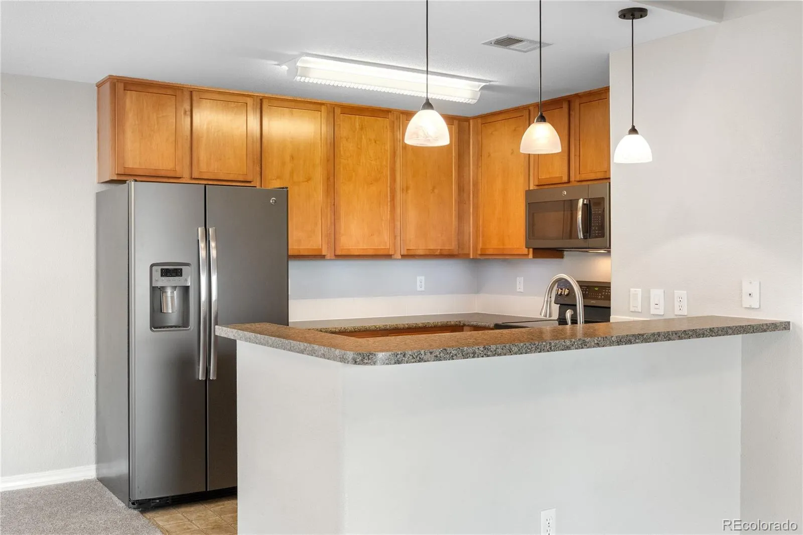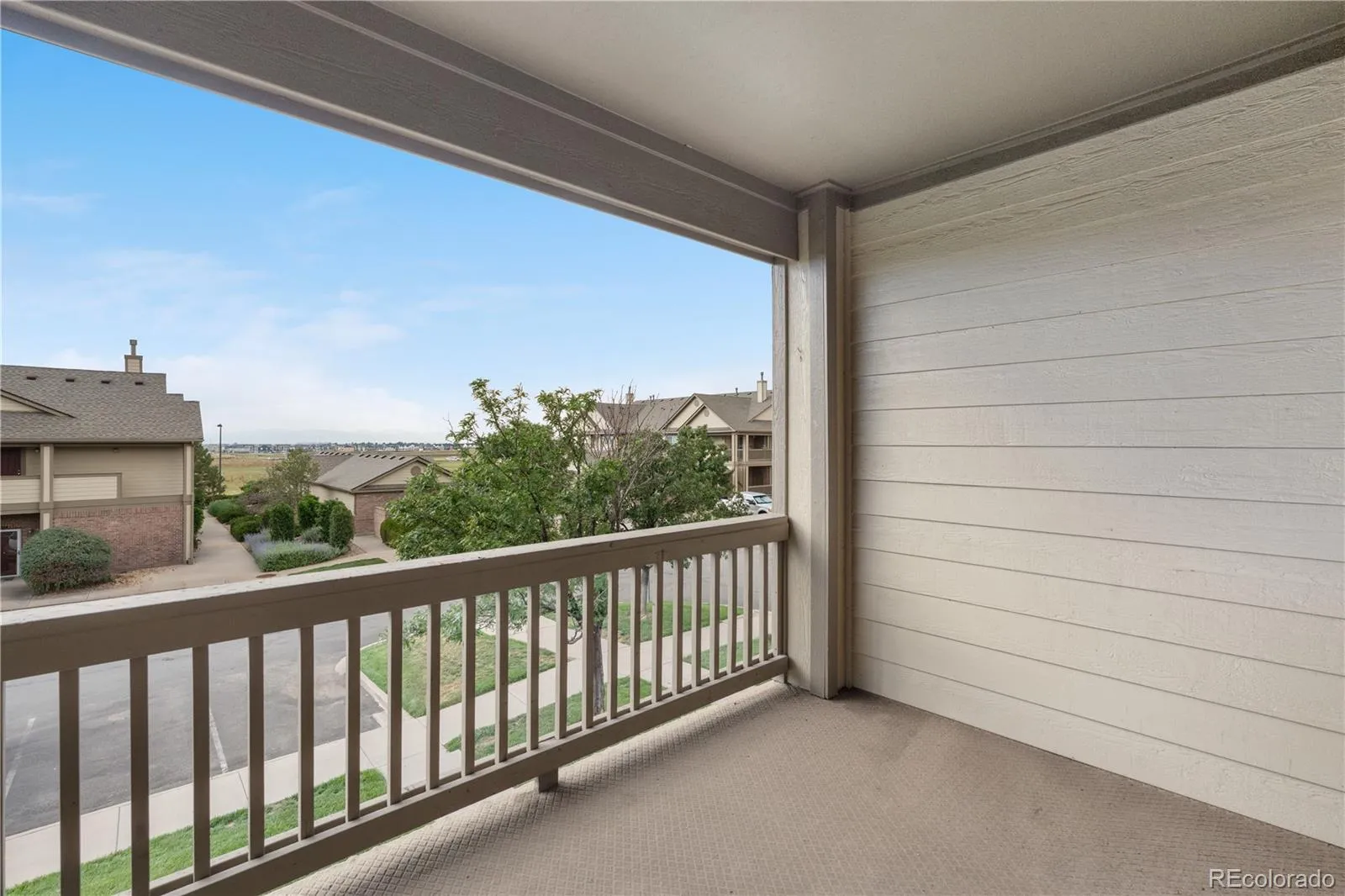 This beautifully maintained upper-floor home is truly move-in ready and waiting for its new owner. Enjoy brand-new carpet throughout and a spacious kitchen featuring tall upper cabinets and sleek slate appliances. A bright dining nook provides the perfect spot to enjoy your meals, while the west-facing layout offers stunning mountain vistas. The cozy living room features vaulted ceilings and a warm gas fireplace, leading to a large, covered deck complete with a convenient storage closet. The primary suite offers generous space with a walk-in closet, private full bath, and linen closet. A second full bath includes a laundry closet for added convenience. Both bedrooms are west-facing, filling the home with natural light and a bright, inviting atmosphere. All of this plus a detached one car garage. Just a short stroll away, you’ll find the Cross Creek Clubhouse and Community Pool—both included in your HOA. With easy access to I-70, E-470, Buckley AFB, and DIA, this home combines comfort, convenience, and community in one ideal package. Bonus: This property qualifies for a $5,000 KeyBank grant, which can be applied toward closing costs or an interest rate buy-down.