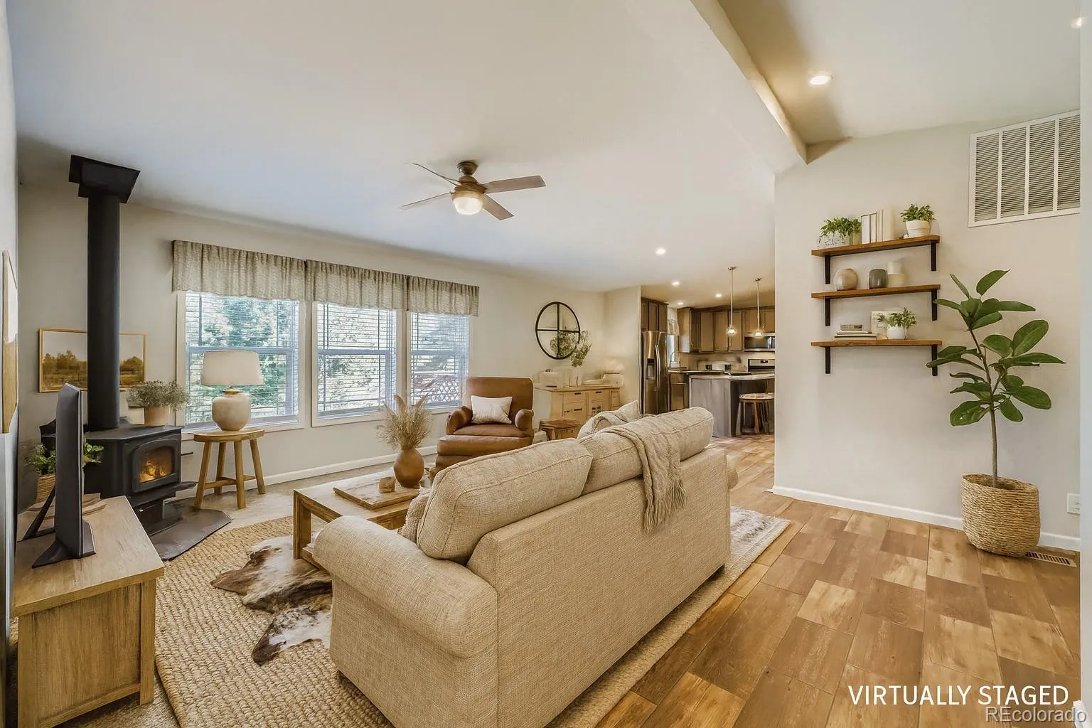 Step inside to an inviting open floor plan that connects the living room, dining area, and kitchen, creating a warm, social atmosphere perfect for gatherings or quiet evenings by the fire. The living space has been virtually staged in a modern homestead style, showcasing cozy textures, reclaimed wood accents, and a clutter-free flow that invites relaxation.
