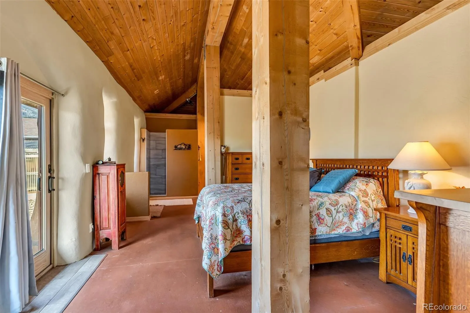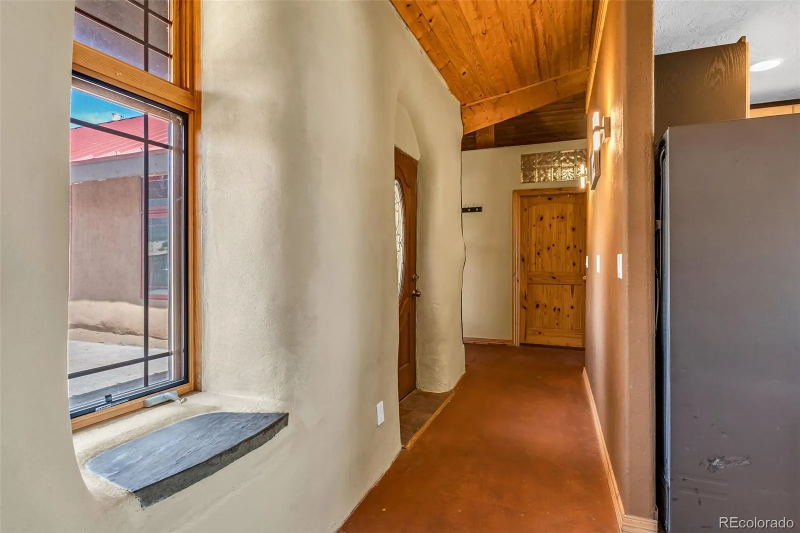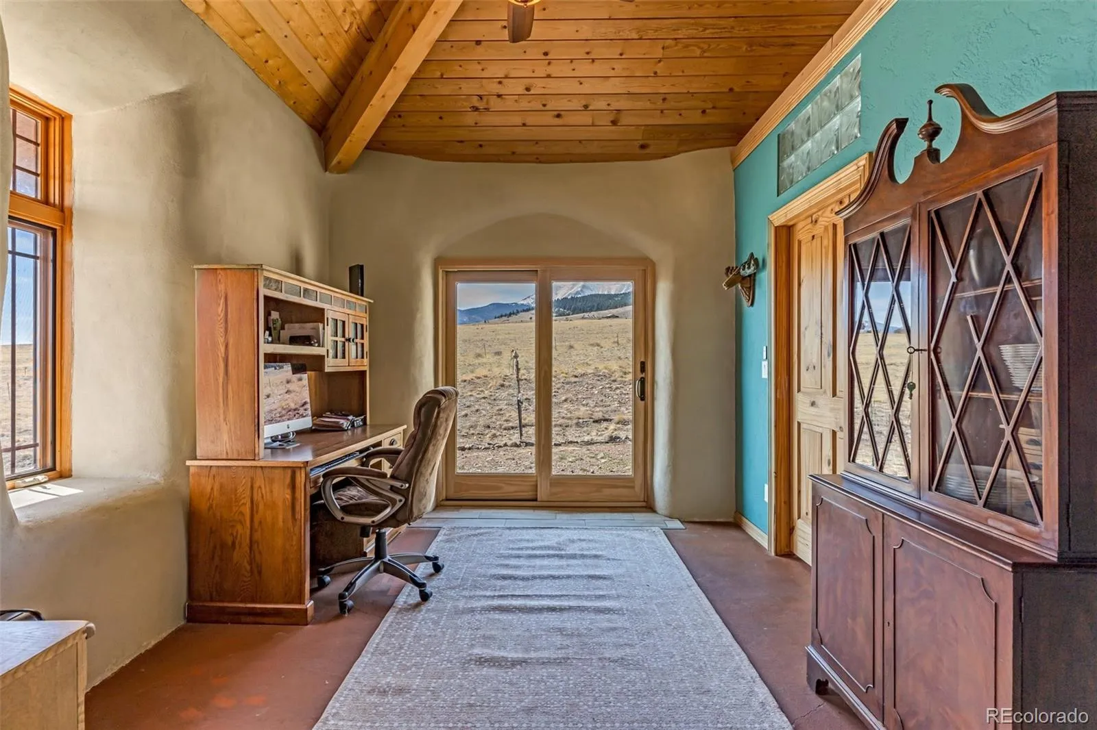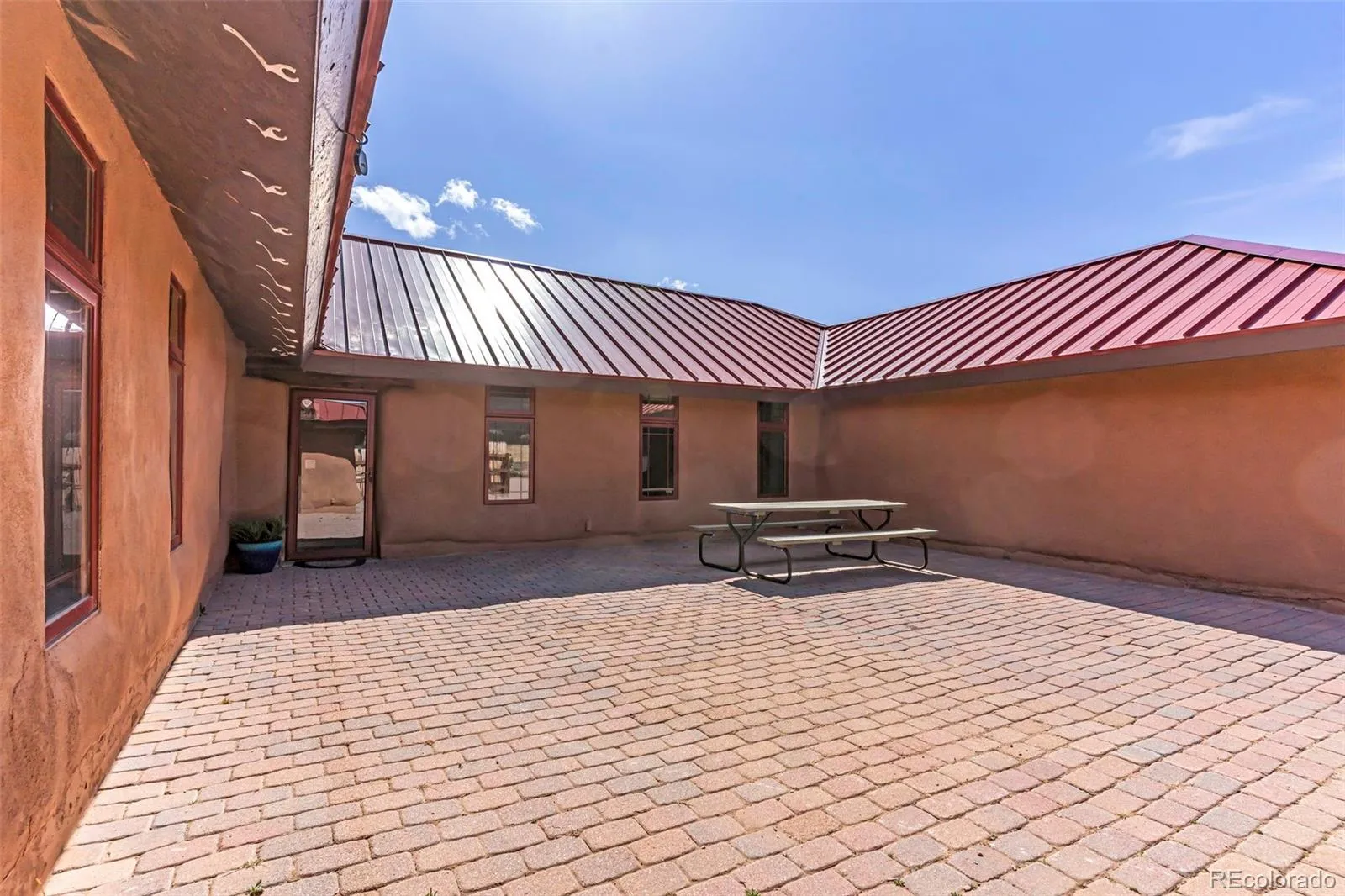 A great location was chosen for this energy-efficient, southwest-style hybrid home. With post & beam construction, hay bale insulation (w/ an R53 insulation factor), & SIP (structural insulated panels (R-17) roofing, earthen plaster interior walls, stucco exterior, concrete floors, in-floor radiant heat, & wood-burning stove, you can plan on reduced utility bills. The center courtyard has brick pavers & latilla fence & provides an excellent spot to soak up the sun & host your BBQs. The one level home has 3 bedrooms, 2 baths, large utility room, bonus/tv/office, great room & kitchen & an attached, heated 2-car garage, plus another detached oversized 2-car garage w/ workshop area. The spacious kitchen w/ cork flooring, has an island w/ seating for 4 & is open to the dining space & great room. This area has tongue& groove vaulted ceilings, 2′ Colorado blue stone window sills, large beams, & a wood-burning stove. The master suite, just off the great room has a library/sitting room with double French doors to the outside, & is a nice spot to take time out to appreciate the phenomenal views. The mountains here are up close & personal w/ great hiking & horseback riding nearby.