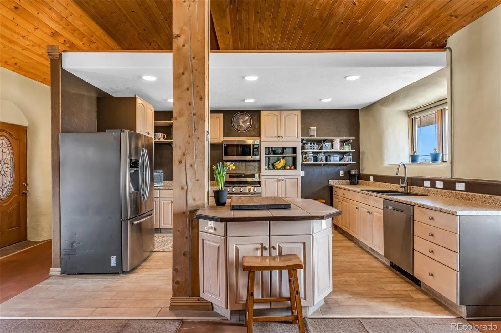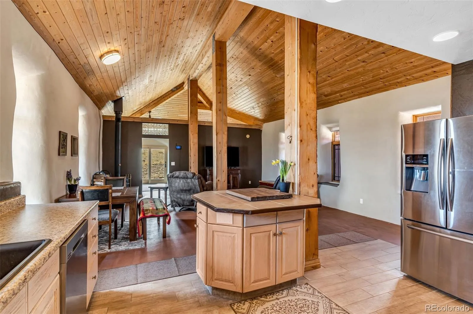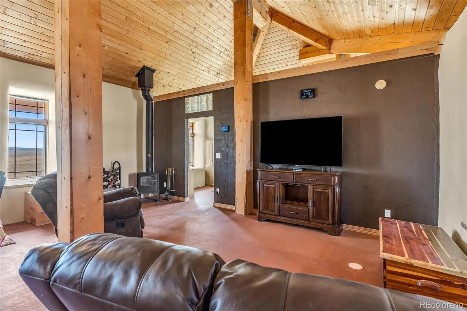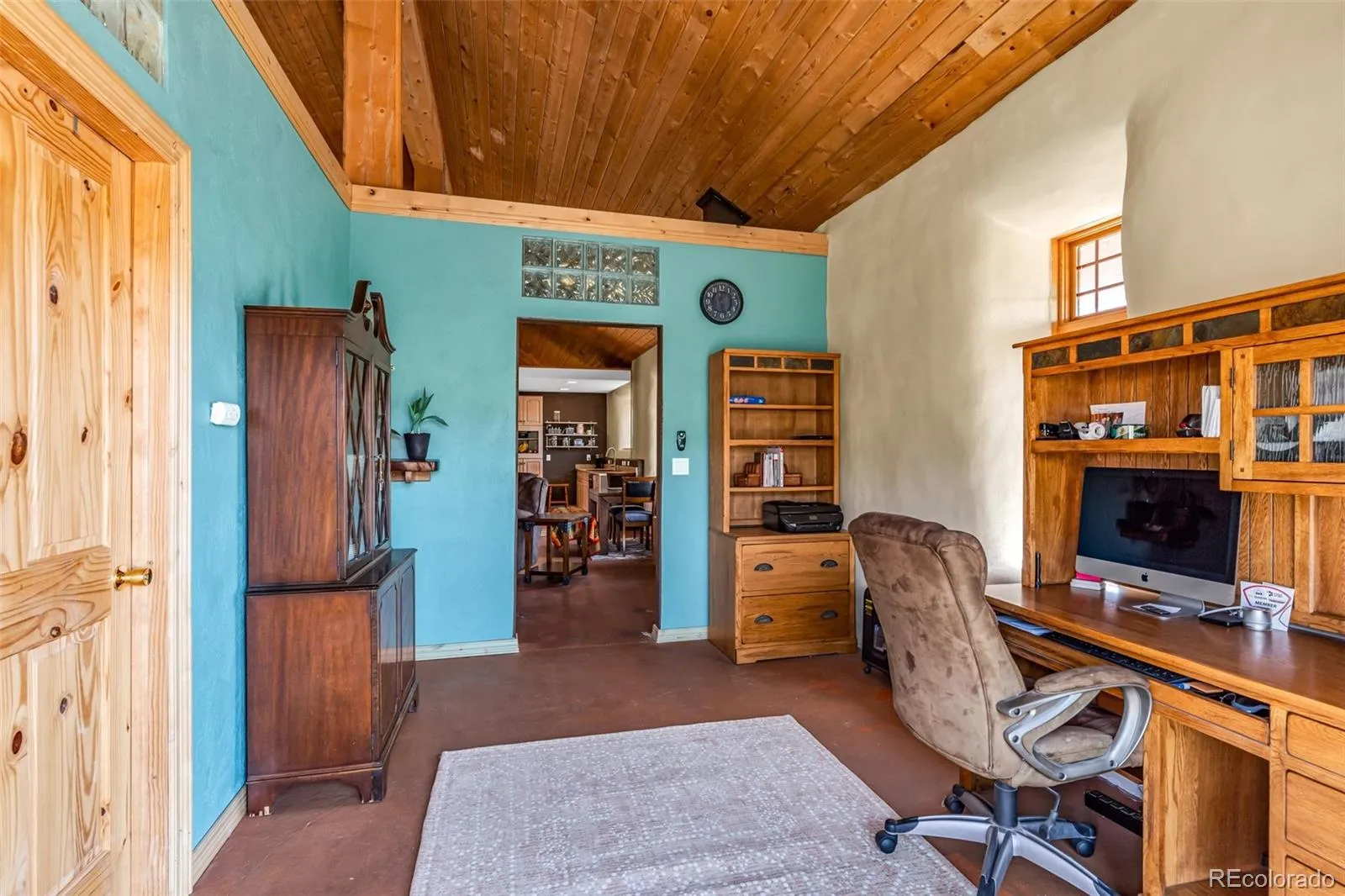 A great location was chosen for this energy-efficient, southwest-style hybrid home. With post & beam construction, hay bale insulation (w/ an R53 insulation factor), & SIP (structural insulated panels (R-17) roofing, earthen plaster interior walls, stucco exterior, concrete floors, in-floor radiant heat, & wood-burning stove, you can plan on reduced utility bills. The center courtyard has brick pavers & latilla fence & provides an excellent spot to soak up the sun & host your BBQs. The one level home has 3 bedrooms, 2 baths, large utility room, bonus/tv/office, great room & kitchen & an attached, heated 2-car garage, plus another detached oversized 2-car garage w/ workshop area. The spacious kitchen w/ cork flooring, has an island w/ seating for 4 & is open to the dining space & great room. This area has tongue& groove vaulted ceilings, 2′ Colorado blue stone window sills, large beams, & a wood-burning stove. The master suite, just off the great room has a library/sitting room with double French doors to the outside, & is a nice spot to take time out to appreciate the phenomenal views. The mountains here are up close & personal w/ great hiking & horseback riding nearby.