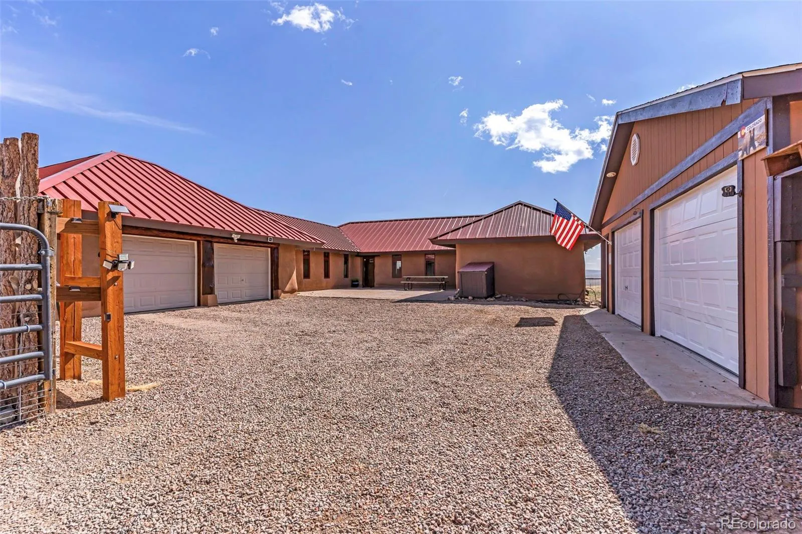 A great location was chosen for this energy-efficient, southwest-style hybrid home. With post & beam construction, hay bale insulation (w/ an R53 insulation factor), & SIP (structural insulated panels (R-17) roofing, earthen plaster interior walls, stucco exterior, concrete floors, in-floor radiant heat, & wood-burning stove, you can plan on reduced utility bills. The center courtyard has brick pavers & latilla fence & provides an excellent spot to soak up the sun & host your BBQs. The one level home has 3 bedrooms, 2 baths, large utility room, bonus/tv/office, great room & kitchen & an attached, heated 2-car garage, plus another detached oversized 2-car garage w/ workshop area. The spacious kitchen w/ cork flooring, has an island w/ seating for 4 & is open to the dining space & great room. This area has tongue& groove vaulted ceilings, 2′ Colorado blue stone window sills, large beams, & a wood-burning stove. The master suite, just off the great room has a library/sitting room with double French doors to the outside, & is a nice spot to take time out to appreciate the phenomenal views. The mountains here are up close & personal w/ great hiking & horseback riding nearby.