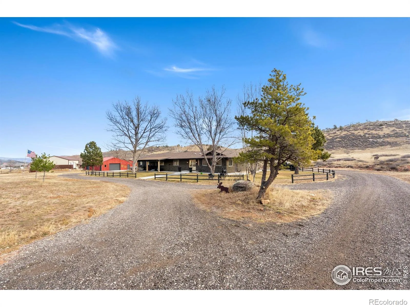Experience luxury & tranquility in this completely renovated by builder/owner, 3,564 sq ft ranch home on 12.5 lush acres /rock outcroppings offering breathtaking views of foothills. Blending sleek sophistication with contemporary elegance, this thoughtfully re-designed home welcomes you w/warmth & new windows that flood the home w/natural light. Stunning stone hearth graces the gas fireplace creating a cozy, inviting atmosphere. Vaulted ceiling is crowned w/beautiful wood & beam ceiling that adds character. Gourmet kitchen is culinary dream, featuring quartz counters that cover oversized island w/breakfast bar, designer tile backsplash, high-end appliances including Forno double oven/microwave, Forno gas range, 2 built-in Forno refrigerators & dishwasher. Wine bar with refrigerator elevates your entertainment possibilities. Butler’s pantry for special kitchenware, quaint 1/2 bath adjacent to laundry room & pantry. Home office offers privacy w/private entrance. Main level primary suite has spa-like bath w/2-person walk-in shower, oversized vanity, washer/dryer & walk-in w/custom built-ins. Basement features theater room, wet bar with wine refrigerator, 2 bedrooms, 3/4 bath & nice sized storage room. Outdoors you can enjoy wildlife and serenity on an oversized patio with a custom pergola enhanced with a hot tub & Al Fresco patio lights for evening BBQs. 2-car attached garage plus ample parking space for your recreational vehicles. Outbuildings include a 2,272 sq. ft. shop w/fully finished entertainment room that includes pool table and tv perfect for watching the game, a tack room/office and a covered loafing shed, additional storage shed, and an oversized loafing shed with concrete apron. Outbuildings are perfectly set up for your large & small animals! 15 mins from the Loveland corridor amenities. Close to the entrance to Big Thompson Canyon along the river leading to Estes Park & Rocky Mountain National Park. No HOA or covenants! Bring your horses! Welcome HOME!