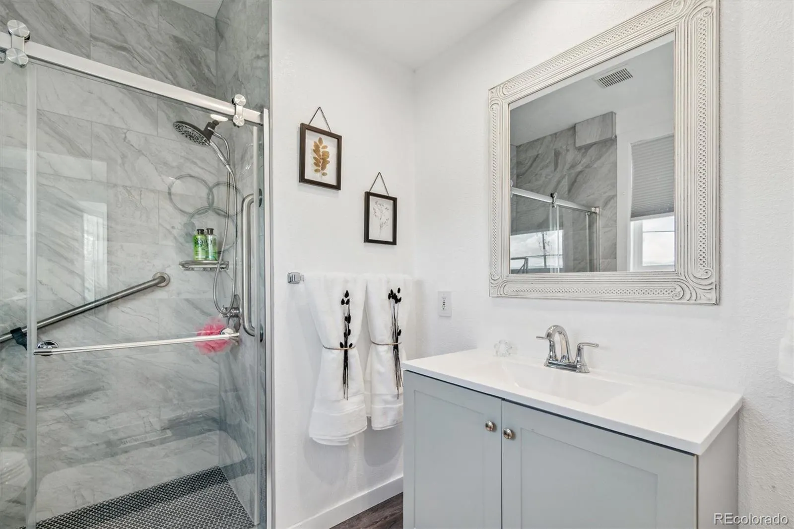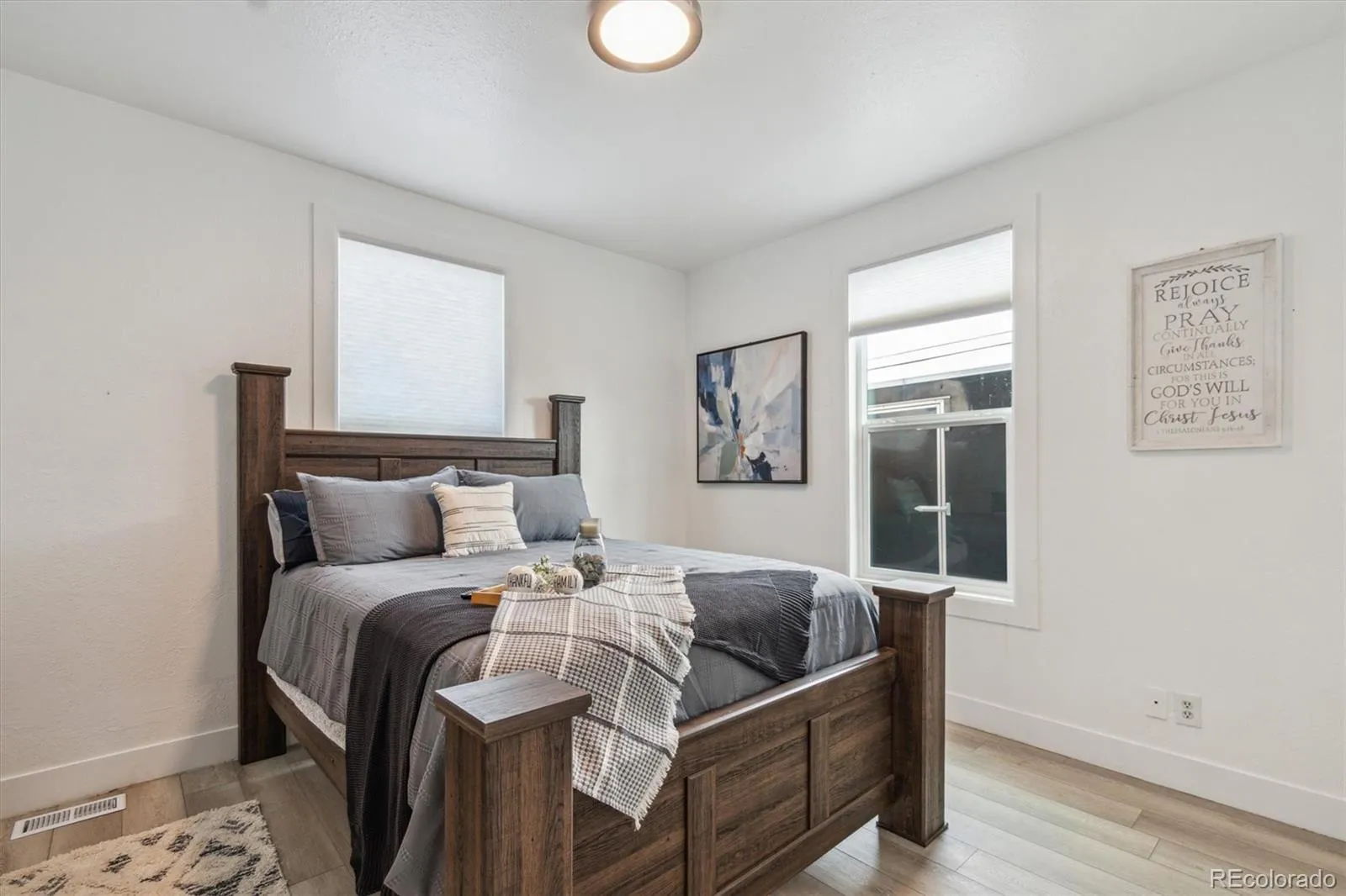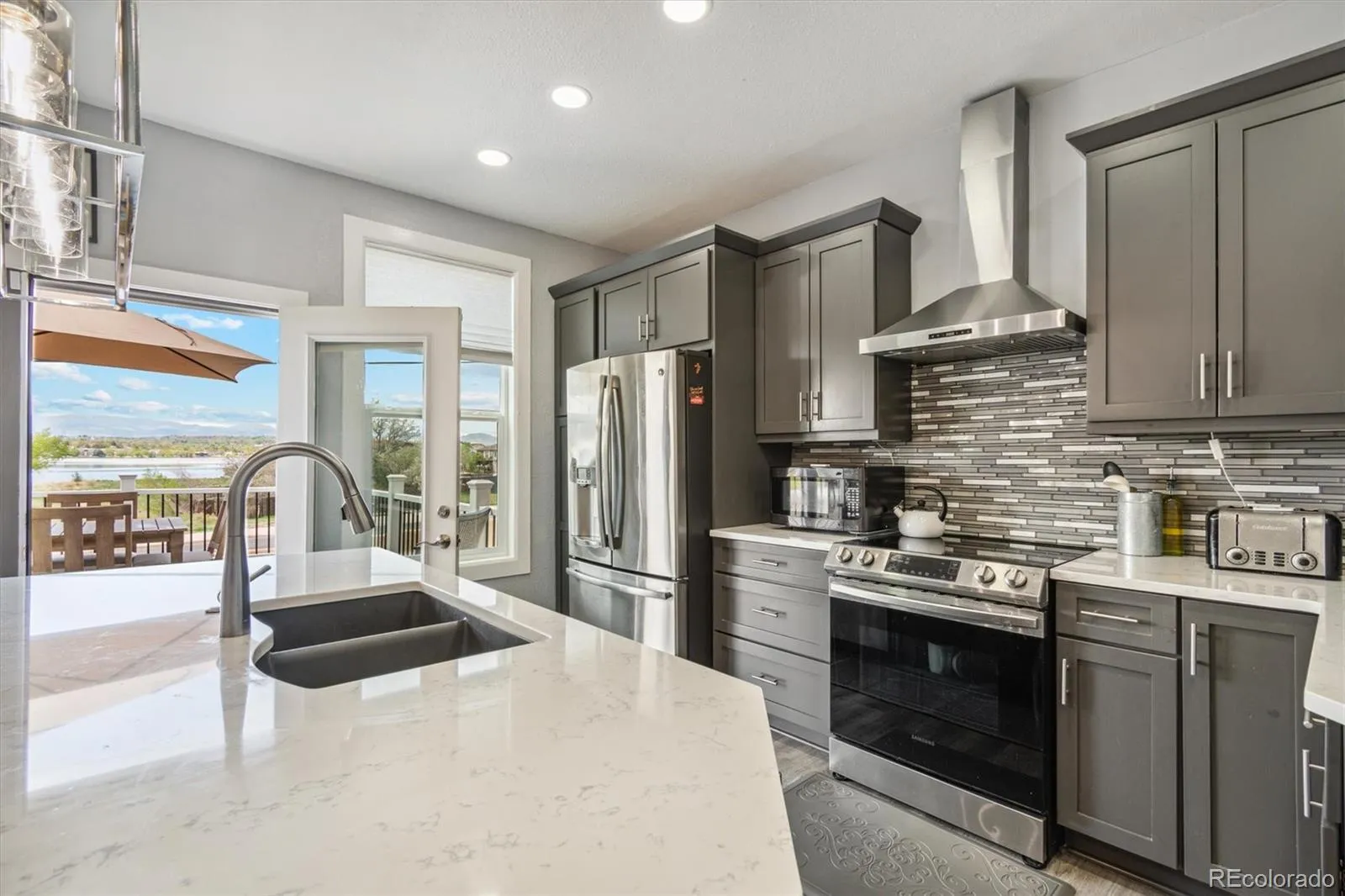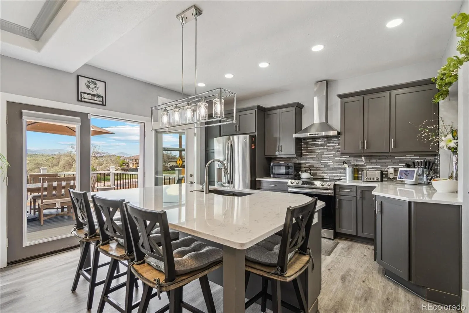 Welcome this beautiful and unique single-family ranch home situated on a corner lot with captivating mountain and lake views and NO HOA’s. The main floor is an open floor plan with custom ceiling finishes in living area, natural lighting, a spacious kitchen with a large quartz island and countertops, tile backsplash and SS appliances, separate dining area, family room, spacious office with it’s own entrance from outside and a partial bathroom, the primary bedroom includes a full bathroom, two additional bedrooms (carpeted), and main bathroom. There is vinyl flooring throughout the main level. The oversized main level deck off of the kitchen with trex decking is perfect for entertaining guests, front porch also has new trex decking. Downstairs includes a large primary bedroom with spacious walk-in closet, full bathroom, large family room and laundry area. Professionally landscaped with front and backyard sprinklers, the back yard is perfect for enjoying your morning coffee and the enclosed yard is great for pets with all around privacy fencing and covered patio with new concrete, a shed for storage. This home has been fully remodeled with finishes including flooring, lighting, blinds, hardware fixtures, new windows, brand new garage door, new cement in driveway and garage that is fully finished, new custom roll gate for privacy. The driveway area can fit up to six cars with additional RV parking with hook-up. This home is close to everything including highways, walking trails, schools, restaurants, dog park, community garden. Minutes to downtown, light rail plus much more!