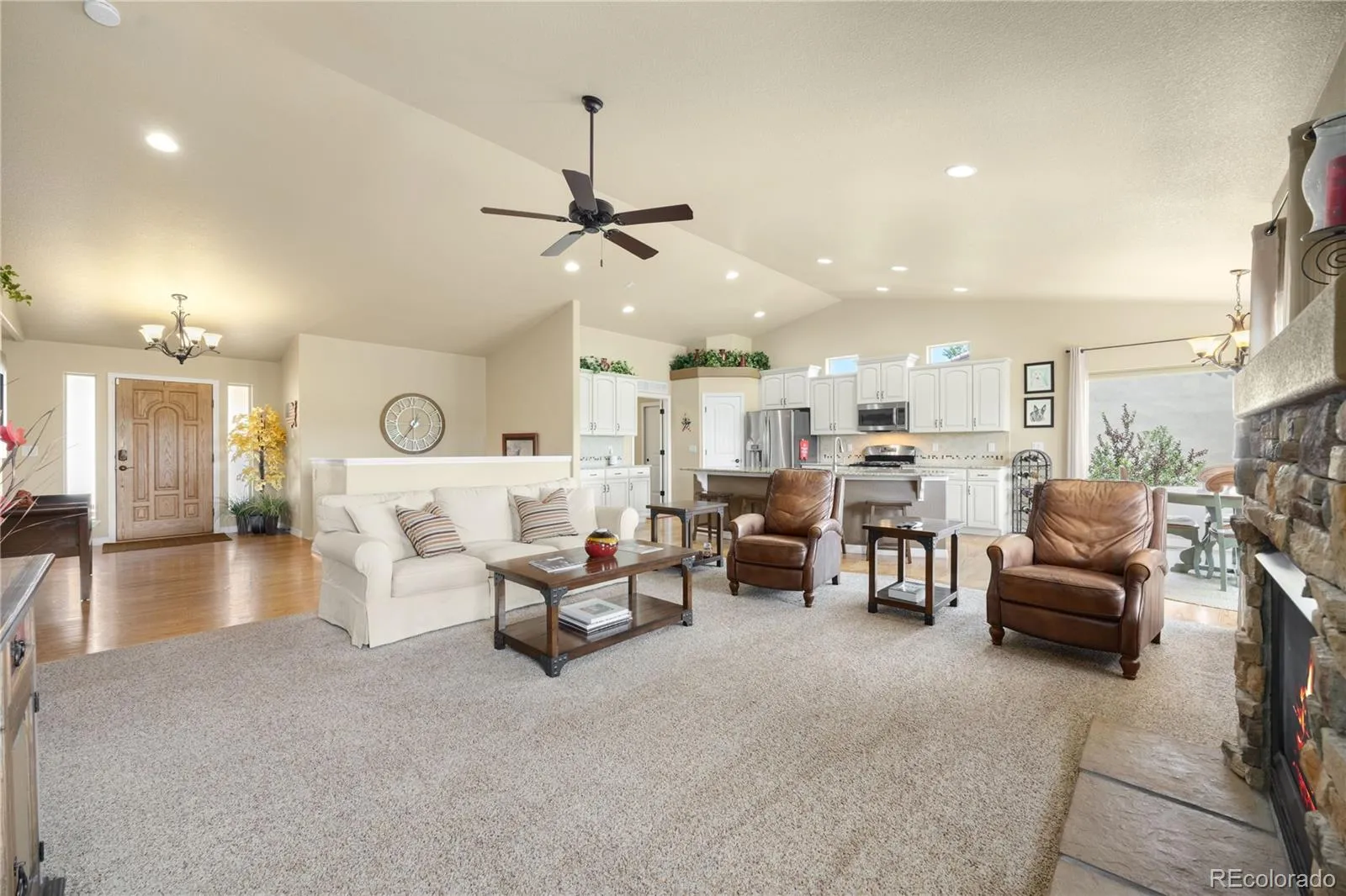 This stunning home offers four bedrooms and three bathrooms with ranch style main level living. The open floor plan leads to a spacious living area with a interior/exterior fireplace and window views to the back yard and the golf course. The kitchen is set perfectly for entertaining small or big crowds with a large island and matching stainless steel appliances and access from the dining area to the large deck with stairs to oversee the backyard and 12th fairway of the golf course. The primary bedroom with golf course views and 5 piece suite with jacuzzi tub are comfortably on the main level with a second bedrooms or office and full bath. Walking down the wide stairs leading to the basement with 9ft ceilings and large family room with wet bar and wine cooler offer a spacious area to entertain, with a walk out to the backyard and several outdoor living areas to relax or entertain. This home is west facing which is great for snow melt and sunsets in the backyard with the deer and the firework display from the club house make this a great home to entertain family and friends. This home was painted in June of 2025. The garage was customized with the builder by the owner to include an additional 2ft of length. The neighborhood offers top tier community amenities, and access to award winning D-20 schools, fine dining, shopping and with the The Club at Flying Horse in view from your backyard this home offers the perfect blend of golf oasis and location. Don’t miss this rare and exceptional opportunity, schedule your showing today!