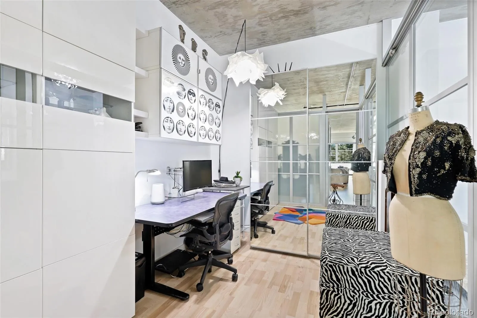 Rare large urban loft with exposed concrete ceilings. This is the only stack of large lofts at the Peloton. Thoughtfully remodeled to feature one spacious master plus a versatile second bedroom/office. Both bedrooms are enclosed with metal-framed glass walls and allow optional privacy curtains. This trendy unit is perfect for someone seeking flexibility. Tucked in one of the community’s most peaceful locations, this east-north corner unit is surrounded by tall trees, morning light, and a peek of the Flatirons—without the noise or exposure of units facing Arapahoe or the courtyard. Originally designed as a developer’s model, the loft blends sleek industrial aesthetics with warm, curated finishes and hardwood floors, creating a unique sense of style. The open living/dining layout flows beautifully to an Acacia wood-tiled balcony, a serene retreat among the trees. Four of five windows face away from other units, enhancing privacy—an uncommon feature in the Peloton. This desirable and rarely available location sets the home apart. Modern upgrades include a smart thermostat and Ring Peephole Video Doorbell. Two reserved underground parking spaces sit near the main elevator, with access to four EV charging stations. Peloton residents enjoy true resort-style amenities: a rooftop pool, concierge, two spas, state-of-the-art gym, private theatre, dog park, and lively community calendar of events and clubs. Dining options include Michelin-recognized Basta, Naked Lunch, Mothers Greek Food, and Dry Storage. The surrounding walkable neighborhood features Boulder Creek and 29th Street Mall. With the Sundance Film Festival relocating to Boulder in 2027, this address will only grow more coveted. A rare blend of privacy, style, and setting—this loft truly stands apart.