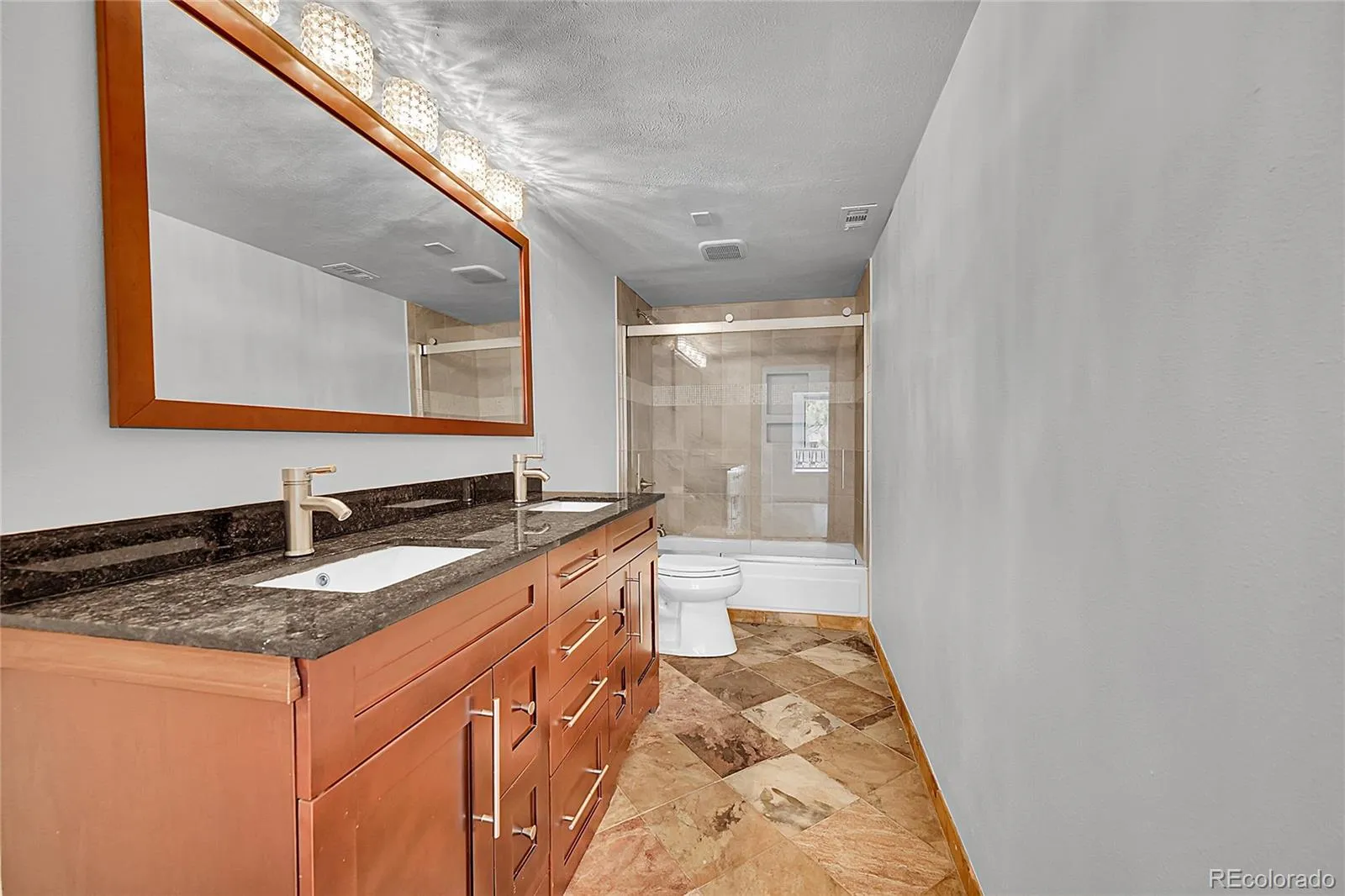 The primary suite boasts extensive closet space and a full ensuite bath with double sinks and a tub/shower combo. Two additional bedrooms with large windows provide flexibility for guests, office space, or hobbies, complemented by a second full bath.