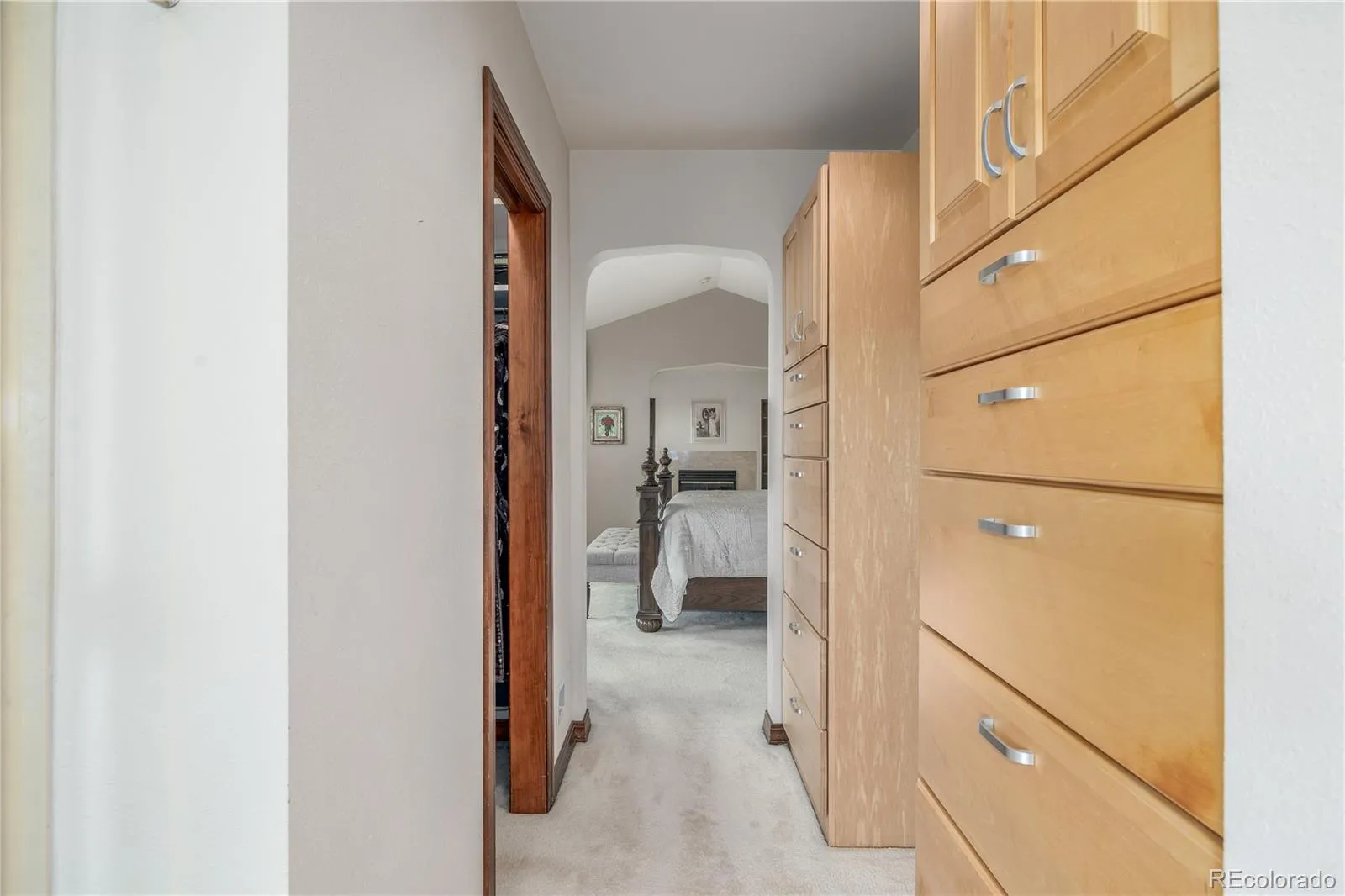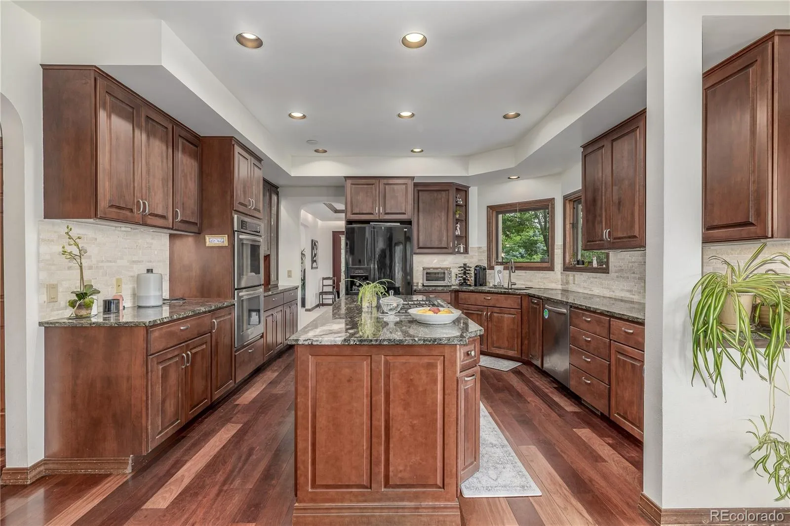 The heart of the home is the large island kitchen, a chef’s delight with granite counters, double ovens, a gas cooktop, soft-close cherry cabinets, and a new stainless steel refrigerator. The adjoining great room is a welcoming space with built-in bookshelves, a cozy gas fireplace with a marble hearth, and surround sound. From here, step out onto the large covered deck, complete with ceiling fans, to savor the panoramic vistas.