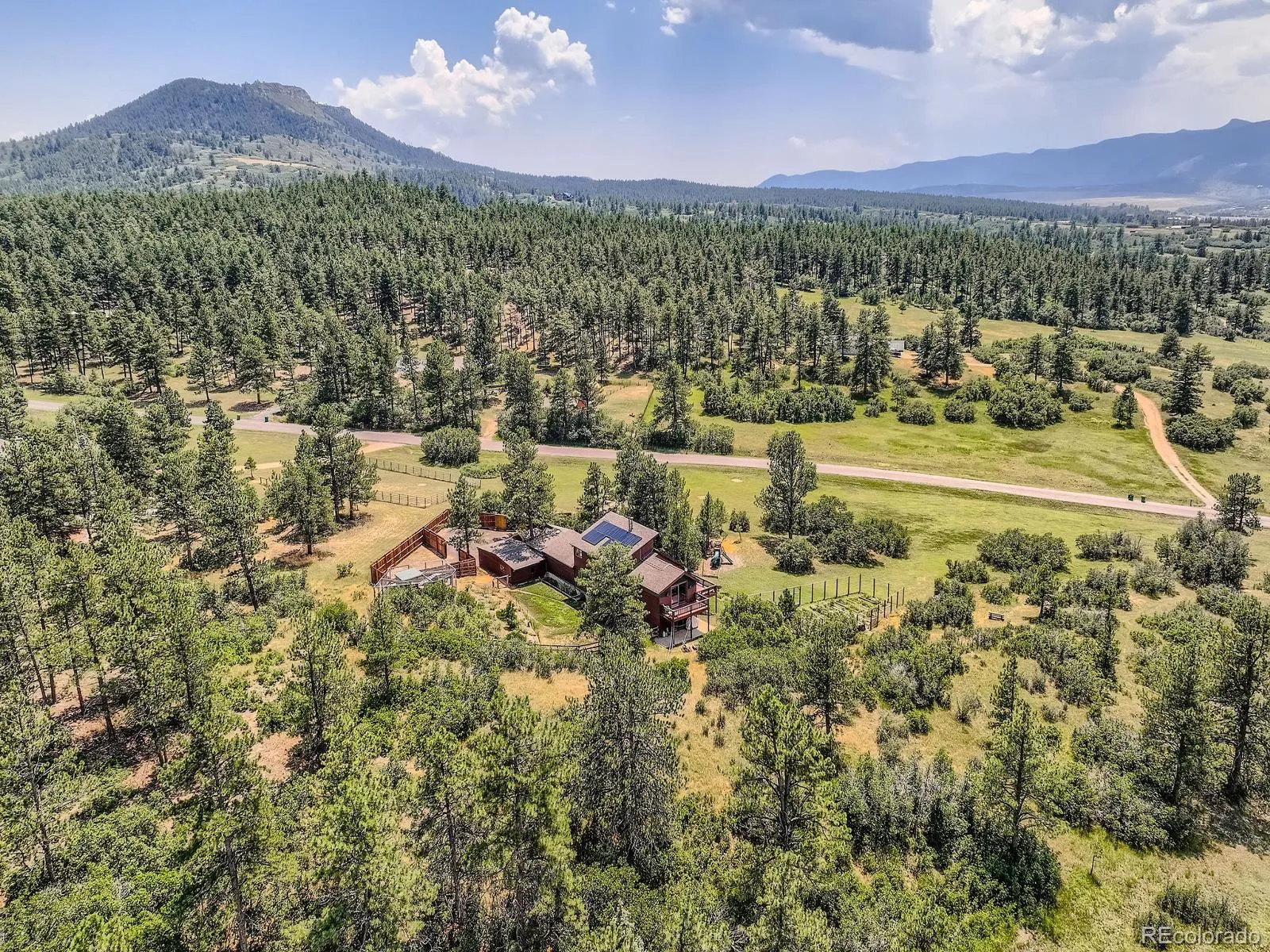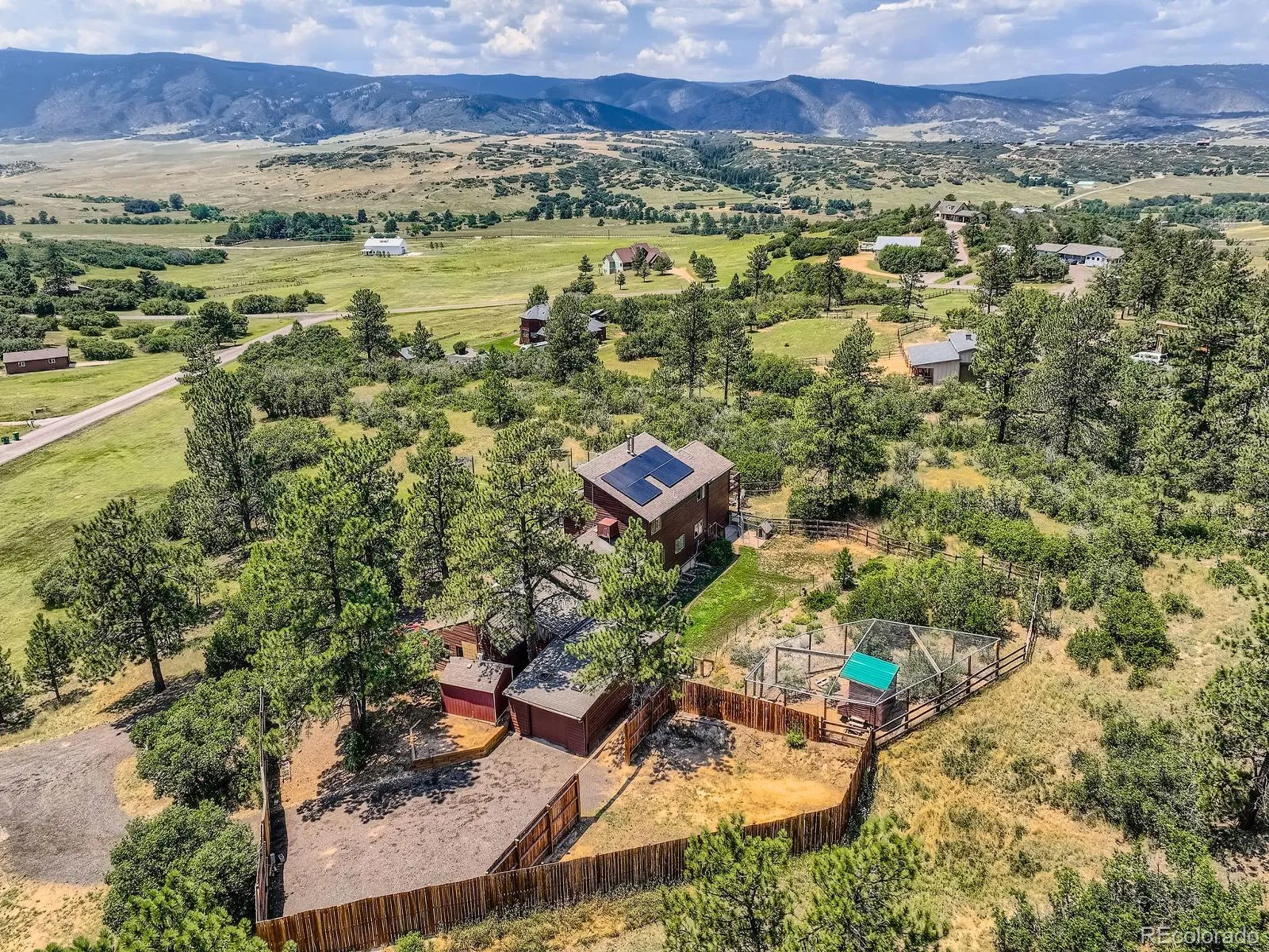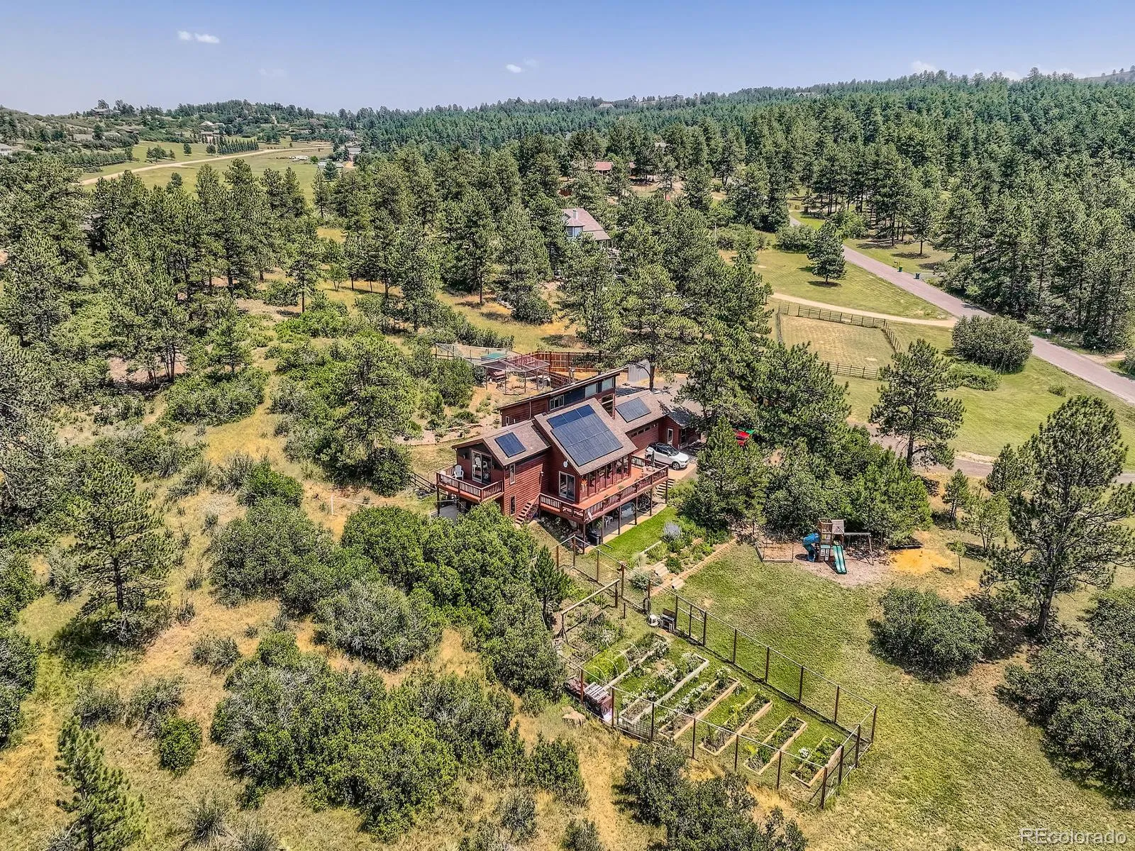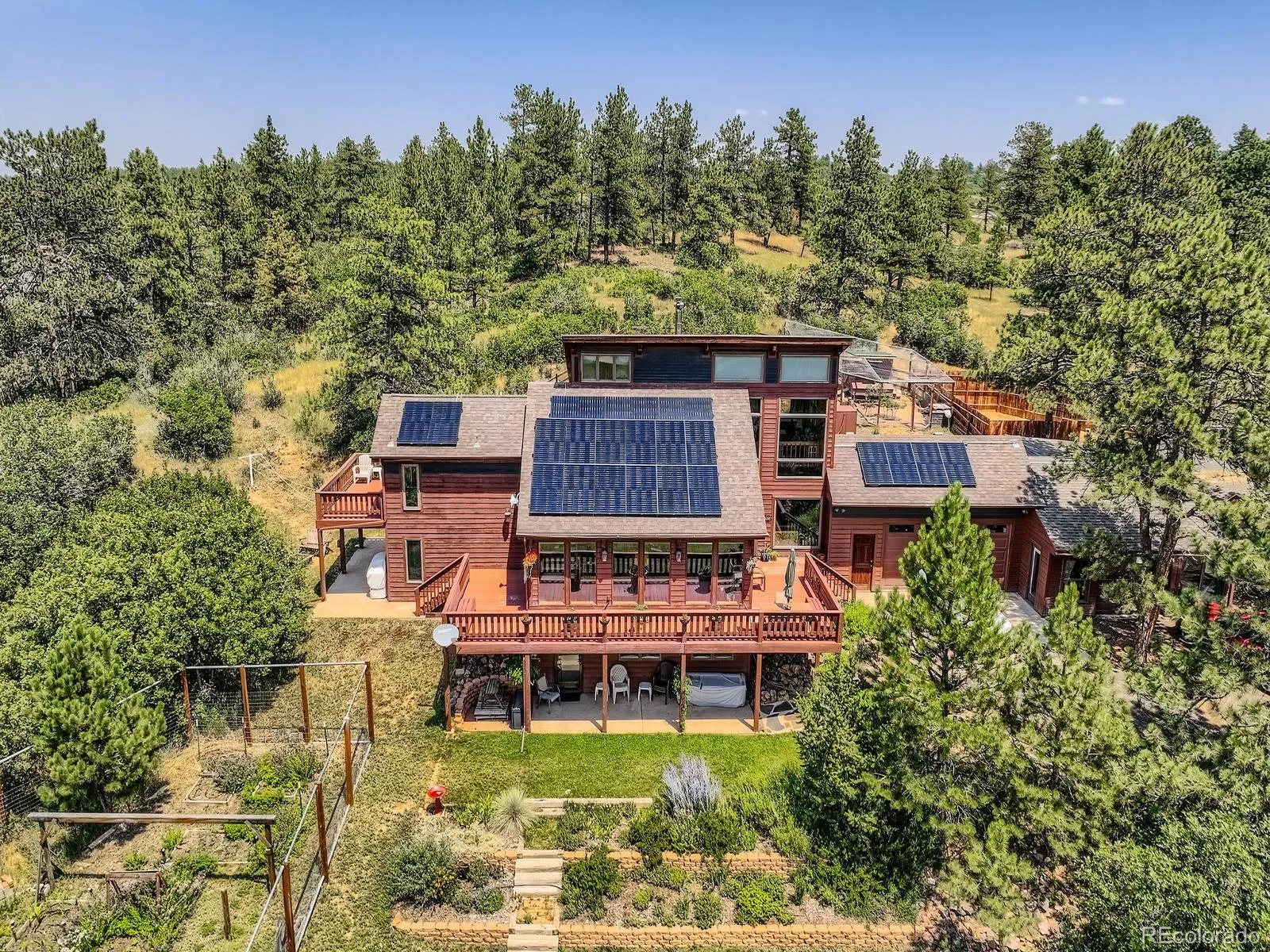 Experience the beauty of Colorado living at its finest with this unique custom mountain home, just 20 minutes from Castle Rock. Nestled on 5.3 acres, this multi-level home features 4 bedrooms, a loft, and 4 bathrooms. The open floor plan invites you into the great room, where breathtaking mountain and valley views await, complemented by a two-story stone wood fireplace and charming tongue-and-groove pine accents. The updated kitchen boasts a large granite island, double ovens, and slab granite counters. Adjacent is a spacious dining room with a convenient pass-through to the kitchen. Unwind in the primary suite, complete with a private deck perfect for morning coffee or yoga. Additional highlights include two secondary bedrooms, a versatile loft space – perfect for office or library, and a finished walk-out basement with a family room, bedroom, kitchenette, and ¾ bath. Enjoy the outdoors with fenced areas for pets, gardens, and a chicken coop which includes the chickens. An attached two-car garage and a 1085 square foot multi-use addition provide ample space for all your needs. Plus, benefit from a $70,000 solar system fully paid by the seller at closing.