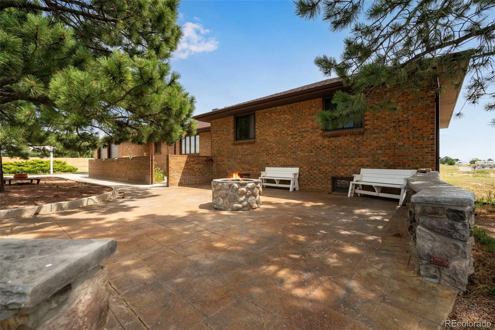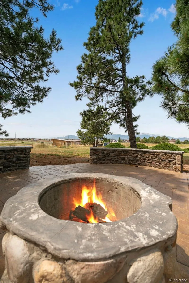 Large yard features Horse stalls, corral, courtyard, stamped concrete patio with a firepit.