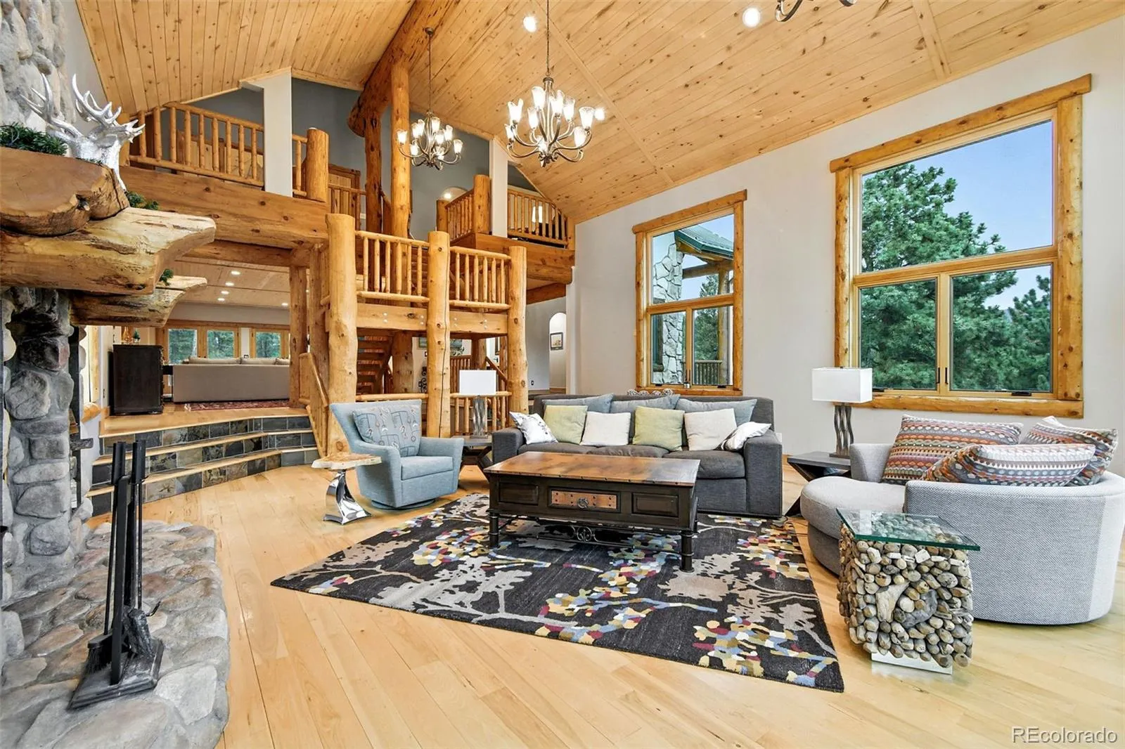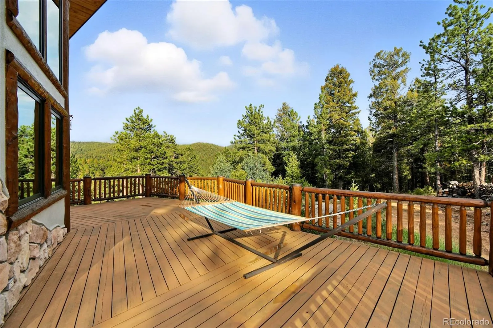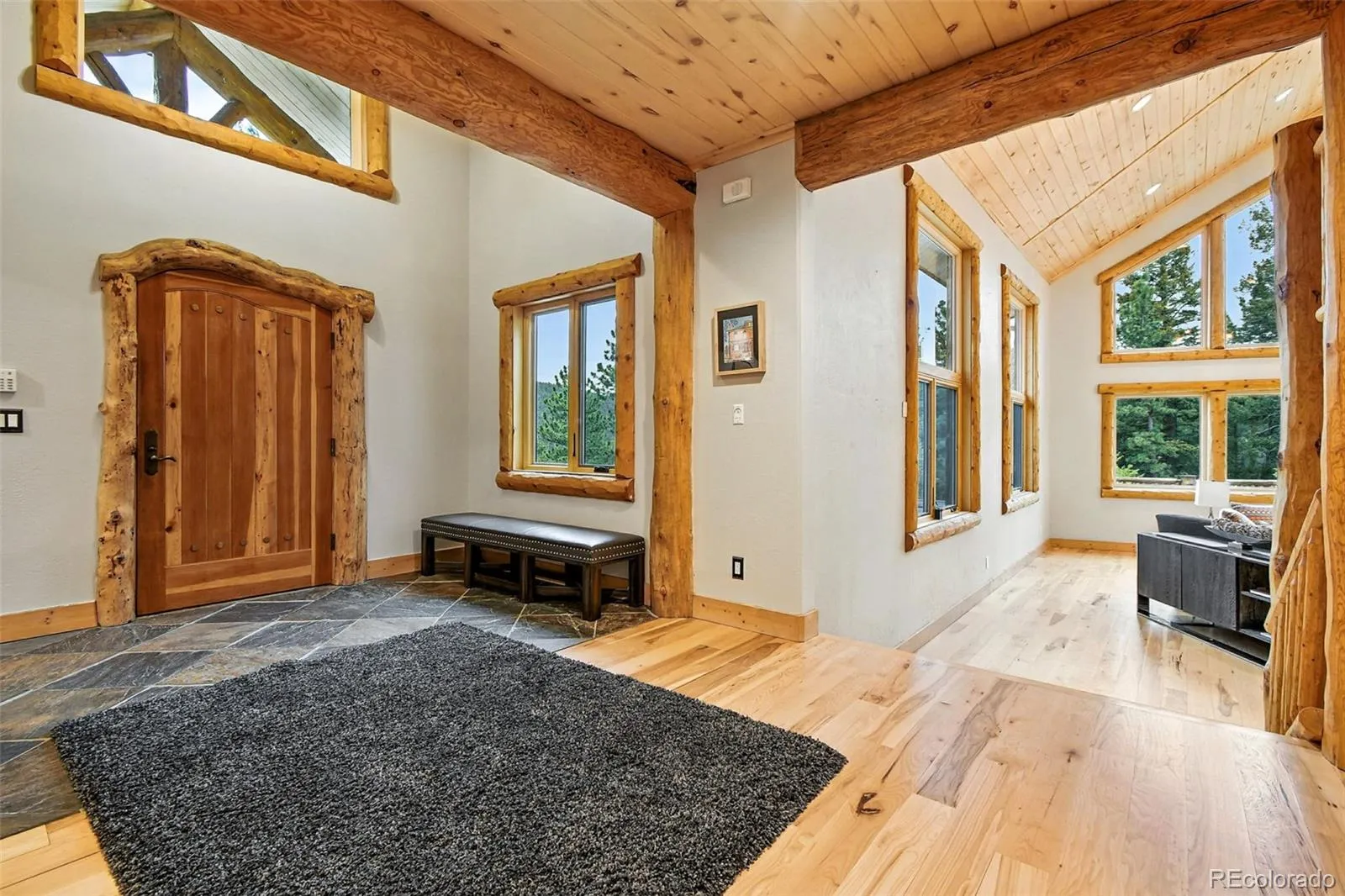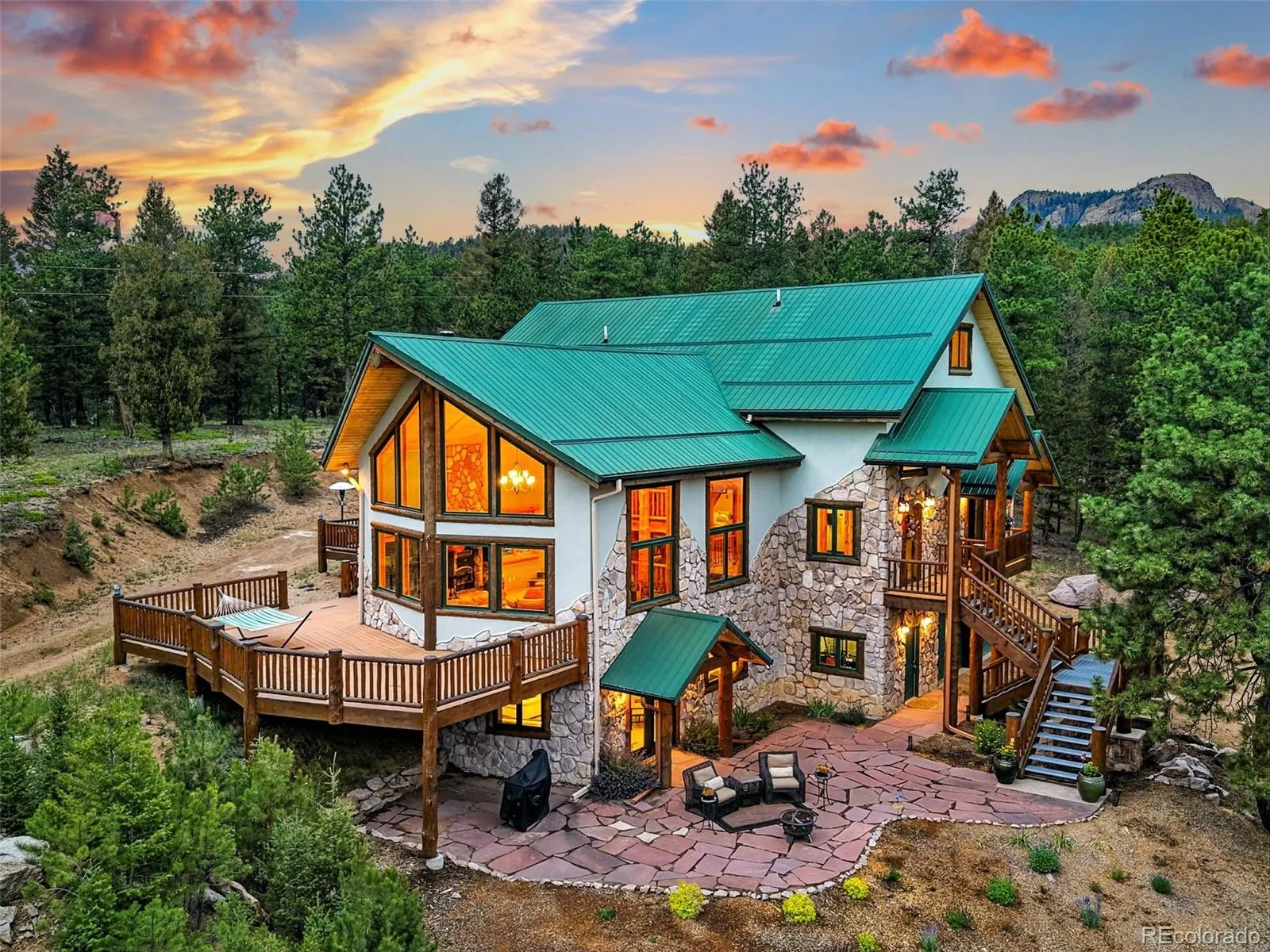 Live the Colorado dream in this stunning mountain retreat featuring rich log accents, custom wood trim, and a wall of windows that fills the vaulted living room with natural light. Cozy up by the moss rock fireplace or cook in the well-appointed kitchen with birch cabinets and granite countertops. Hickory floors, slate tile, and in-floor radiant heat add warmth and style. The spacious primary suite offers a luxurious five-piece bath with custom lead glass windows that offer a spectrum of colors to fill your soaking tub and a private 2,400 sf redwood deck for serene mountain views. This is a treed lot that was home to a horse family in the past and has the old stable to refinish or make into a diva den or sweat box sauna. The lower level has plenty of storage, a home gym, and space for a home theatre.