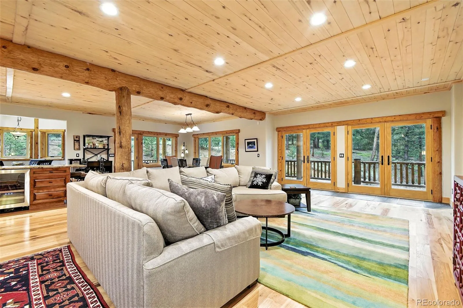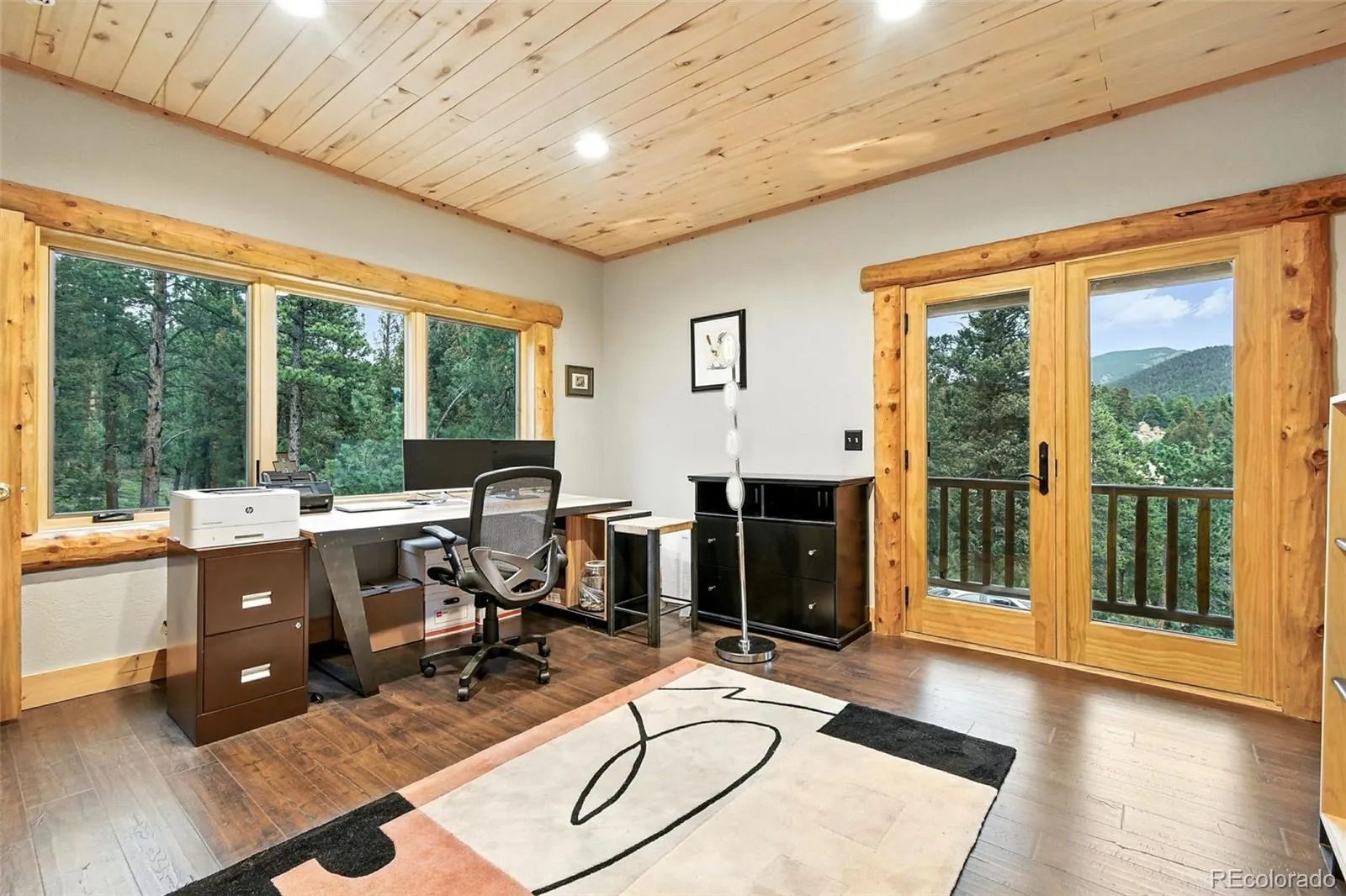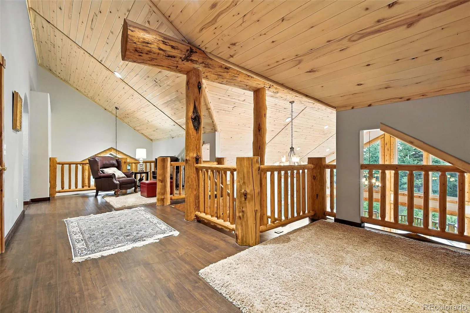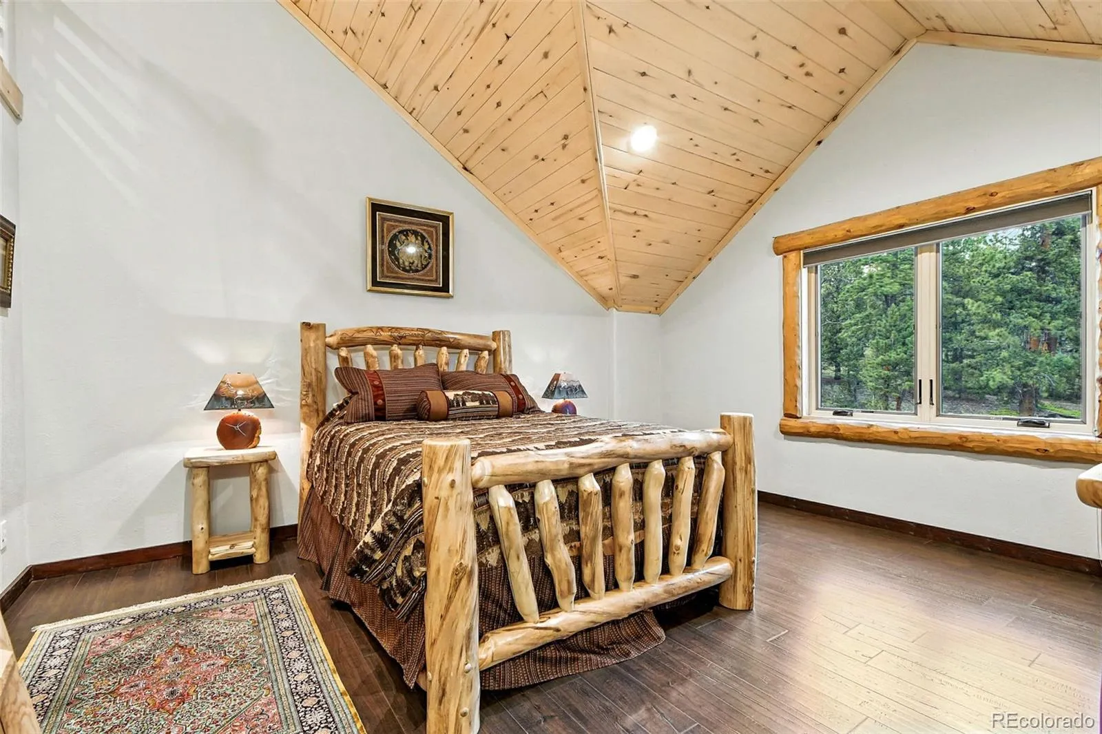 Live the Colorado dream in this stunning mountain retreat featuring rich log accents, custom wood trim, and a wall of windows that fills the vaulted living room with natural light. Cozy up by the moss rock fireplace or cook in the well-appointed kitchen with birch cabinets and granite countertops. Hickory floors, slate tile, and in-floor radiant heat add warmth and style. The spacious primary suite offers a luxurious five-piece bath with custom lead glass windows that offer a spectrum of colors to fill your soaking tub and a private 2,400 sf redwood deck for serene mountain views. This is a treed lot that was home to a horse family in the past and has the old stable to refinish or make into a diva den or sweat box sauna. The lower level has plenty of storage, a home gym, and space for a home theatre.