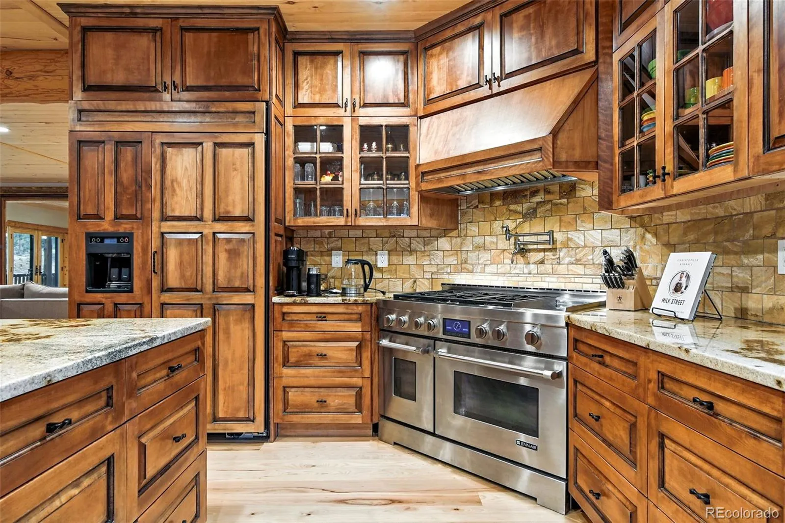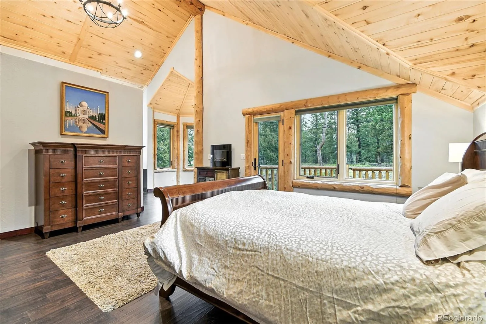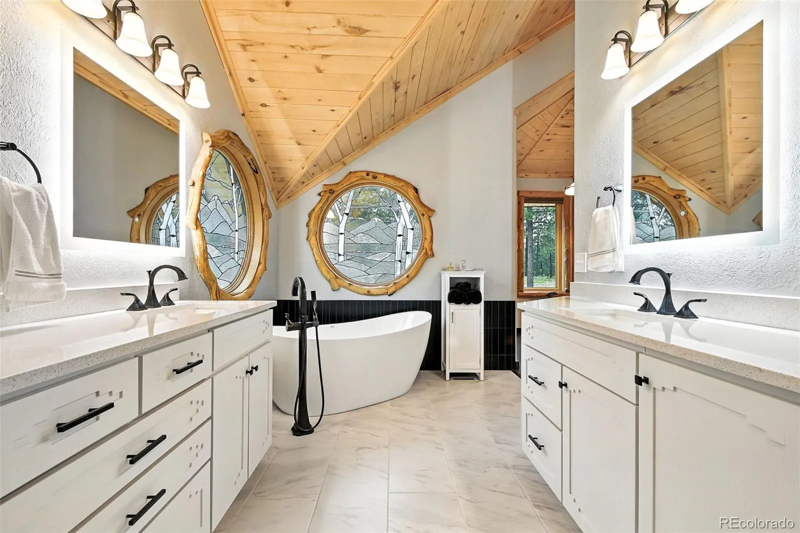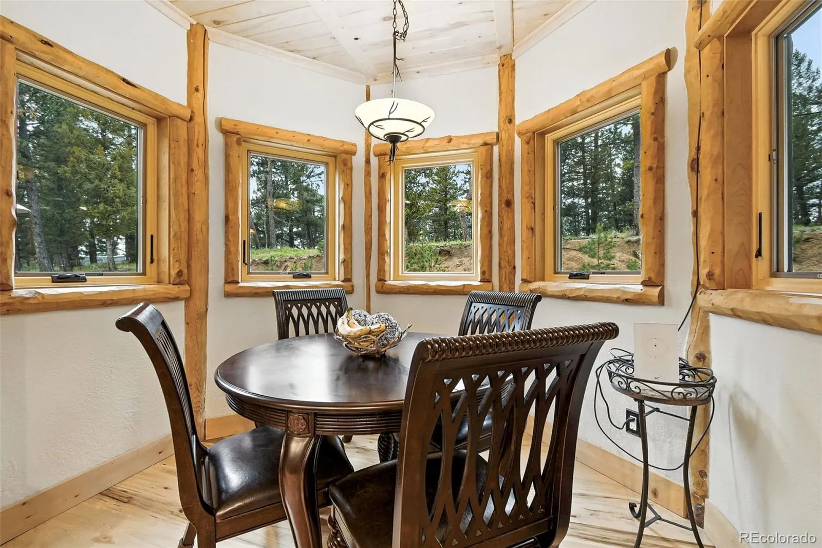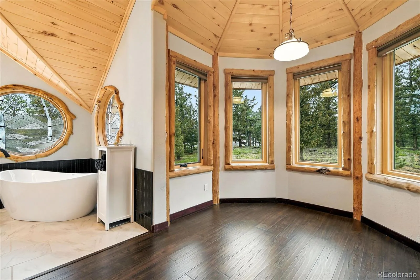 Live the Colorado dream in this stunning mountain retreat featuring rich log accents, custom wood trim, and a wall of windows that fills the vaulted living room with natural light. Cozy up by the moss rock fireplace or cook in the well-appointed kitchen with birch cabinets and granite countertops. Hickory floors, slate tile, and in-floor radiant heat add warmth and style. The spacious primary suite offers a luxurious five-piece bath with custom lead glass windows that offer a spectrum of colors to fill your soaking tub and a private 2,400 sf redwood deck for serene mountain views. This is a treed lot that was home to a horse family in the past and has the old stable to refinish or make into a diva den or sweat box sauna. The lower level has plenty of storage, a home gym, and space for a home theatre.