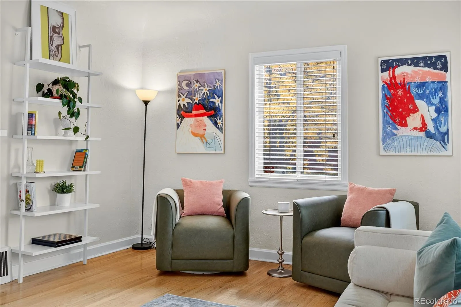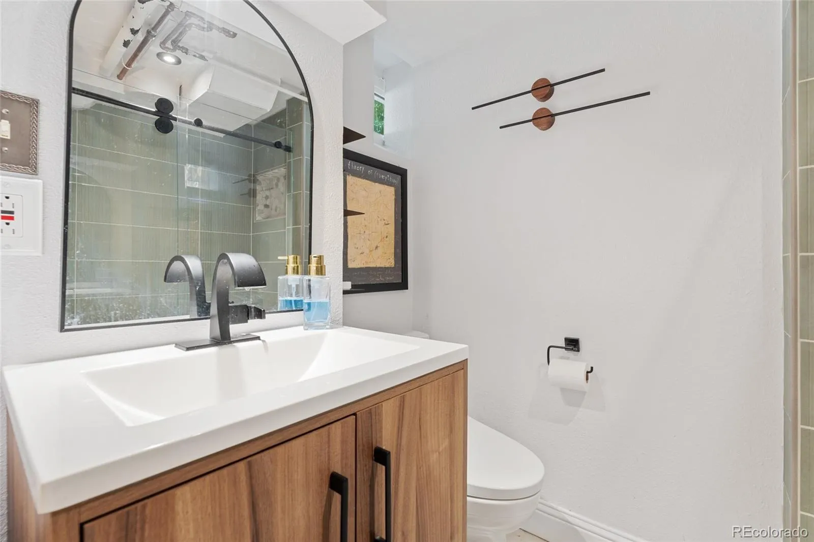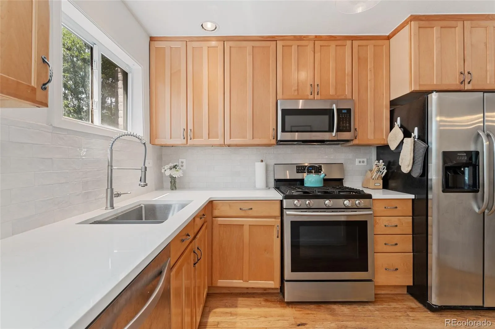 Welcome to this cozy brick ranch home on a spacious corner lot in the highly sought-after Mayfair community, featuring three bedrooms plus a large office that can serve as a fourth bedroom. Fabulous location to be a successful mid-term rental (MTR) through sites such as Airbnb, VRBO, and Furnished Finder. High walk score to a variety of trendy restaurants, Starbucks, King Soopers & Sprouts groceries, and close proximity to Rose Medical Center, medical facilities & office, City Park, and The Denver Zoo! Brand new furnace and kitchen countertops in 2025 and new windows in 2024! Full of charm and character, this 1930s gem has been beautifully updated while retaining its original warmth, offering incredible natural light throughout. Arched openings, cove ceilings, and oak hardwood floors add timeless elegance, while the bright and cheerful chef’s kitchen impresses with stylish finishes, shaker cabinets, stainless appliances with gas range, quartz countertops, subway tile backsplash, and two garden windows above classic glass blocks. A separate dining room creates the perfect space for gatherings. The main level offers two sunny bedrooms. The finished basement expands your living space with a large family room featuring a wet bar and fireplace, a bedroom with a private en-suite bath, a second basement level bedroom or office, generous closet space, and a laundry room. The fully fenced backyard is both peaceful and private, with plenty of room to entertain or simply unwind. Additional recent updates include new basement floors (2022), a remodeled basement bath (2024), new water heater (2025).
