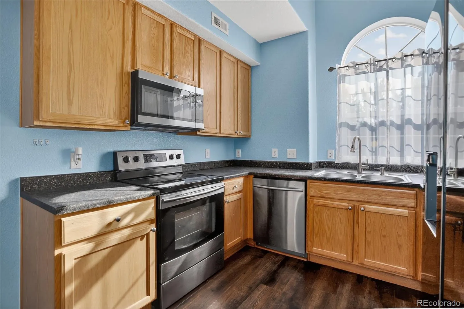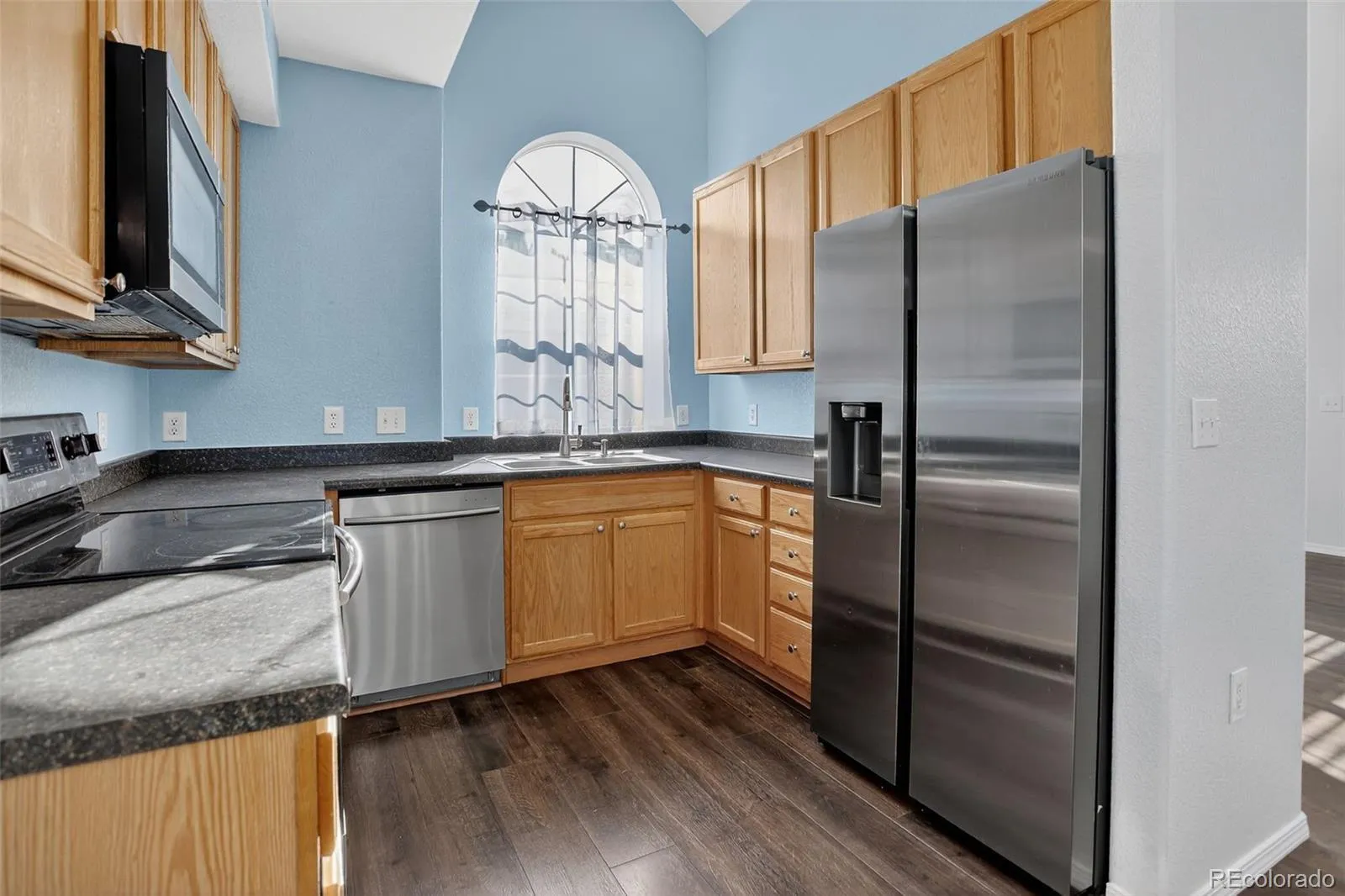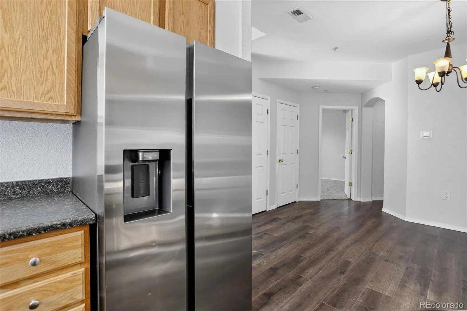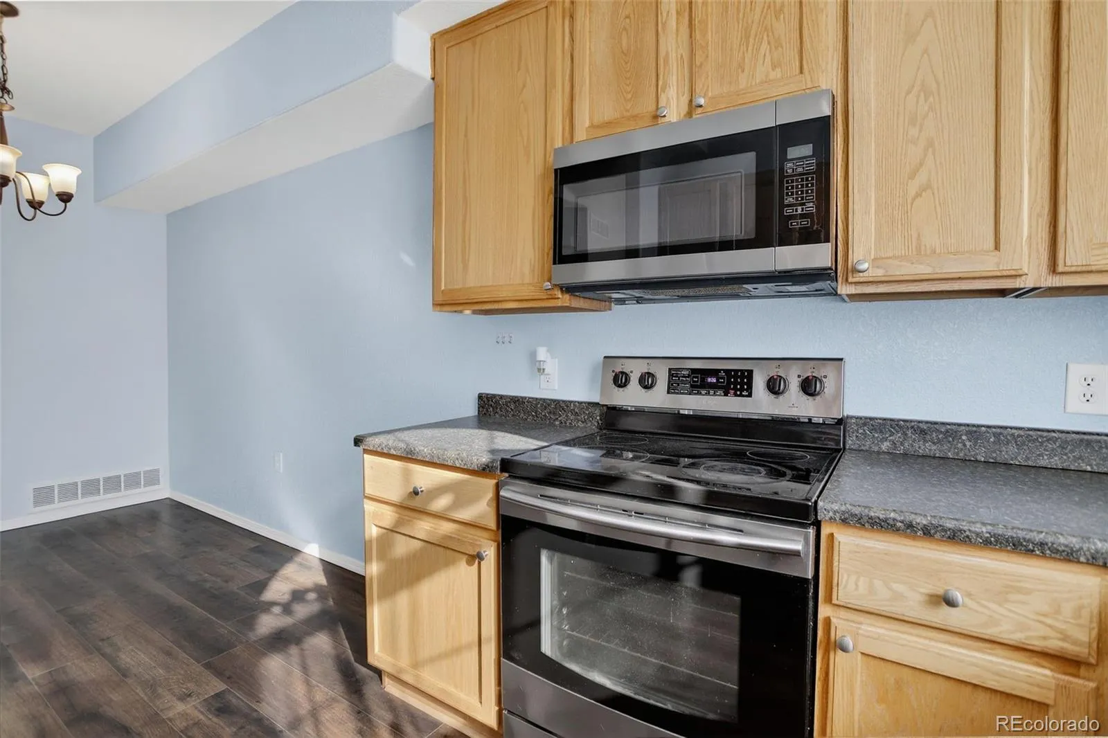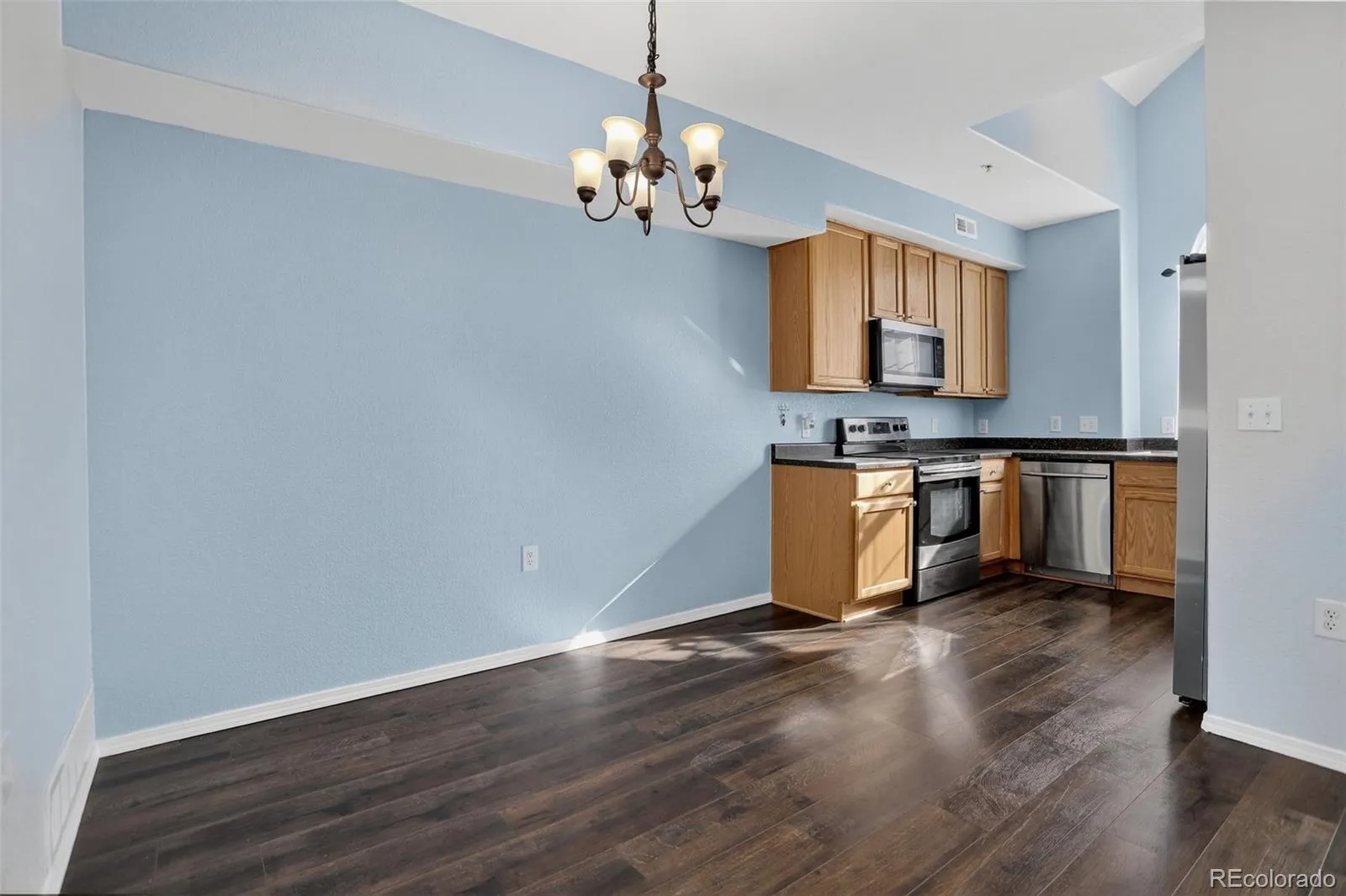 The open-concept kitchen offers generous counter space, stainless steel appliances, and laminate flooring that flows seamlessly into the dining area. Upstairs, the private primary suite includes an open loft design, creating a flexible space ideal for a home office, reading nook, or creative retreat.