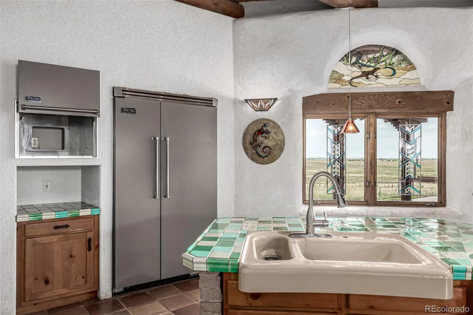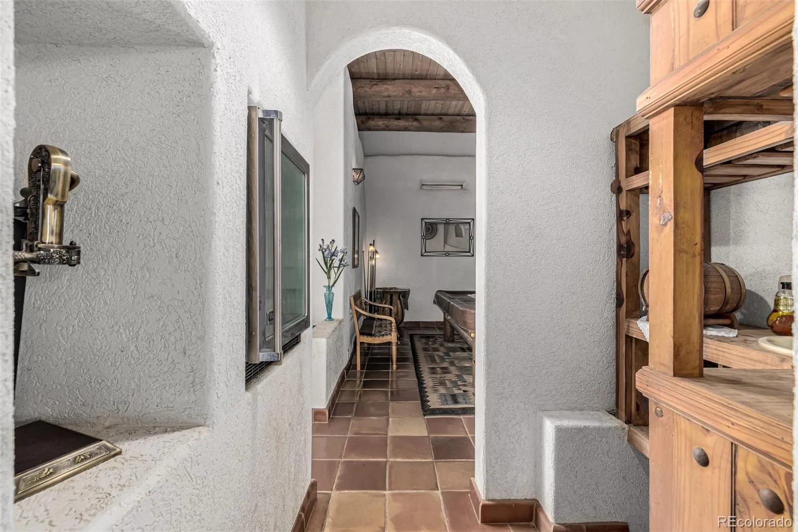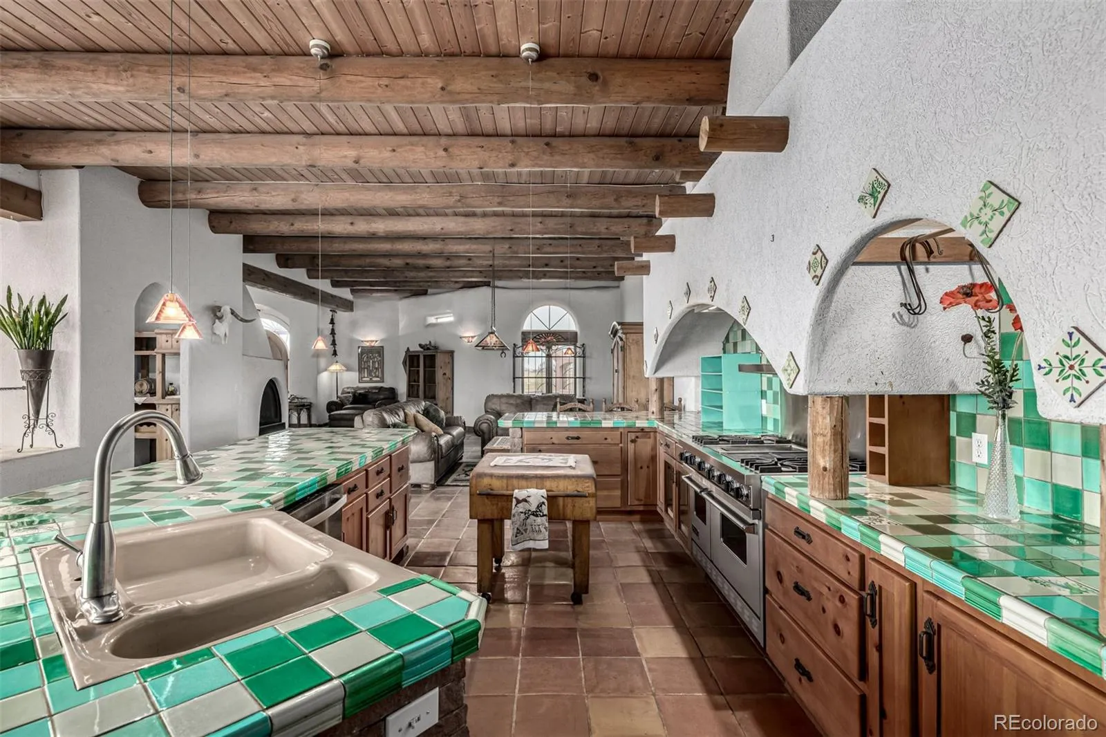 Step inside to find hand-carved wood doors, imported Mexican Terrazzo tiles, authentic vigas beams, stained glass windows, and kiva fireplaces—all woven into three bedrooms and two elegant baths. A detached six-car garage and workshop with oversized aprons includes an additional half bath, perfect for ranch hands.