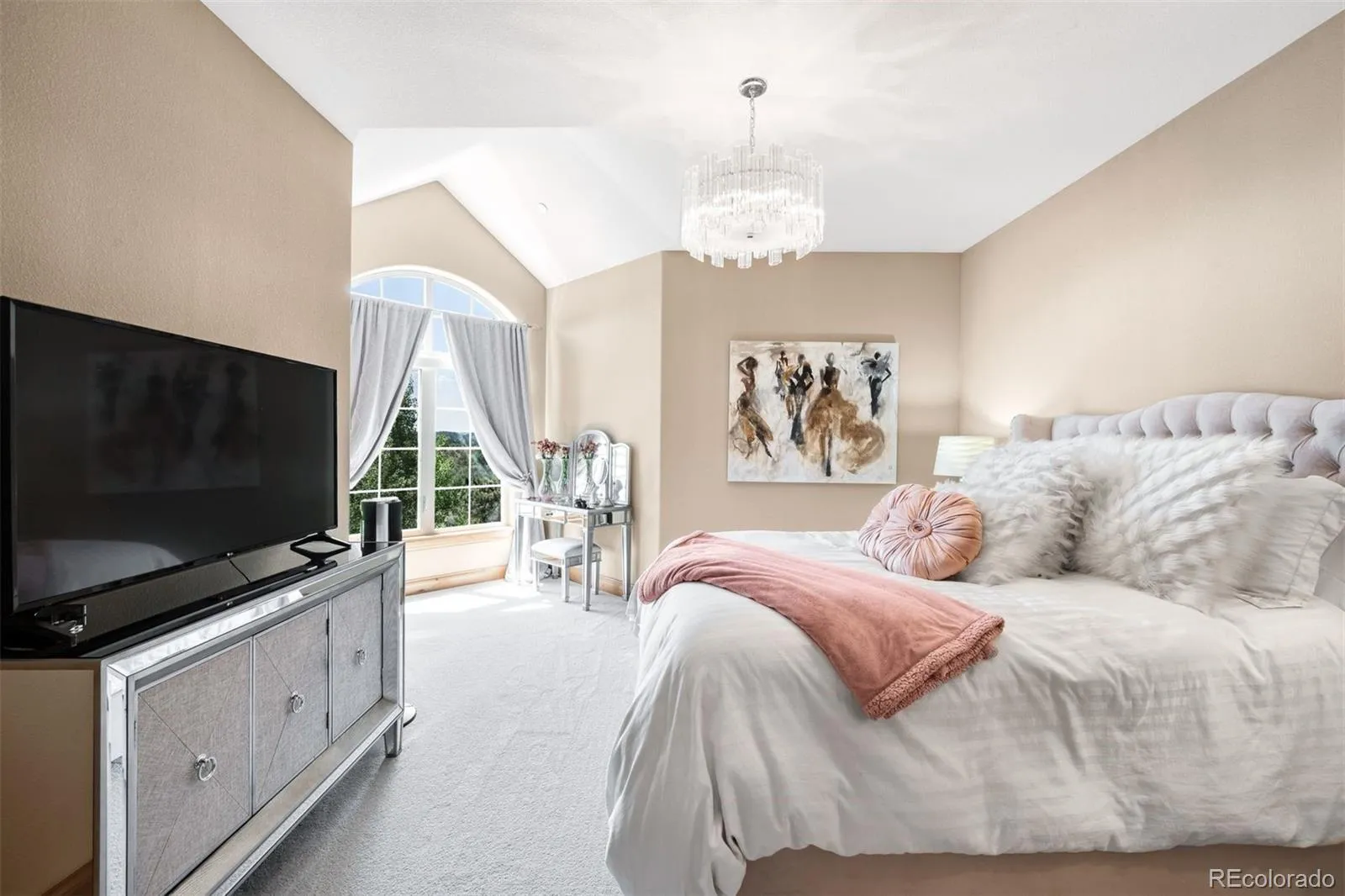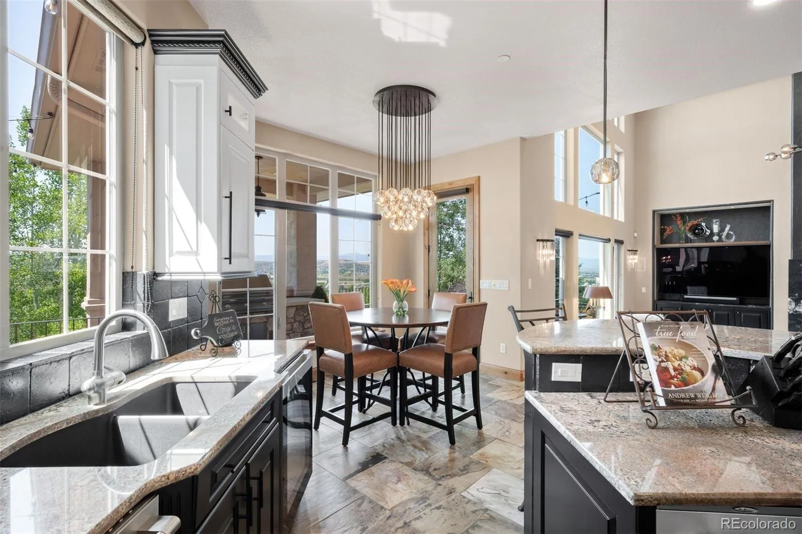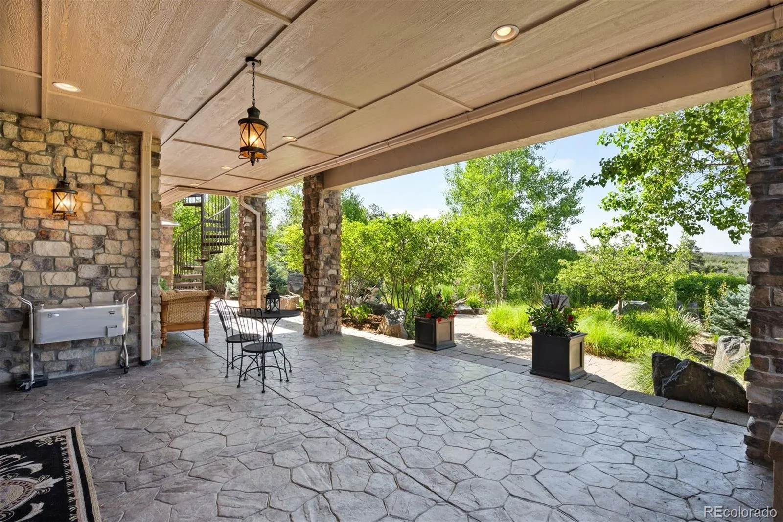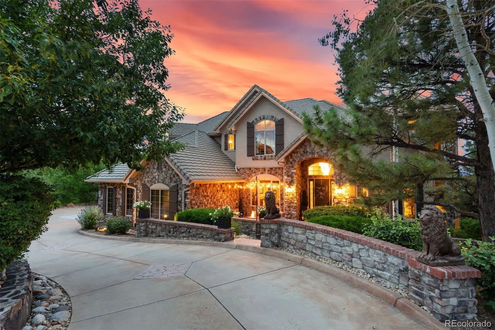 Luxury, views, and privacy define this extraordinary 5 bed, 7 bath estate in prestigious Pinon Soleil. Situated on a professionally landscaped 1-acre cul-de-sac lot, this custom home offers over 8,200 finished square feet of upgraded elegance with unobstructed views of Castle Rock, Pikes Peak, and the Front Range. Recent renovations include new lighting (interior/exterior), carpet, refinished hardwood floors, paint, steam shower, Monogram kitchen appliances, A/C, AV systems, and much more. Main level features vaulted and coffered ceilings, custom-designed lighting (including a stunning 3-story hand-crafted Italian chandelier designed by the homeowner), and a reimagined chef’s kitchen with GE Monogram appliances, large prep island with sink, display cabinets, and butler’s pantry. A 2-sided leathered granite fireplace connects the living room and office. The main-floor primary suite includes a fireplace, blackout blinds, custom closet, private terrace with mountain views, and spiral stairs to a home gym. Upstairs are 3 ensuite bedrooms with walk-in closets and a loft. The finished walk-out basement includes a rec room with stone fireplace, wet bar, wine cellar, guest suite, and a state-of-the-art home theater. Outdoors, enjoy multiple patios, a built-in grill, meditation garden, waterfalls, and a meandering creek. What’s special about this home: private grounds with meandering creek, waterfalls, and firepits. Also of note, the leathered granite fireplace surrounds, custom lighting, upgraded kitchen cabinets, appliances and storage solutions (including a pass-through butler’s pantry and lighted display cabinets.) Additional highlights: 4-car epoxy-coated garage with custom storage, smart organization, irrigation system, landscape lighting, and mature trees. Minutes to downtown Castle Rock, I-25, shopping, and trails—yet feels like a world away.