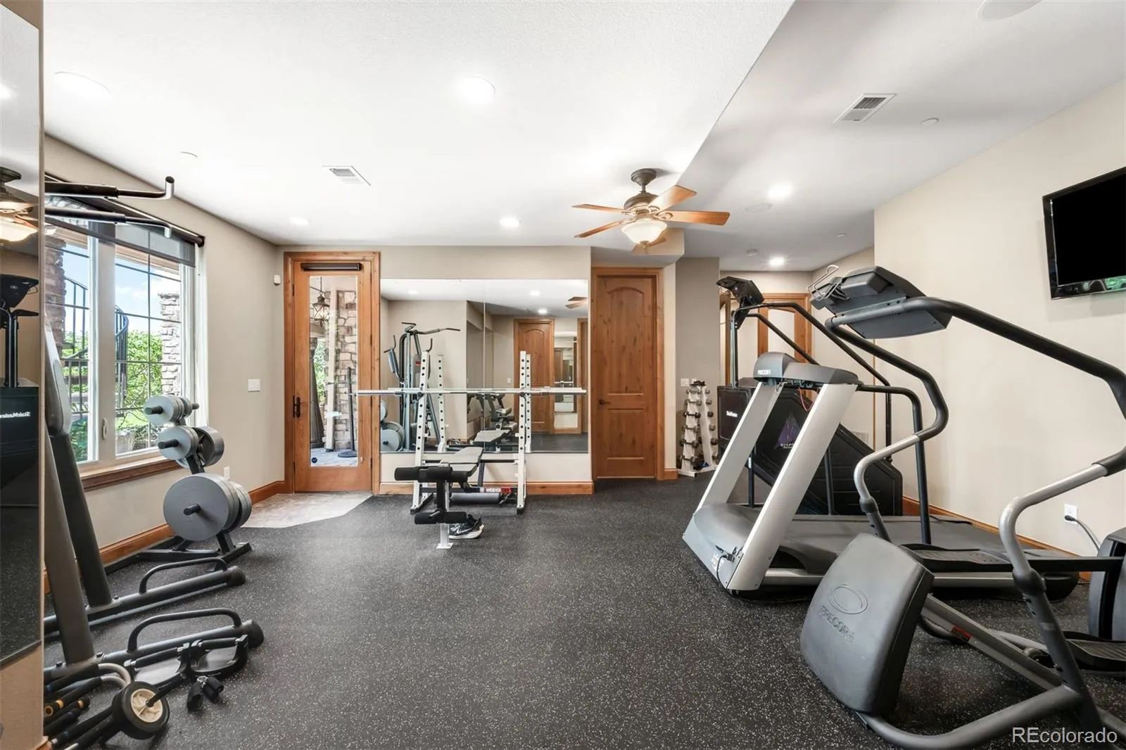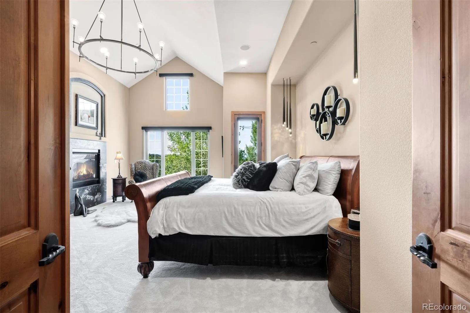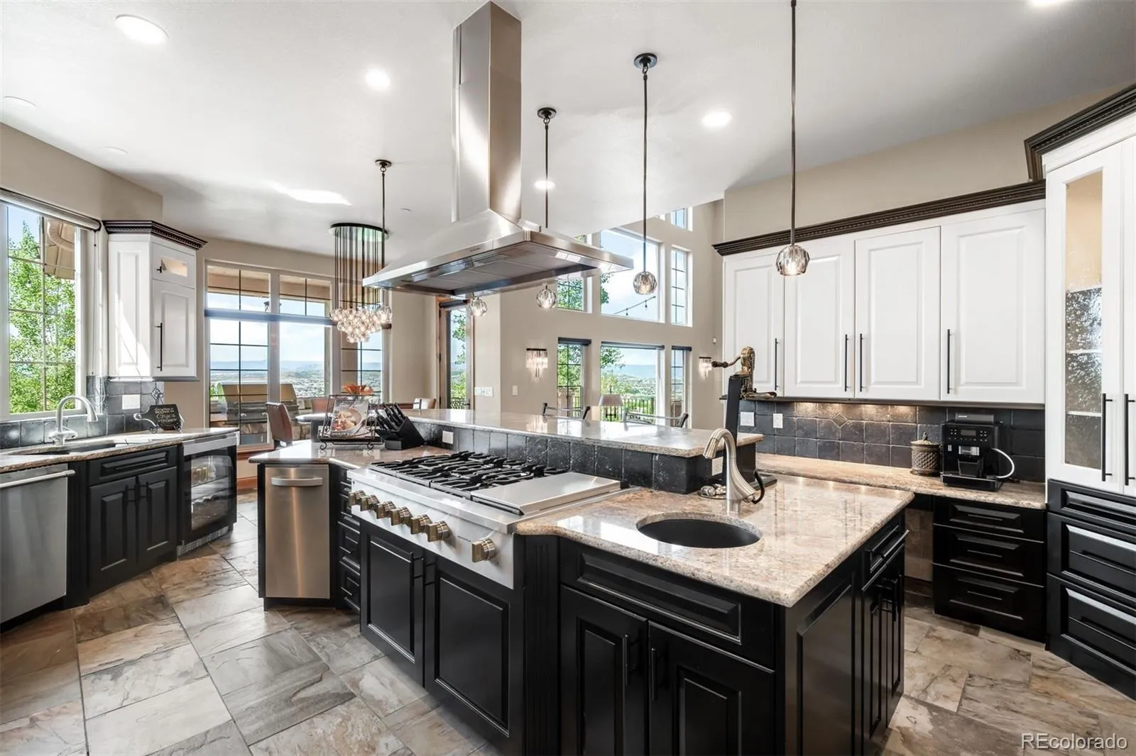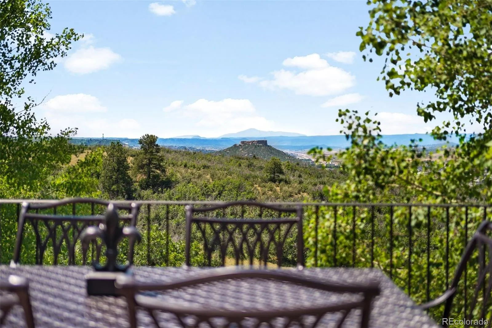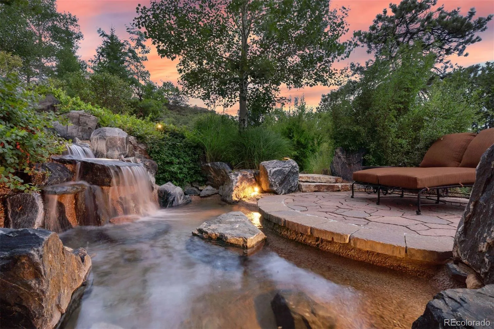 Luxury, views, and privacy define this extraordinary 5 bed, 7 bath estate in prestigious Pinon Soleil. Situated on a professionally landscaped 1-acre cul-de-sac lot, this custom home offers over 8,200 finished square feet of upgraded elegance with unobstructed views of Castle Rock, Pikes Peak, and the Front Range. Recent renovations include new lighting (interior/exterior), carpet, refinished hardwood floors, paint, steam shower, Monogram kitchen appliances, A/C, AV systems, and much more. Main level features vaulted and coffered ceilings, custom-designed lighting (including a stunning 3-story hand-crafted Italian chandelier designed by the homeowner), and a reimagined chef’s kitchen with GE Monogram appliances, large prep island with sink, display cabinets, and butler’s pantry. A 2-sided leathered granite fireplace connects the living room and office. The main-floor primary suite includes a fireplace, blackout blinds, custom closet, private terrace with mountain views, and spiral stairs to a home gym. Upstairs are 3 ensuite bedrooms with walk-in closets and a loft. The finished walk-out basement includes a rec room with stone fireplace, wet bar, wine cellar, guest suite, and a state-of-the-art home theater. Outdoors, enjoy multiple patios, a built-in grill, meditation garden, waterfalls, and a meandering creek. What’s special about this home: private grounds with meandering creek, waterfalls, and firepits. Also of note, the leathered granite fireplace surrounds, custom lighting, upgraded kitchen cabinets, appliances and storage solutions (including a pass-through butler’s pantry and lighted display cabinets.) Additional highlights: 4-car epoxy-coated garage with custom storage, smart organization, irrigation system, landscape lighting, and mature trees. Minutes to downtown Castle Rock, I-25, shopping, and trails—yet feels like a world away.