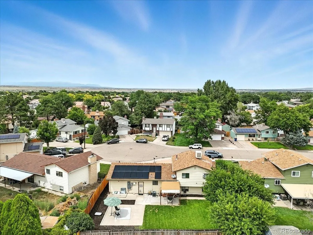 Welcome to this spacious and well-maintained four-level home nestled at the end of a quiet cul-de-sac in Pueblo’s desirable Regency neighborhood. Built in 1974, this residence offers four bedrooms and two bathrooms on a generous 7,200+ sq ft lot. The inviting layout includes a bright, eat-in kitchen that overlooks a cozy family room with a wood-burning fireplace insert—perfect for comfortable gatherings. A walk-out from the kitchen leads to a concrete patio and a fully fenced backyard, ideal for entertaining and pets. Inside, the home features central air conditioning and ceiling fans for year-round comfort. The finished basement offers flexible space that can be used as a home office, gym, or media room, while the laundry and utilities are conveniently located downstairs. The attached two-car garage adds extra storage or workspace. Outside, the home is surrounded by low-maintenance landscaping with an exterior sprinkler system, all set in a family-friendly neighborhood just minutes from local shopping, dining, parks, and quick access to I-25 for easy commuting to Colorado Springs or Ft. Carson. This home presents both comfort and value, with its spacious design, convenient location, and welcoming curb appeal – a perfect fit for anyone seeking functional living in a quiet and established community.