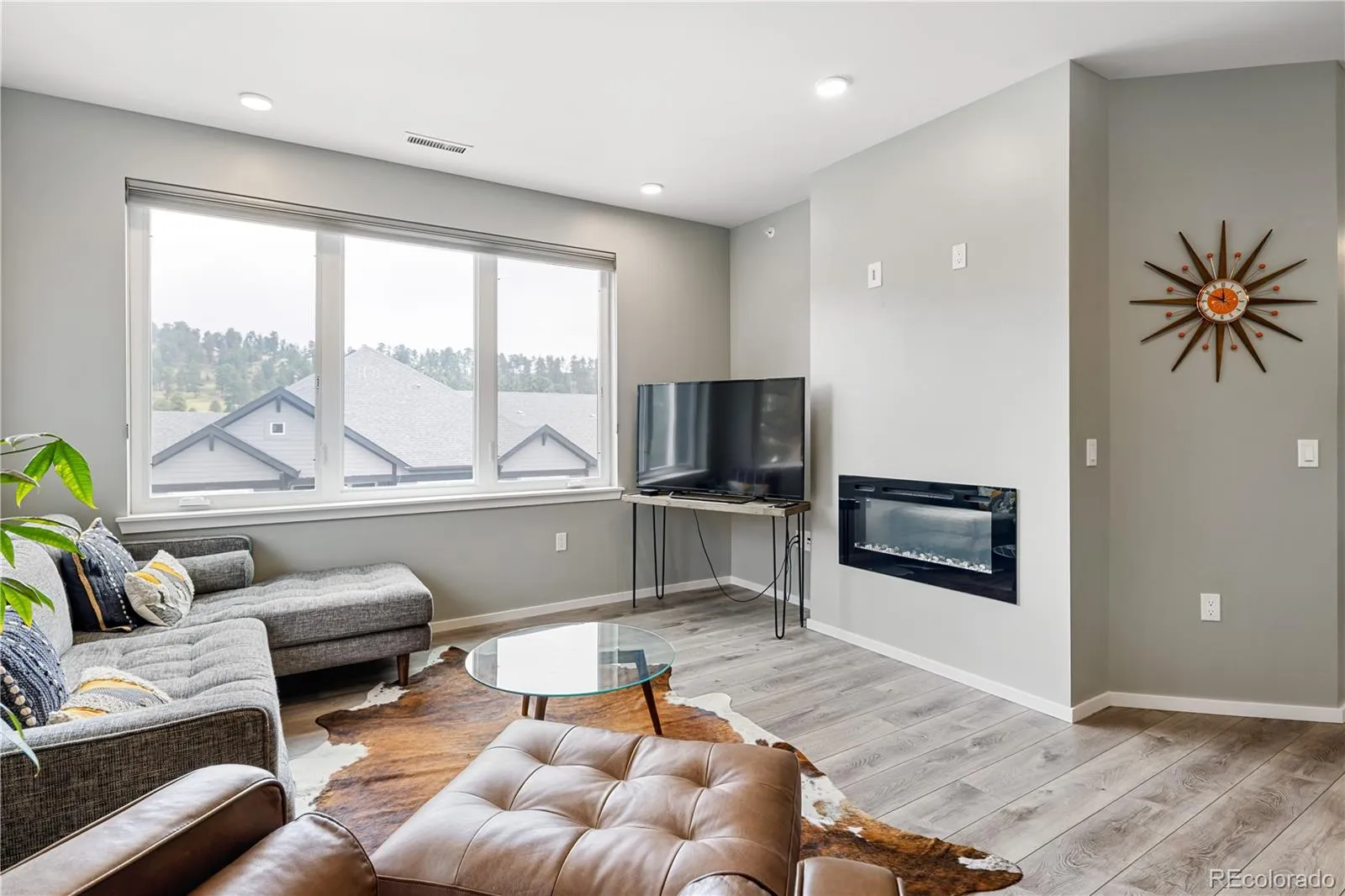 Mountain views from balcony • Top-floor end unit condo built in 2021 with 1,466 sq ft, 3 bedrooms, 2 full bathrooms, and 1 half bathroom. Open floor plan includes high ceilings, gas fireplace, kitchen island, pantry, quartz counters, and stainless steel appliances such as dishwasher, disposal, dryer, microwave, oven, refrigerator, and washer. Primary suite on main level features walk-in closet, dual sinks, and 12 x 14 dimensions. Additional bedrooms measure 11 x 11 each. Central air conditioning, forced air natural gas heating, tankless water heater, double pane windows, carpet, laminate, and tile flooring. High speed internet, cable available, smoke free, carbon monoxide detectors, smoke detectors, and security entrance. Pets allowed with number and size limits, long term rentals allowed. Covered balcony, contemporary style, slab foundation, composition roof. Attached oversized garage with concrete floor, dry walled, heated, insulated, storage, plus off-street parking space. 0.2 mi to Bergen Park, 0.3 mi to King Soopers, 0.8 mi to Natural Grocers, 0.5 mi to Muddy Buck Coffee House, 0.5 mi to Fillius Park, 0.5 mi to Elk Meadow Park trails, 0.5 mi to Wildflower Cafe, 0.6 mi to EverBean Coffee Co. 3 mi to I-70 access, 30 mi to downtown Denver, 11 mi to Echo Mountain ski resort.