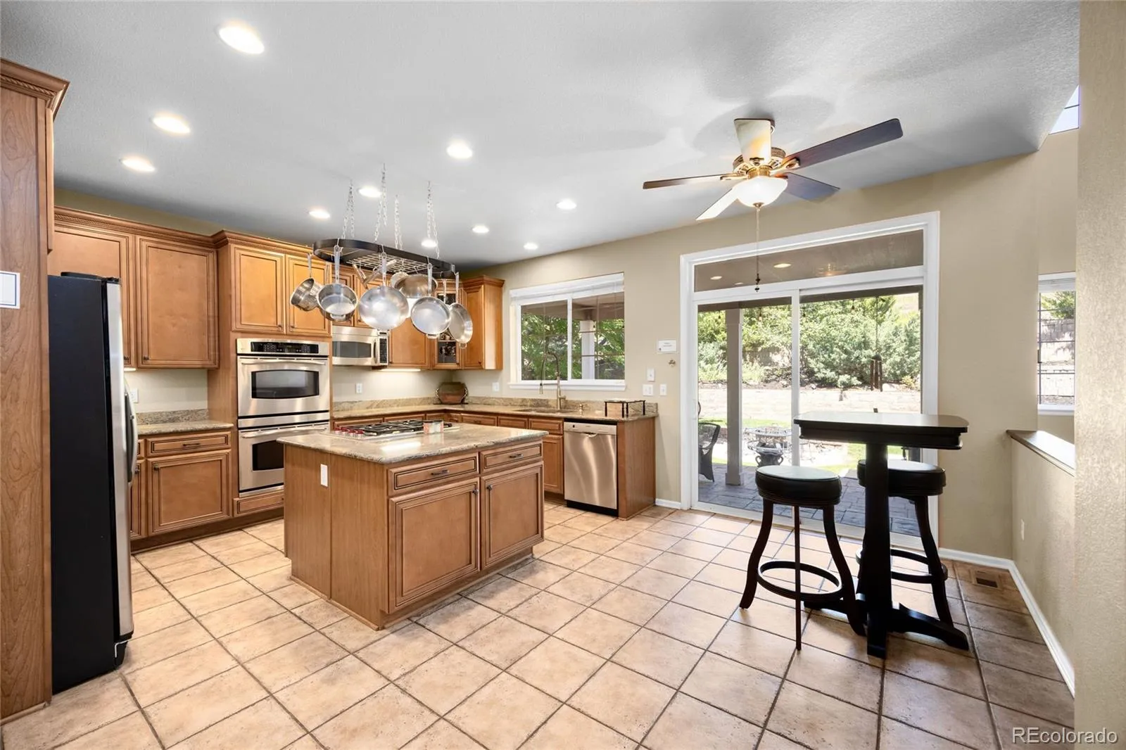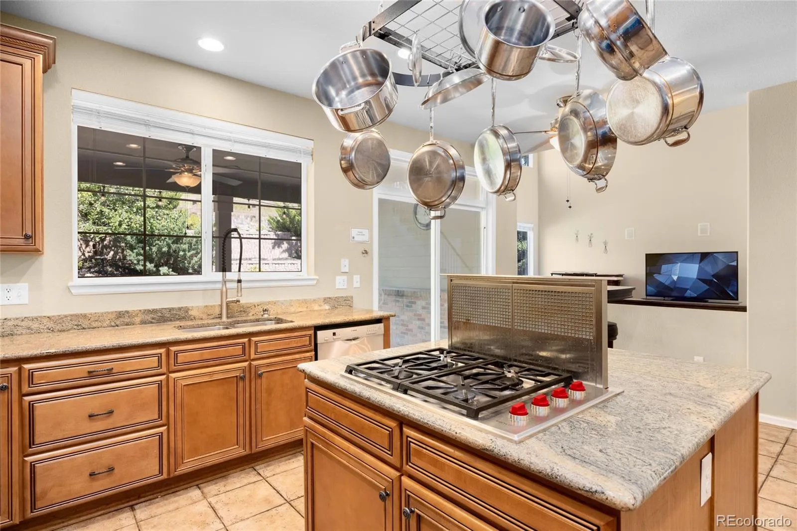 At the heart of the home is a chef-inspired kitchen featuring a large center island, granite countertops, stainless steel appliances, double ovens, a WOLF gas cooktop, pantry, and a charming breakfast nook overlooking the backyard.