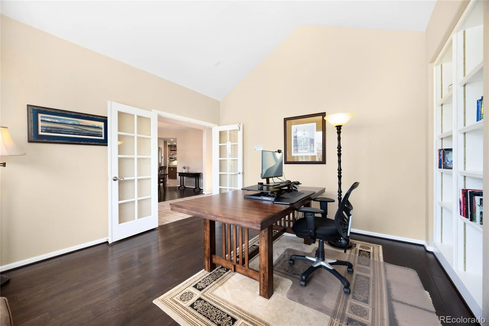 Enter this beautifully appointed two-story home and discover soaring vaulted ceilings and an abundance of natural light that makes every space feel bright and inviting. The main-level primary suite provides ultimate convenience and comfort, while the adjacent home office with French doors and custom built-ins creates the ideal space for productivity or retreat.