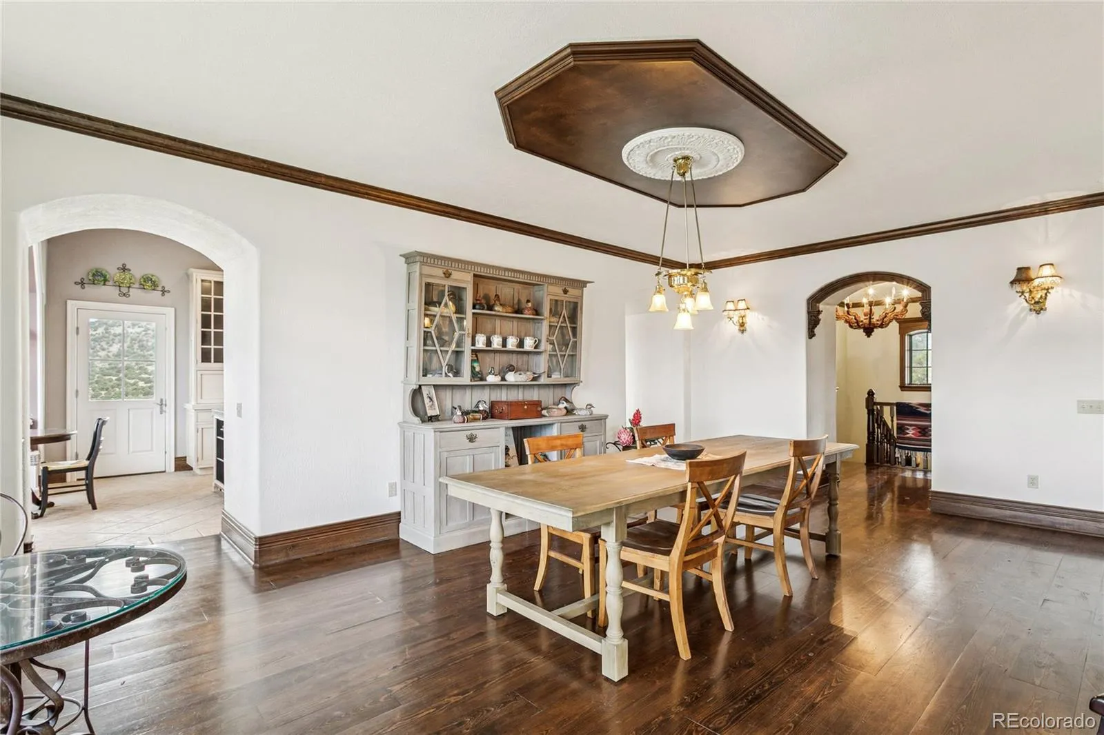 Crafted from stone, timber, stucco, and custom ironwork, the home welcomes you with a long, scenic drive and handcrafted alderwood entry doors. Inside, the main living room features soaring ceilings, floor-to-ceiling millwork, a gas fireplace, and French doors opening to a covered porch. The chef’s kitchen includes authentic Rutt cabinetry, Ann Sacks limestone, Viking appliances, and a built-in window seat. A formal dining room sits between the kitchen and living room with arched entries and porch access.