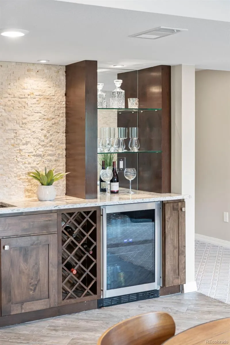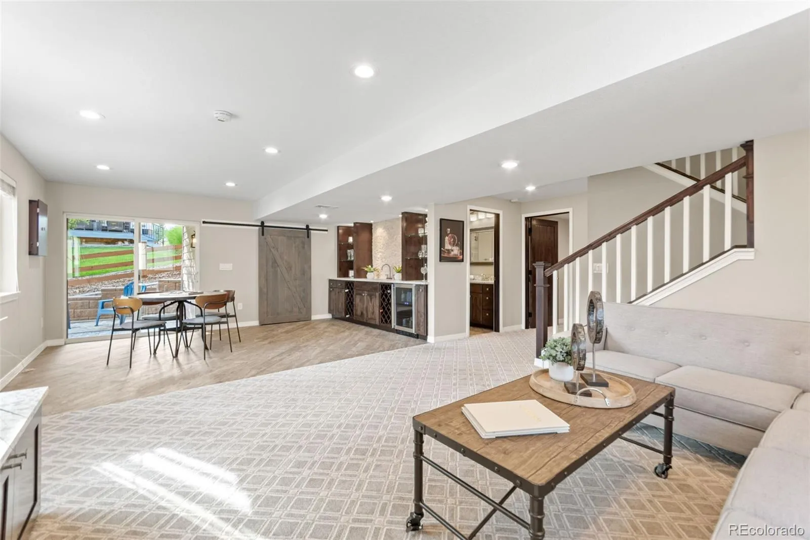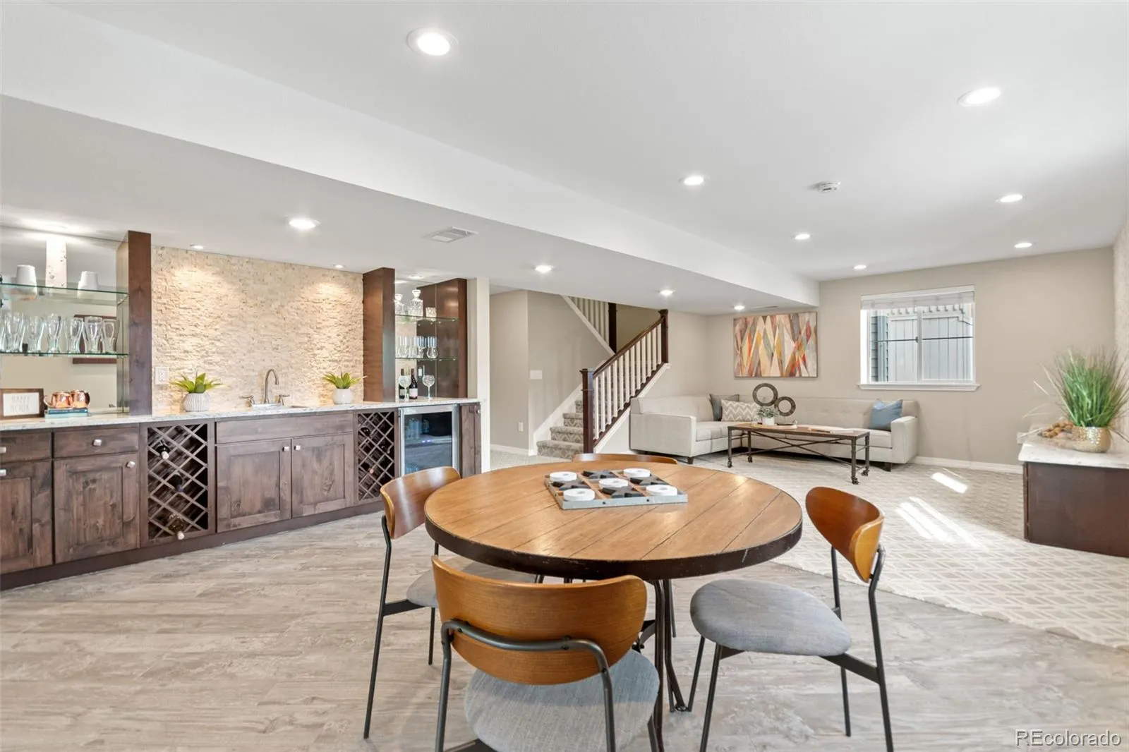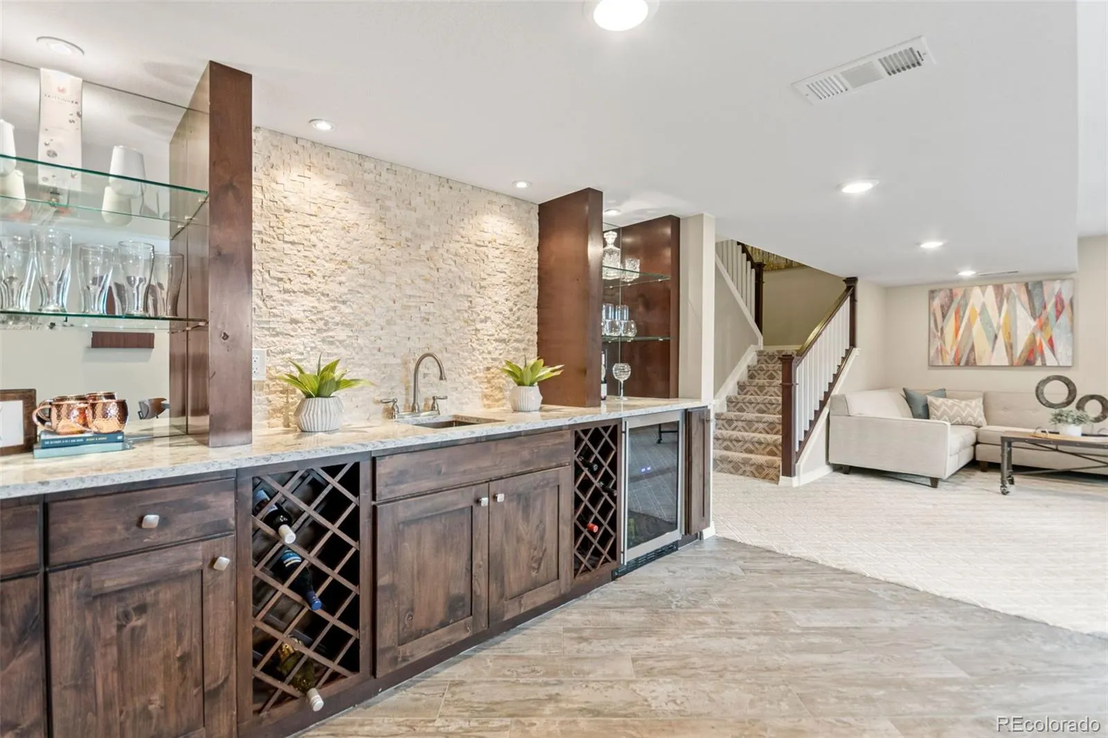The finished walkout basement is perfect for entertaining, complete with a large rec room, custom granite wet bar, beverage fridge, a fourth bedroom & stylish full bath.