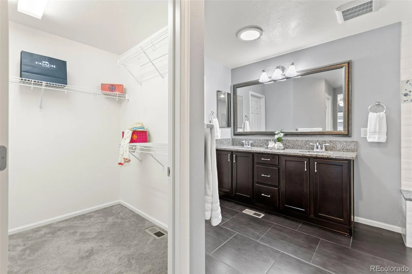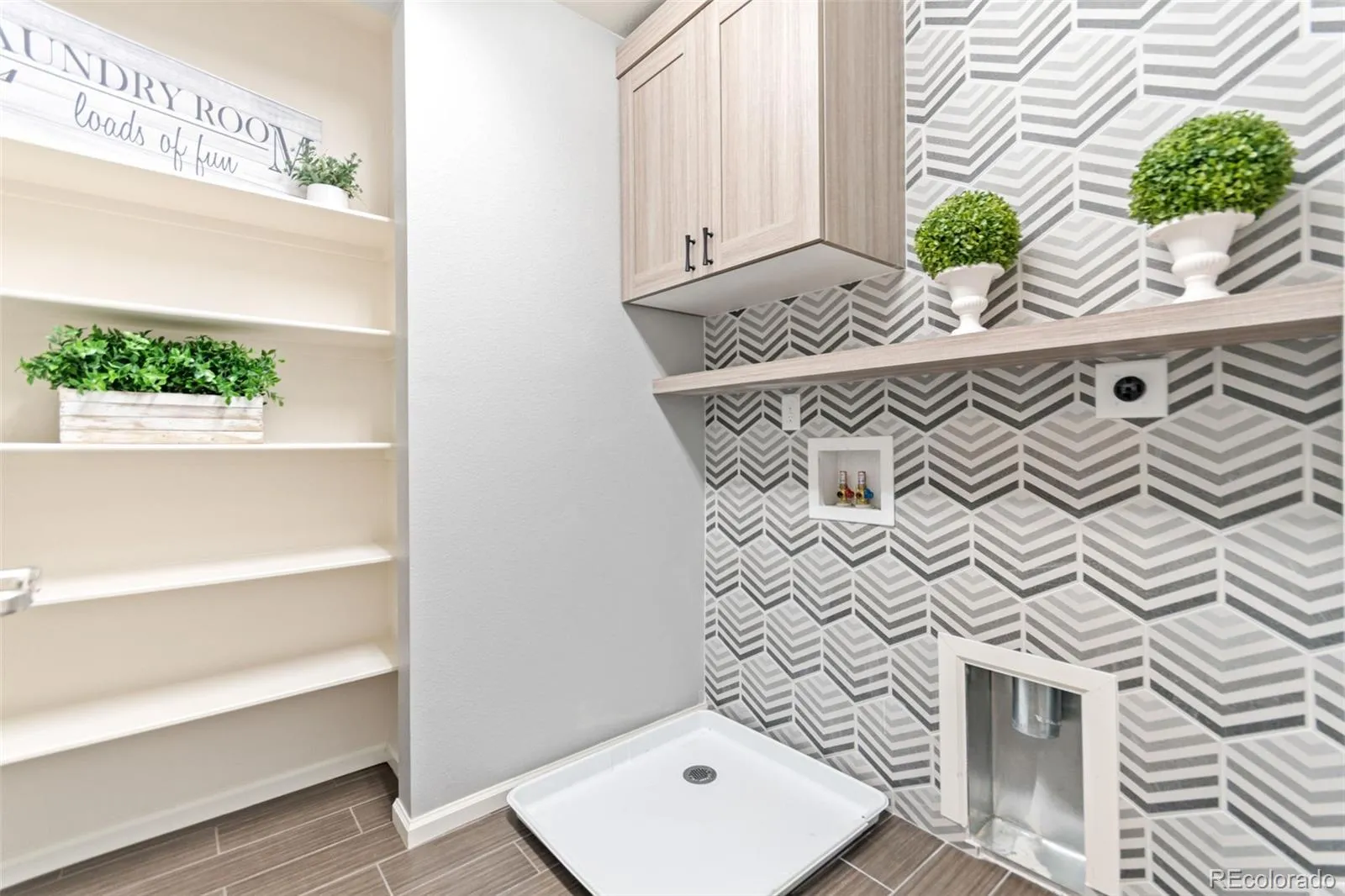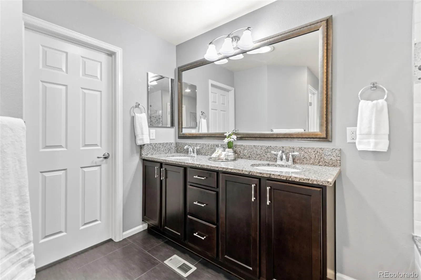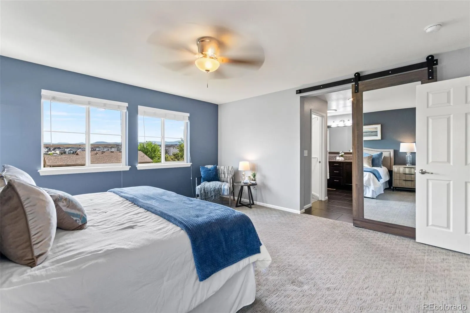 Upstairs, two spacious bedrooms share a full bath with granite and tile finishes. The laundry room offers built-in storage and decorative tile feature wall. The oversized primary suite captures panoramic views from the mountains to downtown and features a custom barn door, luxurious en-suite with granite countertops, tile-accented shower, and walk-in closet.