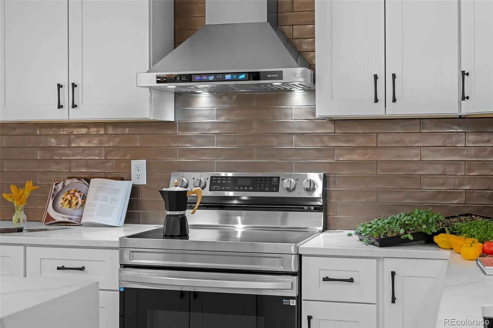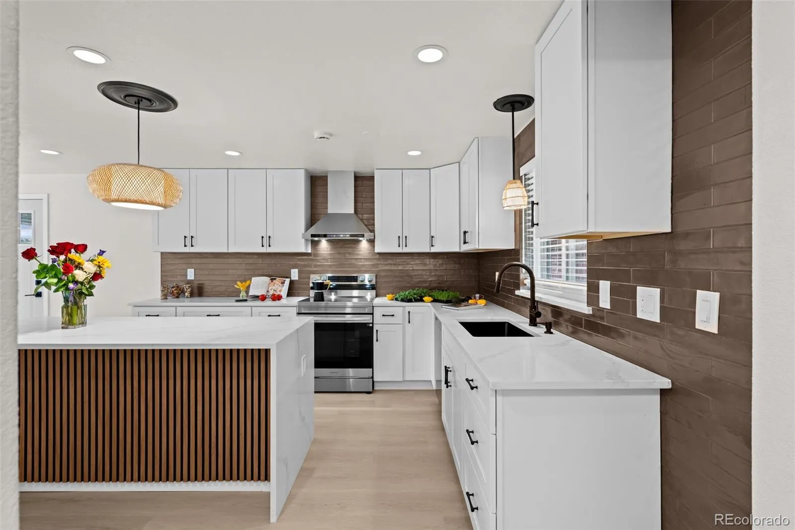 Chefs kitchen features custom tiles and granite counters, big center island with seating, unique lighting, new SS appliances, and stove with remote smart hood. From the dining table, Big windows showcase the yard.