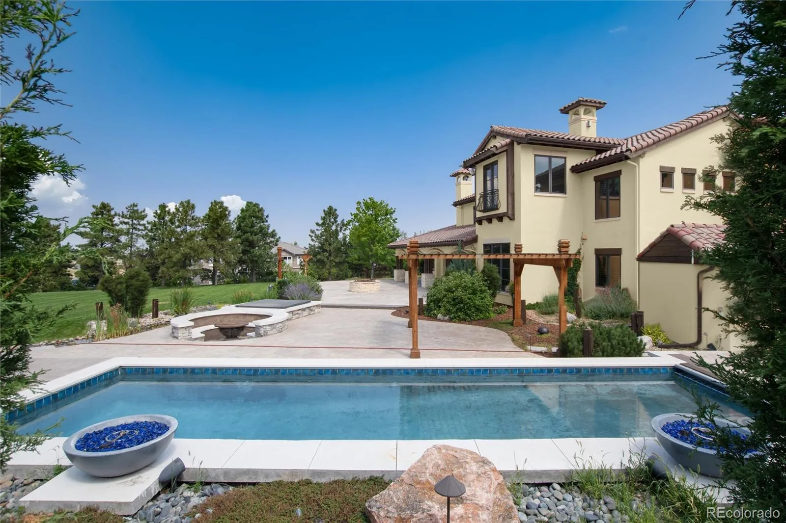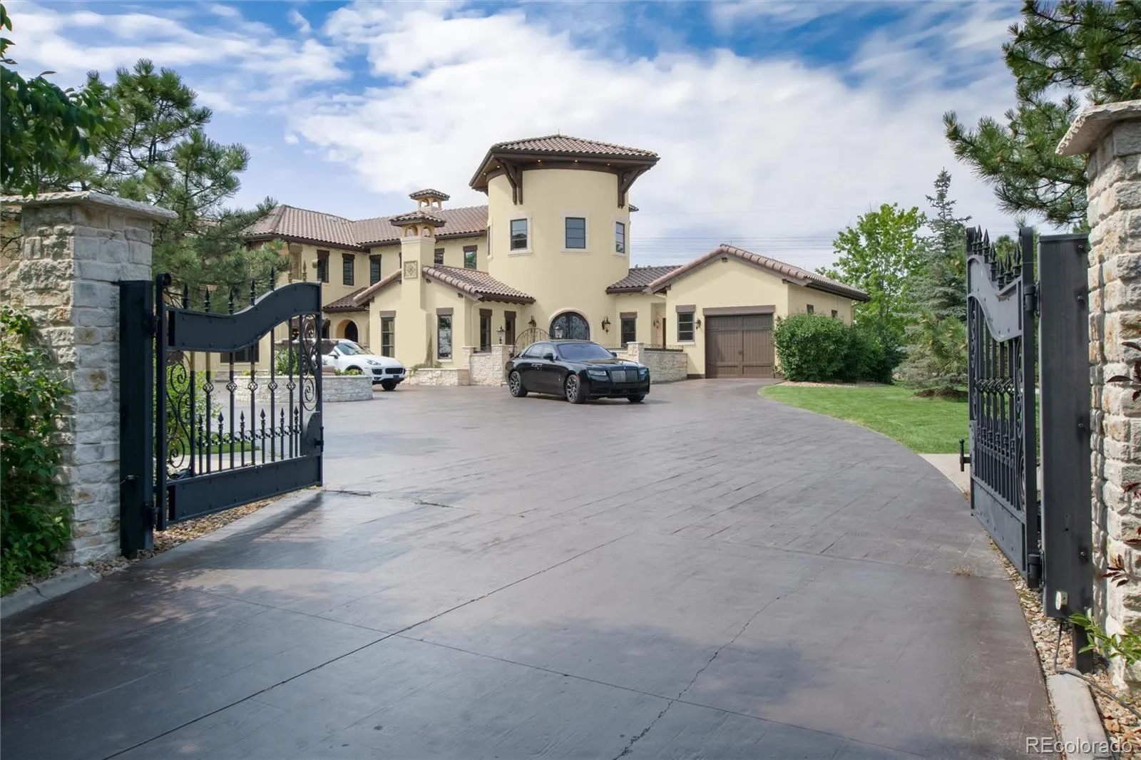 A Mediterranean masterpiece. You will access this private Mediterranean Estate via a gated entry. Hidden in the prestigious Hidden Pointe Estates community of Castle Pines, Colorado, on 2.47 luxurious acres, is a lifestyle beyond your expectations. Soaring ceilings, exquisite arches, and indoor and outdoor balconies accent the grandeur of the over 10,000 square feet of European styling. Luxurious treed grounds with walking paths, lily ponds, a pool, hot tub, fire pits, a golf putting green, sports court, and unique lighting effects create a magical panorama with the Rocky Mountains as the backdrop. The stained concrete construction of the motor pool entrance with its fountain is mirrored throughout the home, creating an authentic European ambiance. With its top-of-the-line cabinetry and appointments throughout, its timeless construction, the rare main floor private apartment with its own garage (6 total), and extraordinary authentic quality at every turn, this amazing estate is a lifestyle decision, one you will never regret.