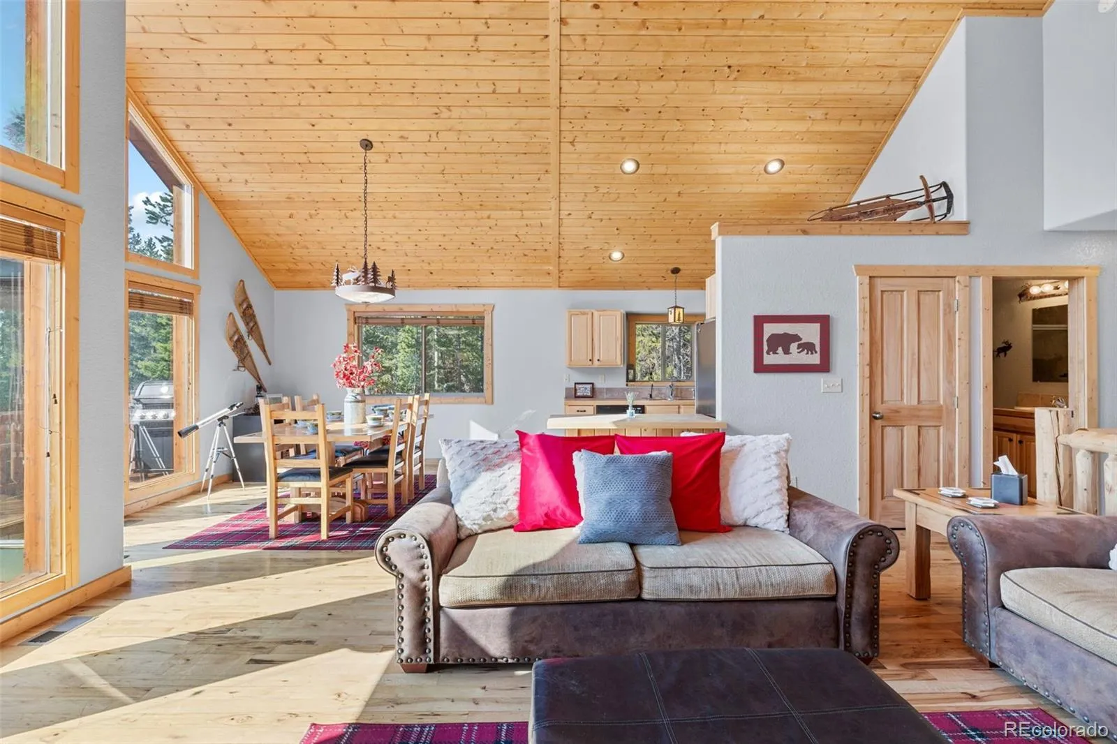 Enjoy an open floor plan with soaring tongue-and-groove ceilings, a wall of windows, and a stunning floor-to-ceiling stone fireplace. The kitchen features Hickory cabinets, tile counters, and stainless-steel appliances. The spacious primary suite includes dual vanities and a walk-in closet, plus a main-level guest room for convenience. The finished lower level offers a third bedroom, ¾ bath, and a flexible living area perfect for guests, games, or a home gym.
