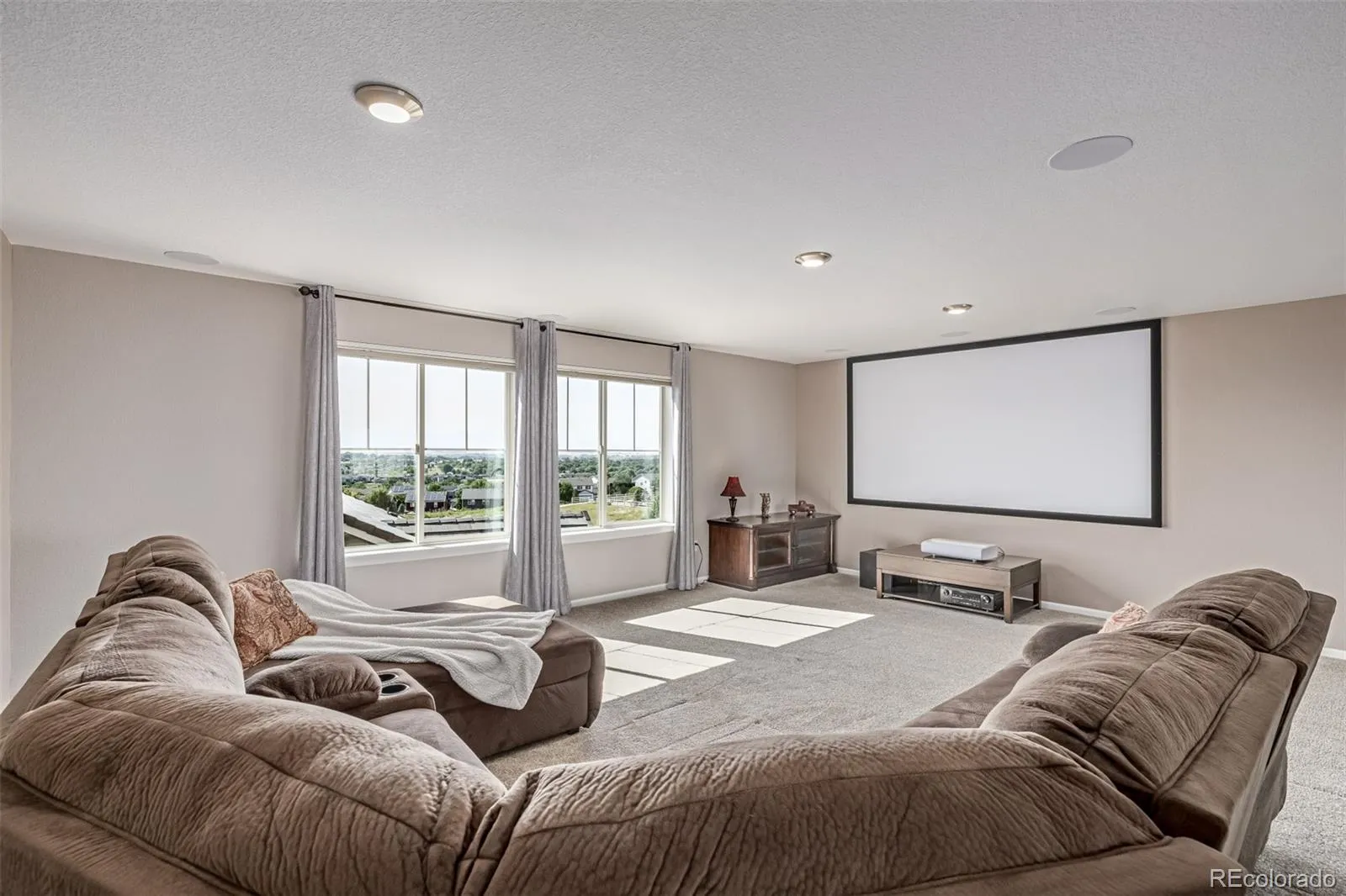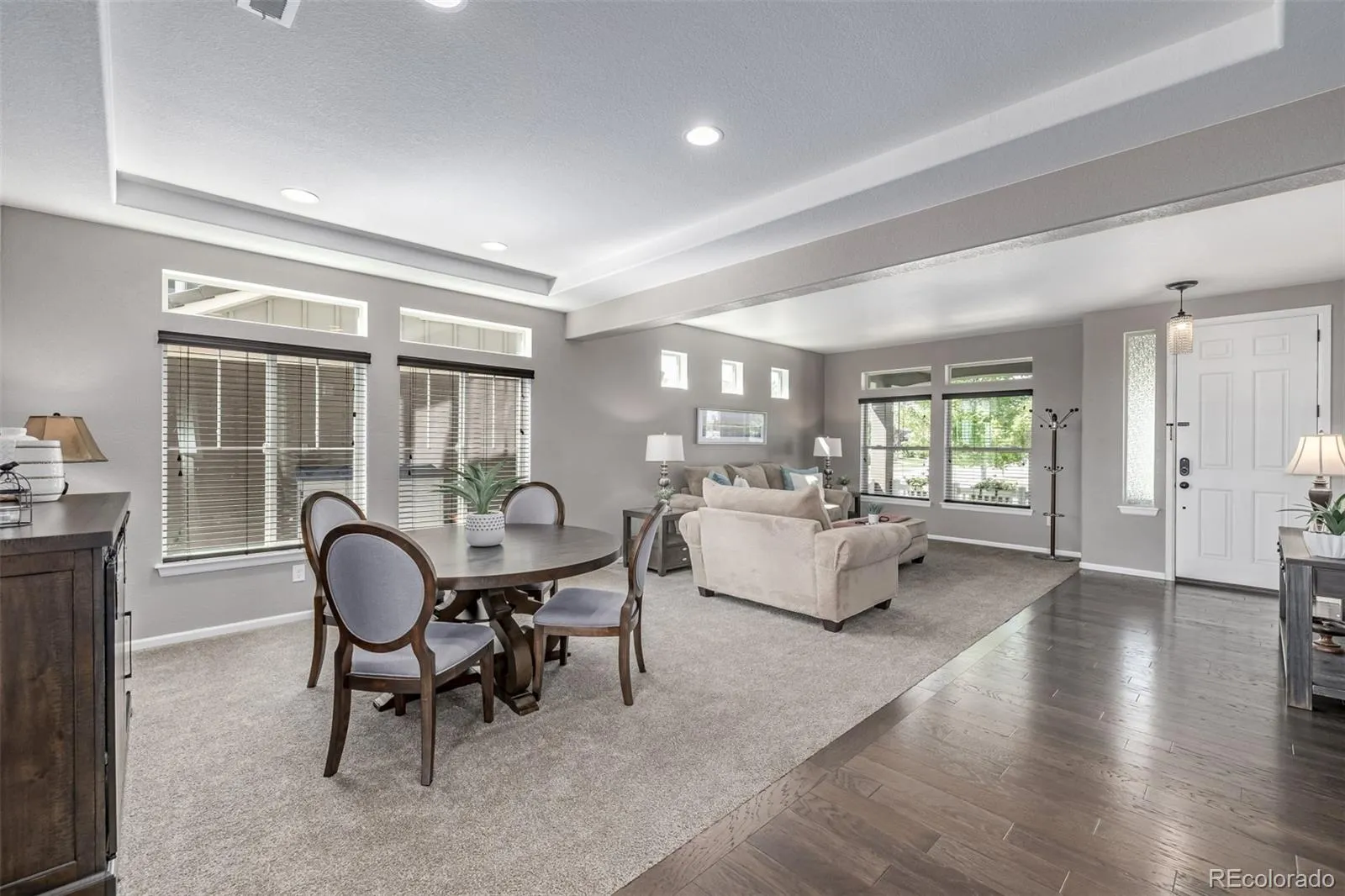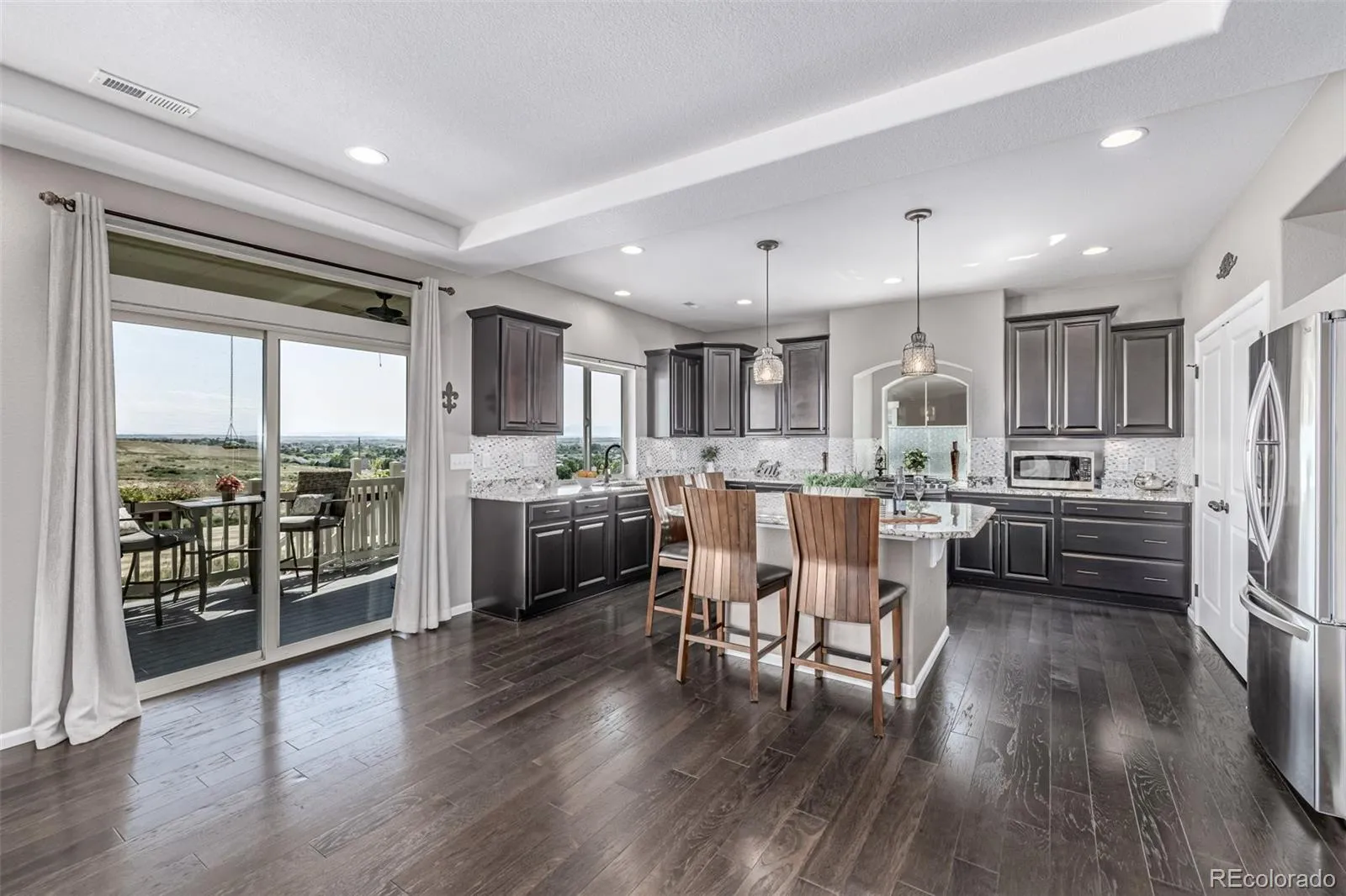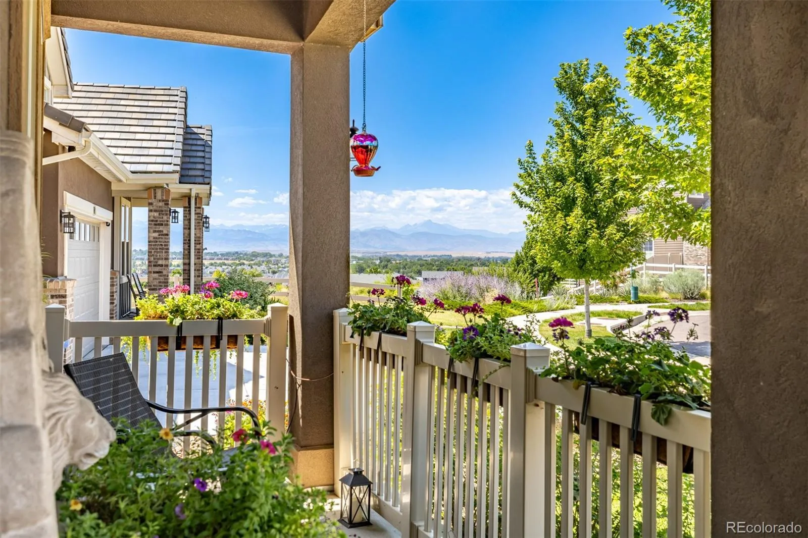 Enjoy sweeping Front Range mountain views from your front porch, back deck, and throughout this exceptional home. At night, take in the twinkling city lights while relaxing in your private backyard oasis. Perfectly situated backing to open space, this property ensures your privacy. Inside, this home offers both comfort and flexibility. The main level features distressed luxory vinyl plank flooring, elegant tray ceilings, and a gourmet kitchen complete with stainless steel appliances, a gas cooktop, a large walk-in pantry, custom tile backsplash, slab granite counters, and an oversized island perfect for entertaining. A custom fireplace wall with designer tile adds warmth and style to the living space. Both the family room and third-floor bonus space are equipped with built-in surround sound speakers.