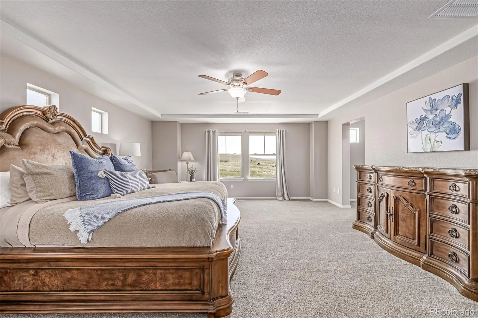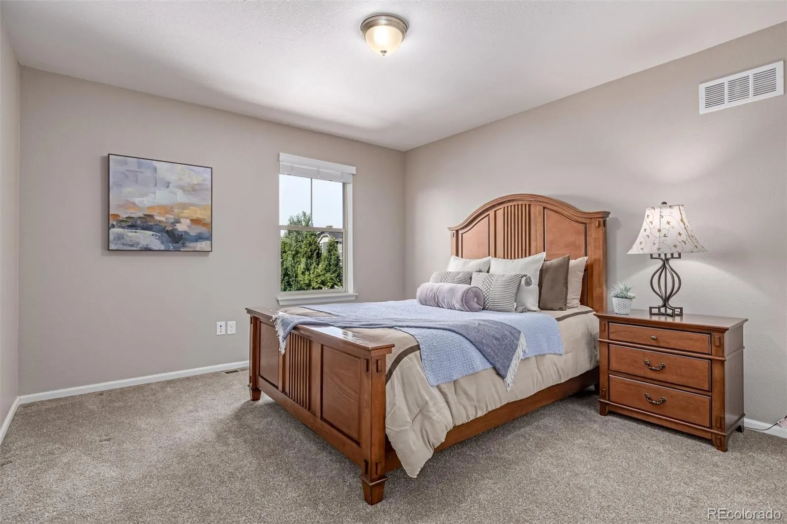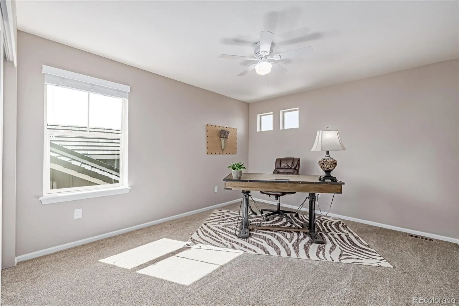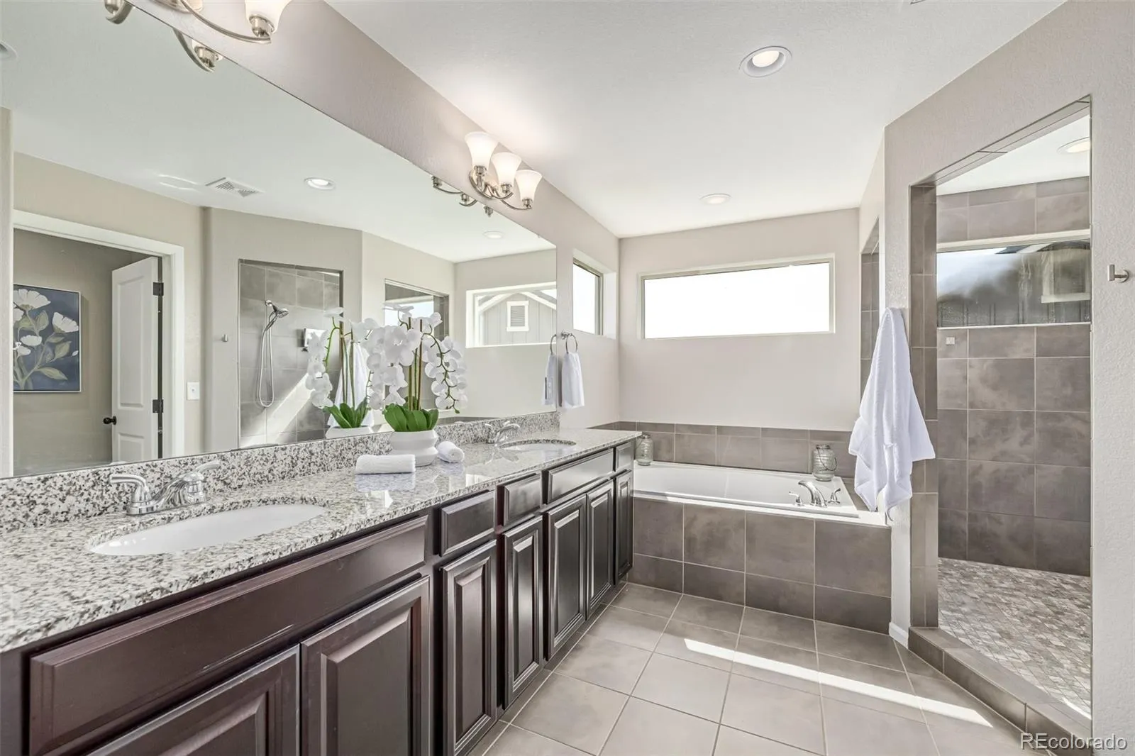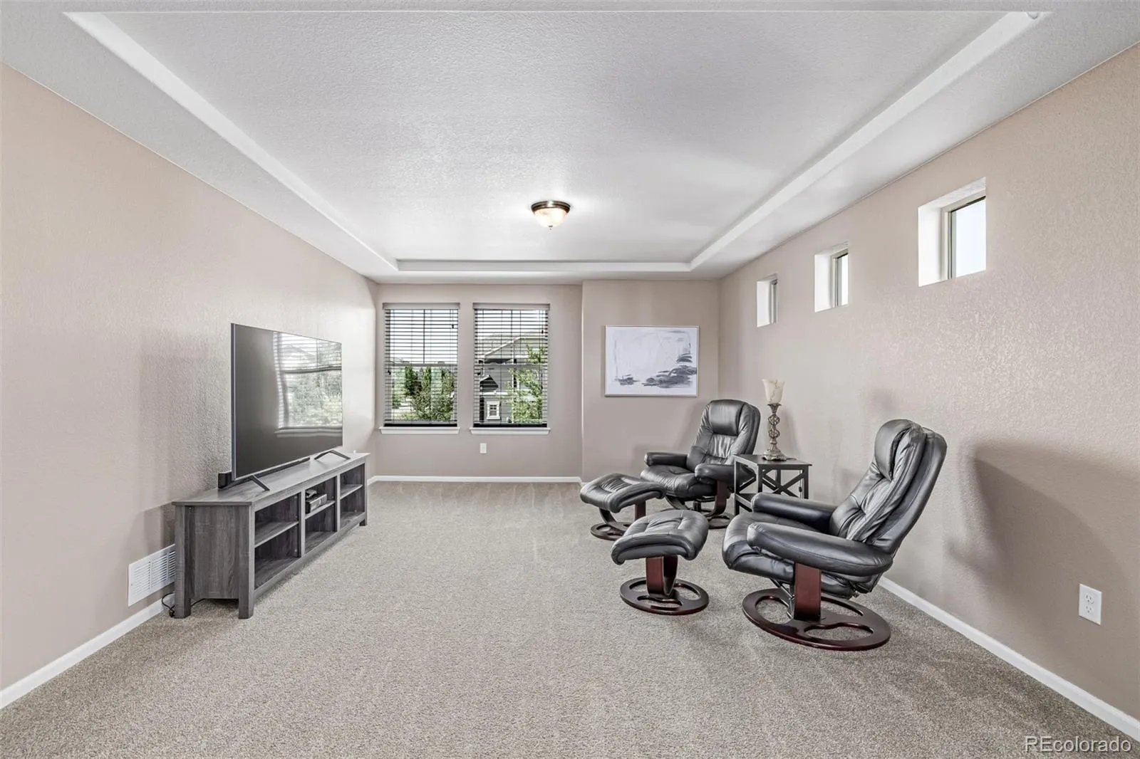 Enjoy sweeping Front Range mountain views from your front porch, back deck, and throughout this exceptional home. At night, take in the twinkling city lights while relaxing in your private backyard oasis. Perfectly situated backing to open space, this property ensures your privacy. Inside, this home offers both comfort and flexibility. The main level features distressed luxory vinyl plank flooring, elegant tray ceilings, and a gourmet kitchen complete with stainless steel appliances, a gas cooktop, a large walk-in pantry, custom tile backsplash, slab granite counters, and an oversized island perfect for entertaining. A custom fireplace wall with designer tile adds warmth and style to the living space. Both the family room and third-floor bonus space are equipped with built-in surround sound speakers.