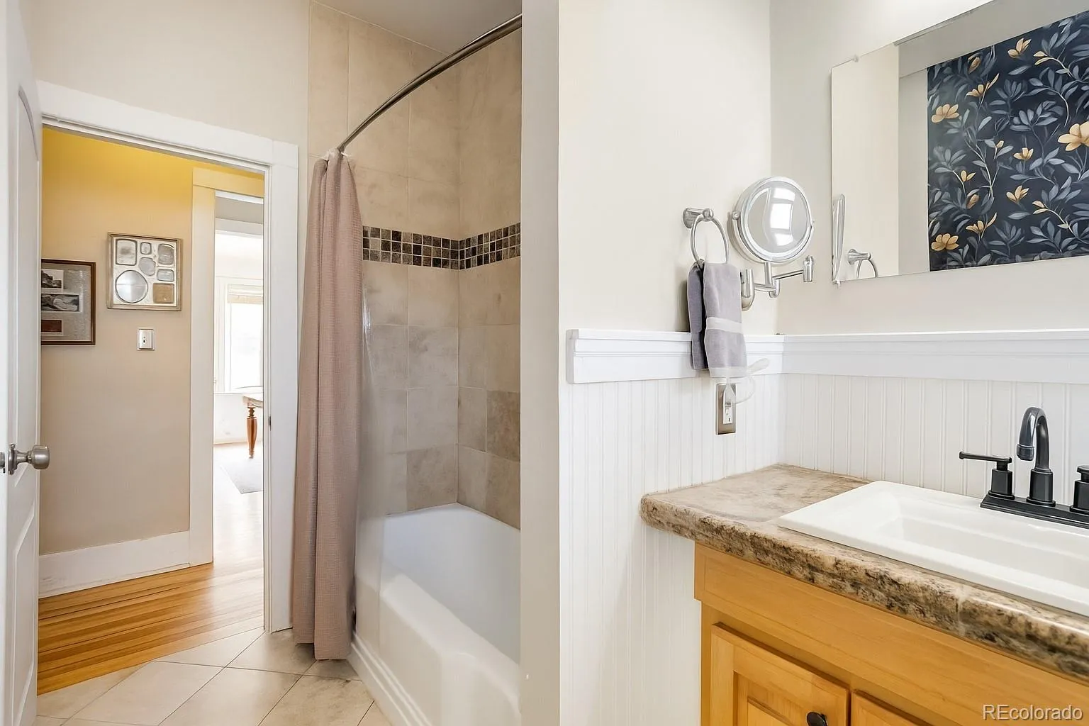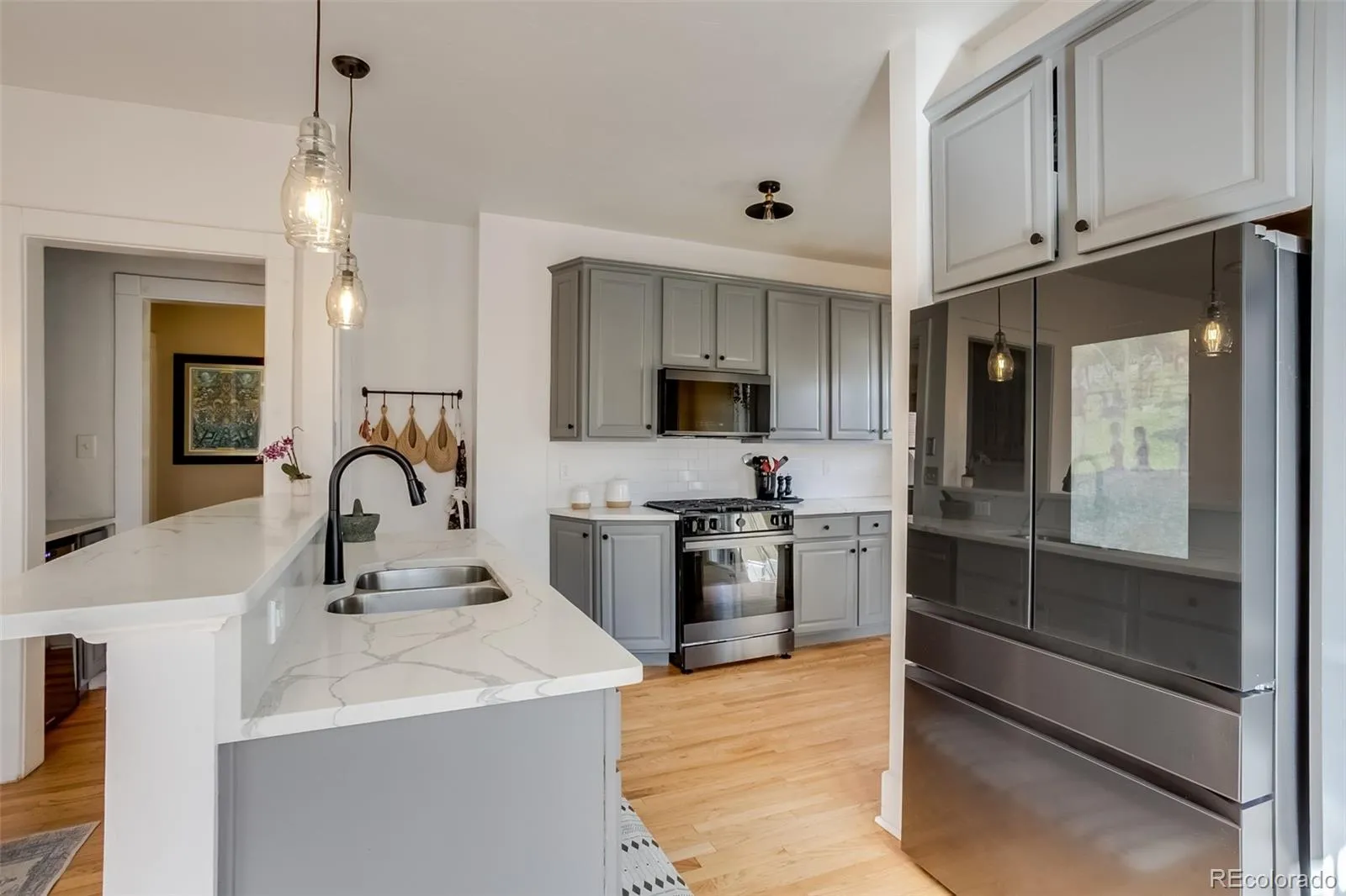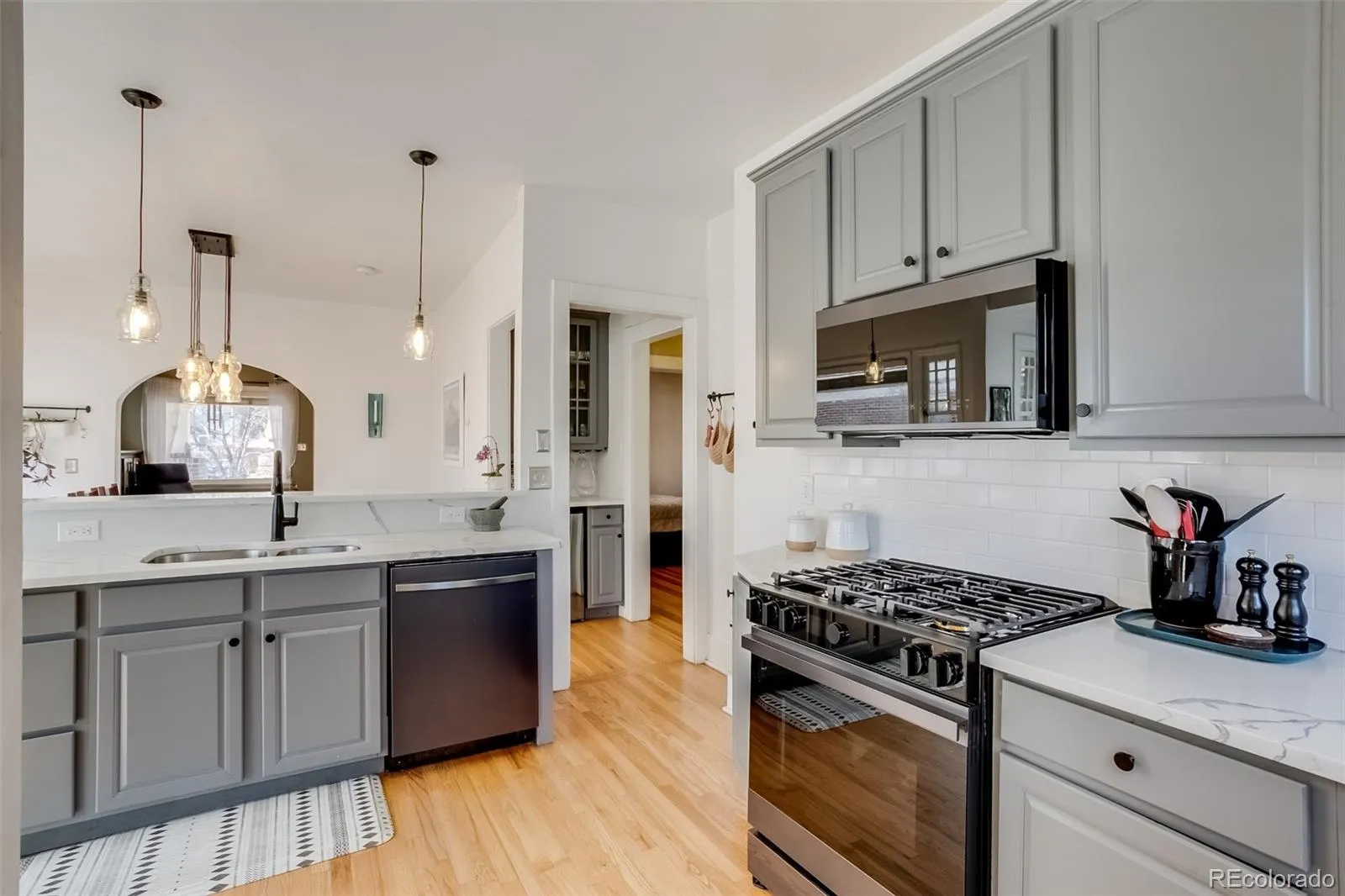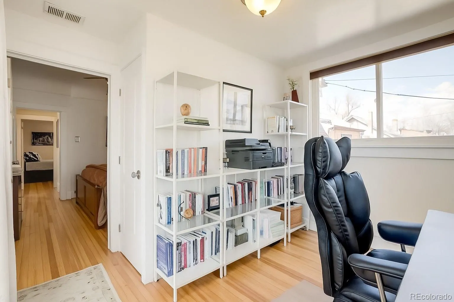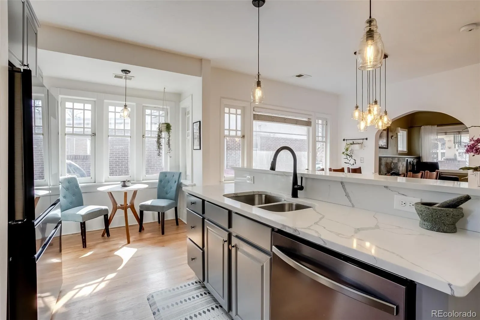 An Extraordinary Renovated 4-Bedroom, 2 Bath Park Hill Bungalow – Spacious, Stylish, and Perfect for Entertaining! This beautifully renovated 4-bedroom, 2 full bath Park Hill bungalow offers far more living space than most in its price range. From the moment you arrive, you’ll notice its charming curb appeal, mature trees, and inviting front porch perfect for morning coffee or evening relaxation. Inside, the home welcomes you with a warm living room featuring a classic wood-burning fireplace, plus a bright family room for extra gathering space. The open-concept kitchen and dining area connect seamlessly to both rooms, making the layout ideal for daily living and hosting. The kitchen is a chef’s dream with an expansive island, sidebar, prep sink, breakfast nook with built-ins, stylish pendant lights, and abundant counter space. Off the kitchen, custom built-ins with a wine cooler provide storage and style. Sunlight pours through southern-facing windows, creating a cheerful year-round atmosphere. A dedicated home office with glass French doors opens directly to the backyard, offering an inspiring workspace. The fully finished basement features high ceilings, fresh paint, two staircases, generous natural light, canned lighting, 2 bedrooms, and flexible living areas for a media room, gym, or guest quarters. Additional highlights include new HVAC, new A/C, central A/C, PV solar panels, refinished hardwood floors, and tasteful updates throughout. Step outside to a private backyard retreat with spacious patio, lush lawn, hot tub, and a privacy gate securing the detached garage and yard. Home incudes a private driveway which leads to the garage and can accommodate a large RV, Boat, oversized truck or three cars. The neighborhood’s stunning architecture, walkability, and friendly community make this location just as special as the home. Outdoor photos have been enhanced.