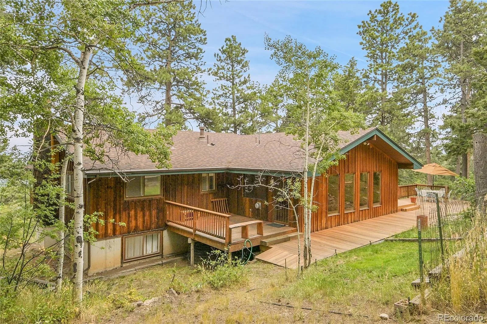 Discover the perfect blend of mountain serenity and urban convenience in this stunning foothills home that captures breathtaking city lights shimmering against the mountain backdrop. This expansive residence welcomes you through a sun-drenched bonus room featuring skylights and an elegant two-way stone fireplace, flowing seamlessly into a generous kitchen equipped with premium stainless steel appliances and an intimate dining nook. The cozy living room centers around a crackling wood stove where you can unwind while gazing at twinkling city lights below, while three distinct living areas ensure everyone has space to relax and gather. The primary suite serves as a true sanctuary with its own charming sunroom and luxurious full bathroom featuring sophisticated slate tile surroundings and a deep soaking tub, complemented by two additional well-appointed bedrooms—one on the main level and another on the walk-out lower level with its own private bathroom. The lower level family room opens directly outdoors for seamless indoor-outdoor living, while wraparound decking on three sides creates multiple outdoor spaces perfect for observing wildlife and soaking in spectacular views. Ideally positioned just 10 minutes from both C-470 and charming Conifer, this property offers the rare combination of mountain tranquility and easy access to urban amenities, where every day feels like a vacation in the best of Colorado living.