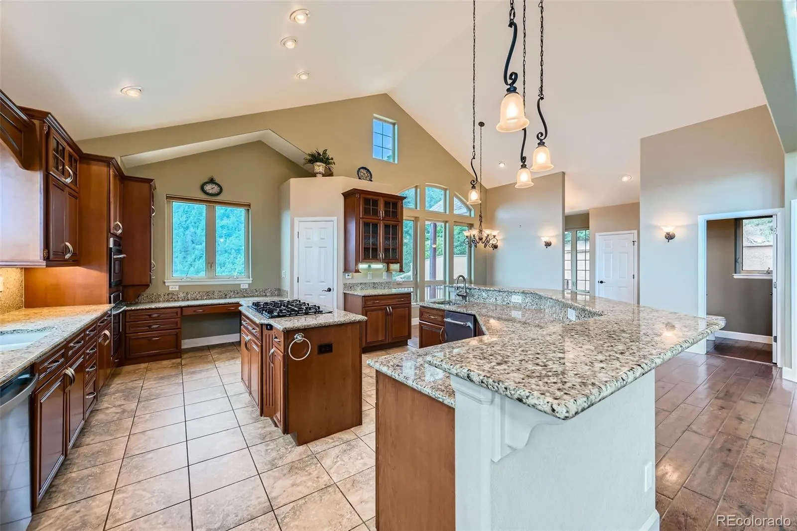 HUGE PRICE REDUCTION! Don’t miss this Top Of The World listing! NEW ROOF AND SKYLIGHTS! Revel in expansive mountain and city views from every bedroom and living area! With all the charm and warmth of a true Colorado mountain home, notice the quality and craftsmanship of this two-story stucco gem. Upon entering, you’ll notice the perfectly placed window seat and the custom wood entry door. This entry area opens to a huge great room, complete with the elegance of a custom overlook from the second story, two-story vaulted ceiling, custom floor to ceiling windows and skylights, wood plank floor, speakers, a two-story fireplace, and an exit through French doors to the custom deck which overlooks Colorado Springs and the Plains through valley and the mountains below. The kitchen will delight the chef with upgrades and quality appointments, including stainless steel appliances throughout: gas cooktop, wall oven and microwave, dishwasher, refrigerator, and ice machine. Granite counters, breakfast bar, brushed bronze fixtures, including a touch-faucet, a counter bar, two kitchen sinks, a garden window, a built-in desk area and pendant lighting complete the elegant feel of the kitchen area. The master bedroom is generous in space and luxury, featuring floor to ceiling windows and a custom door that exits to the deck. The fireplace in the master bedroom is perfect for cozy Colorado nights. The ensuite 5-piece master bath includes a picture window that looks out to the city of Colorado Springs and further out to the Colorado Plains. The large walk-in master closet allows for lots of storage. Upstairs, the two bedrooms and the loft have views unmatched. A charming bathroom is shared by these spaces, complete with a custom vanity. The basement includes a family room area with doors that open to a covered porch. Don’t forget the massive storage room with radiant floor heat! Come see this one today!