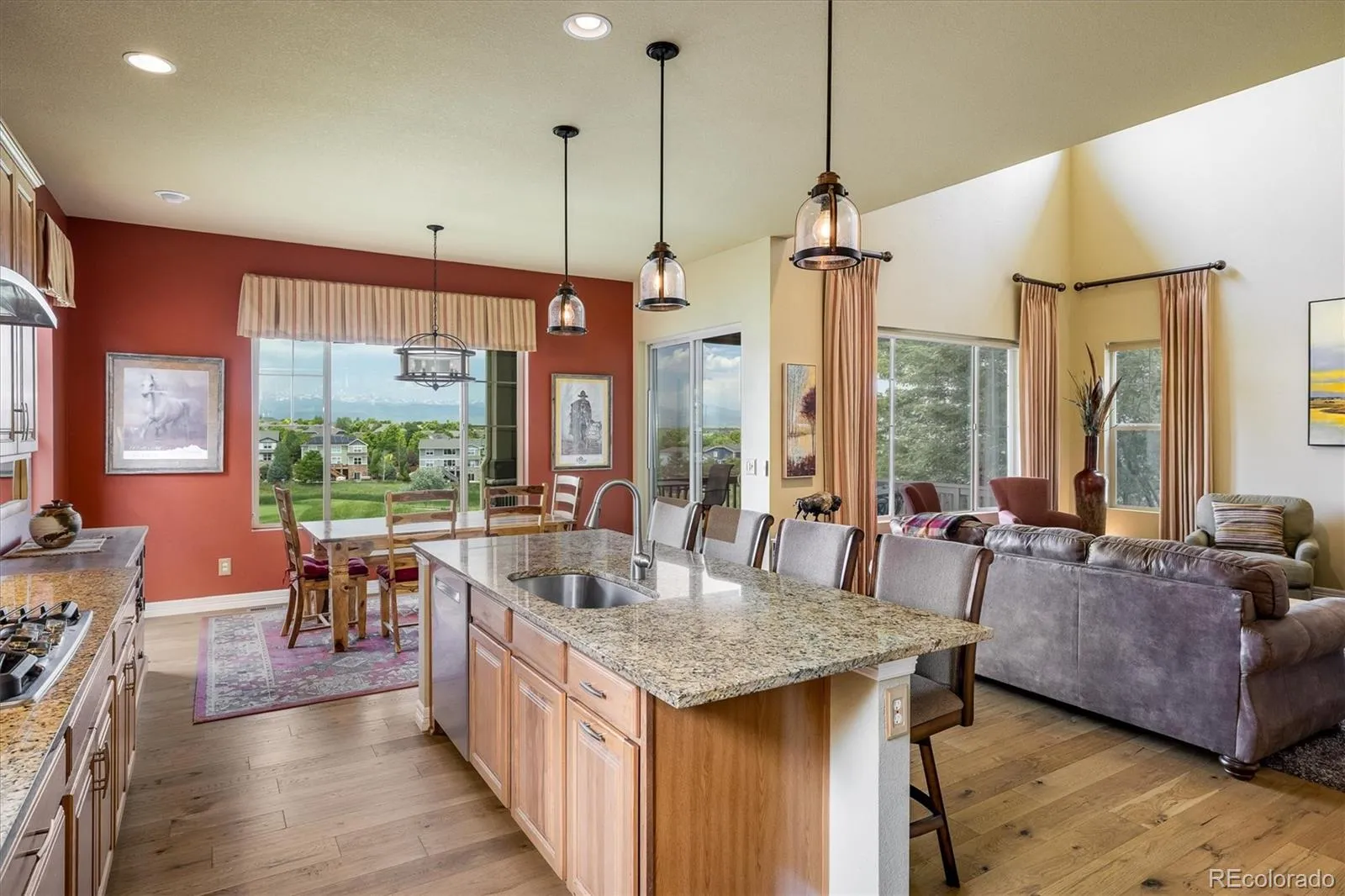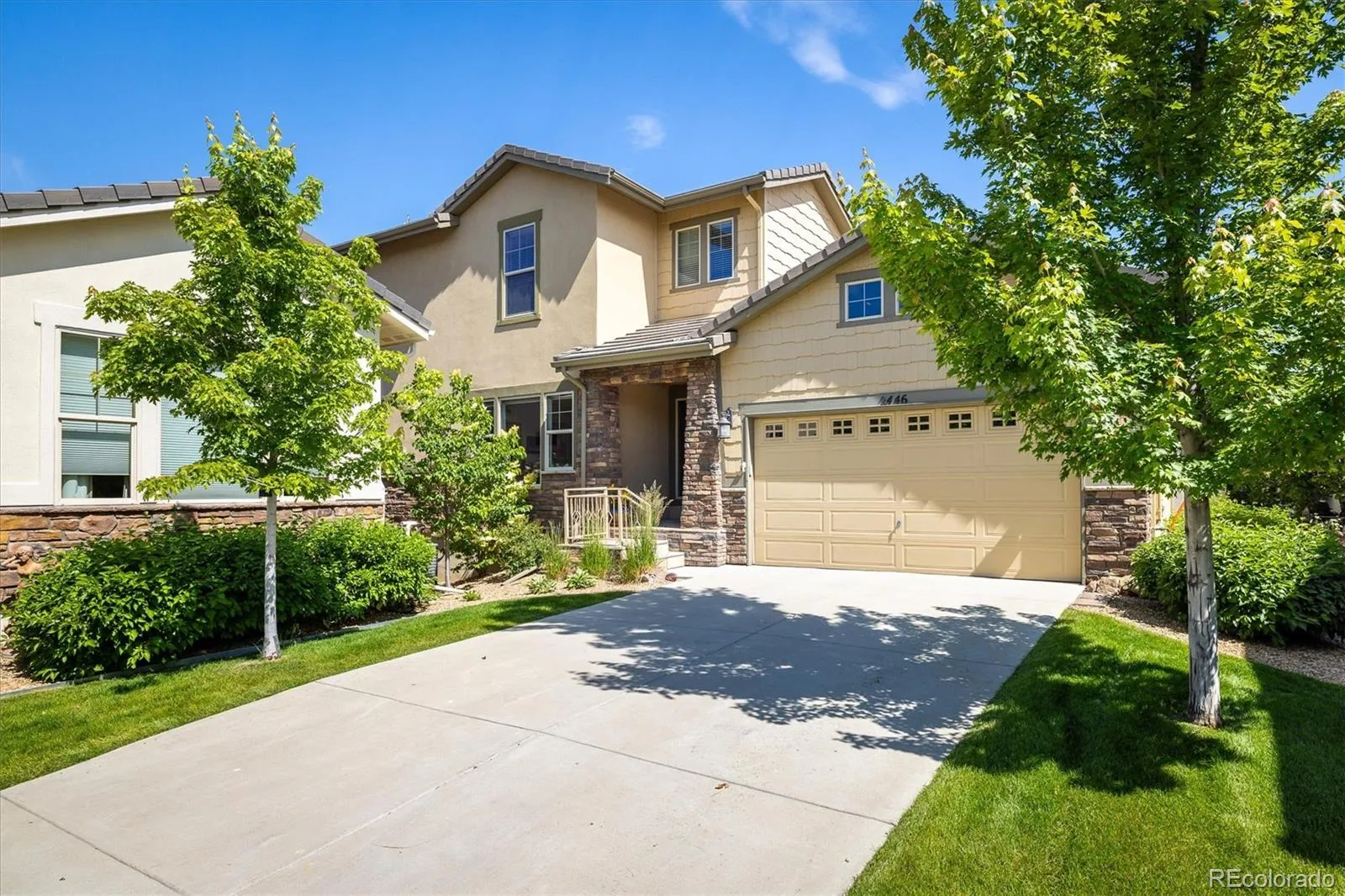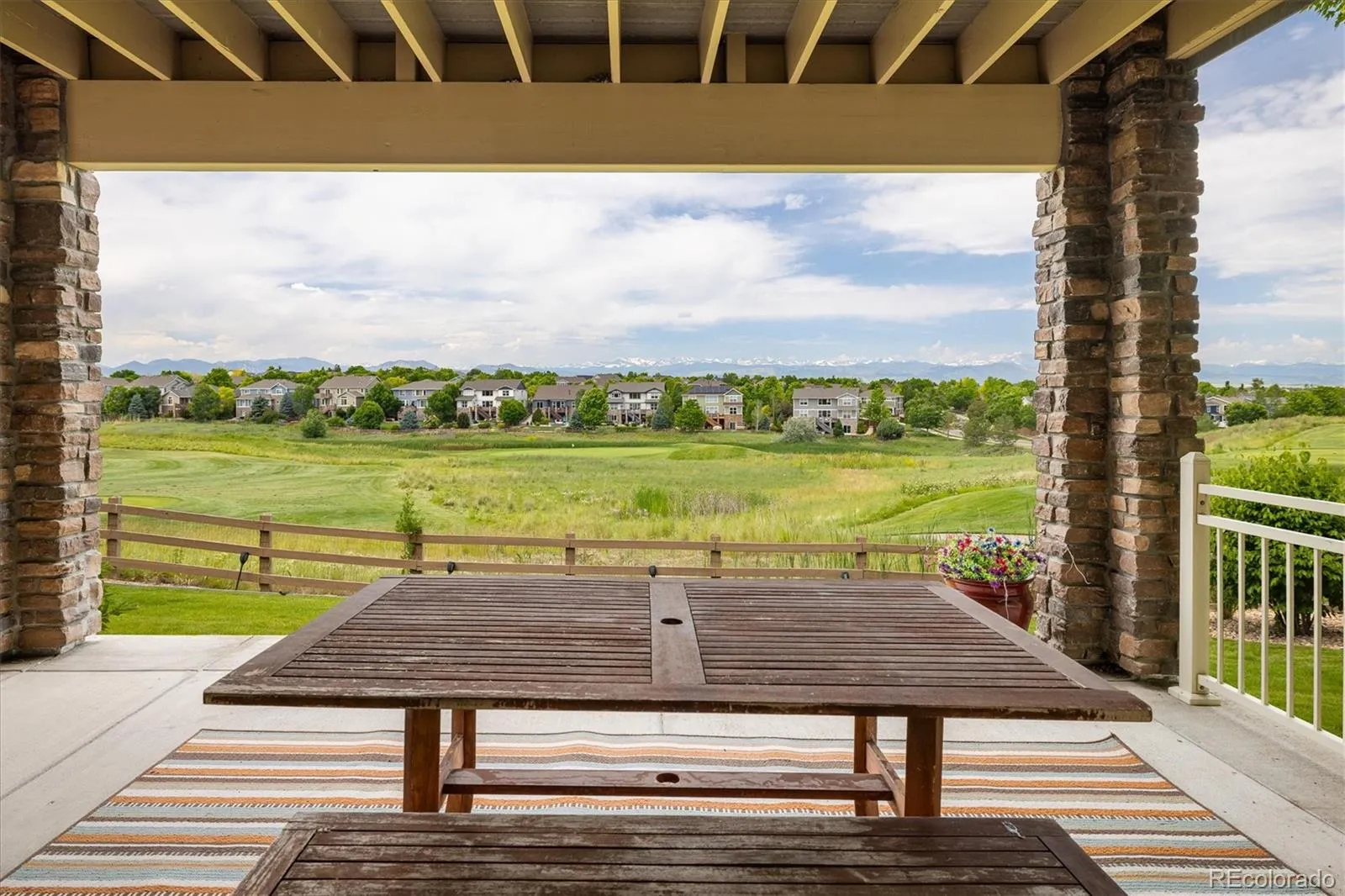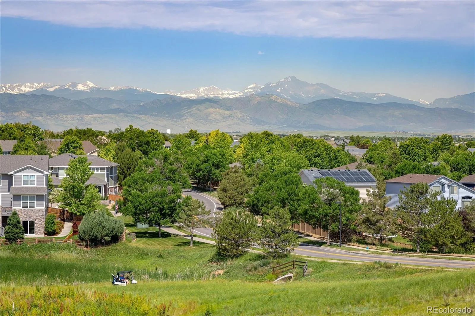 Welcome to a truly rare opportunity in the prestigious Vista Ridge community. This stunning, patio-style home is perfectly positioned on the 1st hole and the 18th tee of the Colorado National Golf Course, offering breathtaking, uninterrupted western views of the snow-capped Rocky Mountains. From Boulder’s iconic Flatirons to Longs Peak in Rocky Mountain National Park, this home captures some of the most scenic vistas in the state. Built in 2016 and lovingly maintained by the original owners, this two-story home offers ideal main-floor living with thoughtful design, timeless finishes, and low-maintenance ease thanks to the HOA that covers lawn care and snow removal. The south-facing driveway ensures easy winter living, complemented by a spacious 3-car garage. The main floor includes the primary suite with serene golf course and mountain views, a cozy alcove reading nook, oversized walk-in shower and tub and a spacious closet with custom built-ins. – Gourmet kitchen with hickory cabinetry, granite countertops, double ovens, gas range with vented hood, and walk-in pantry. Soaring ceilings in the great room, anchored by a gas fireplace with stacked stone surround and a custom designed wooden mantel crafted from an Aspen tree. Dedicated flex space ideal for a home office, library, or piano room. Step outside to your covered back patio, which has been a cherished sanctuary for the current owners, perfect for entertaining, dining al fresco, or relaxing with a glass of wine while watching the sunset or hot air balloons drift across the horizon. Loft/flex space with stunning mountain views, two generously sized bedrooms with large closets and a shared full bathroom. Bright and open finished walk-out basement designed for entertaining with a full kitchen, additional guest bedroom, 3/4 bath, workshop area, and two large storage rooms.