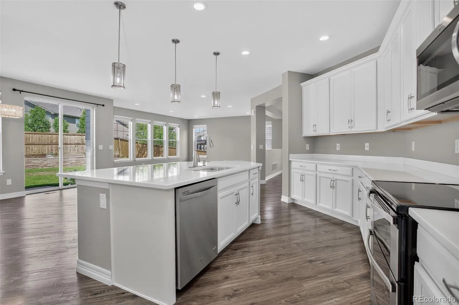 center island, stainless steel appliances, and walk-in pantry. The inviting family room and adjacent dining space create a comfortable setting for gatherings of any size.