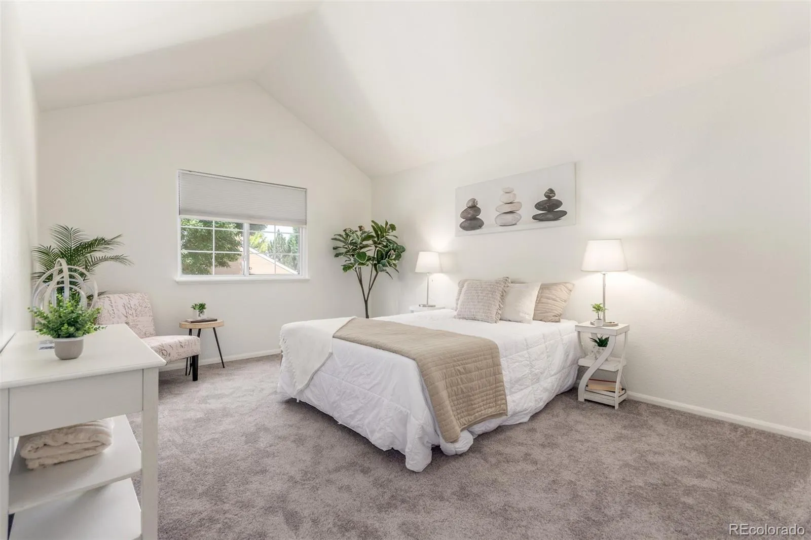 The kitchen features stainless steel appliances, ample wood cabinetry, a large pantry with an appliance outlet, and a cheerful breakfast nook. Upstairs, both bedrooms enjoy vaulted ceilings, including the generous primary suite with dual walk-in closets, a private bath with dual sinks, and plenty of room to relax.