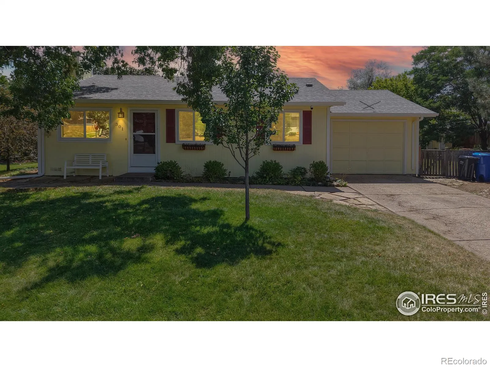 Charming Corner-Lot Home with Updates & Outdoor Oasis! Welcome to 301 Uranus St in Fort Collins – a beautifully maintained 3-bedroom, 2-bath ranch-style home on a spacious corner lot in the desirable Skyview South neighborhood. This 1,256 sq ft home offers a thoughtful mix of comfort, updates, and charm. Step inside to find newer windows, custom cabinetry, and can lighting throughout. The kitchen refrigerator, washer, and dryer all stay, making this home truly move-in ready. The extra-long garage offers plenty of storage space, and the big ensuite bedroom features a walk-in closet and stylish blinds (two sets: dark and light).Enjoy the outdoors with a backyard walk-out, sunshade off the patio, and a newer fence. The garden is ready for planting, and the property boasts mature, well-maintained trees – plus an apple tree with an abundance of apples. A playhouse that matches the home is perfectly nestled between the trees in the backyard for hours of play and charm. Additional highlights include: Radon mitigation system, working fireplace for cozy nights, whole-house fan & central A/C, freshly painted exterior, and crawl space for extra storage