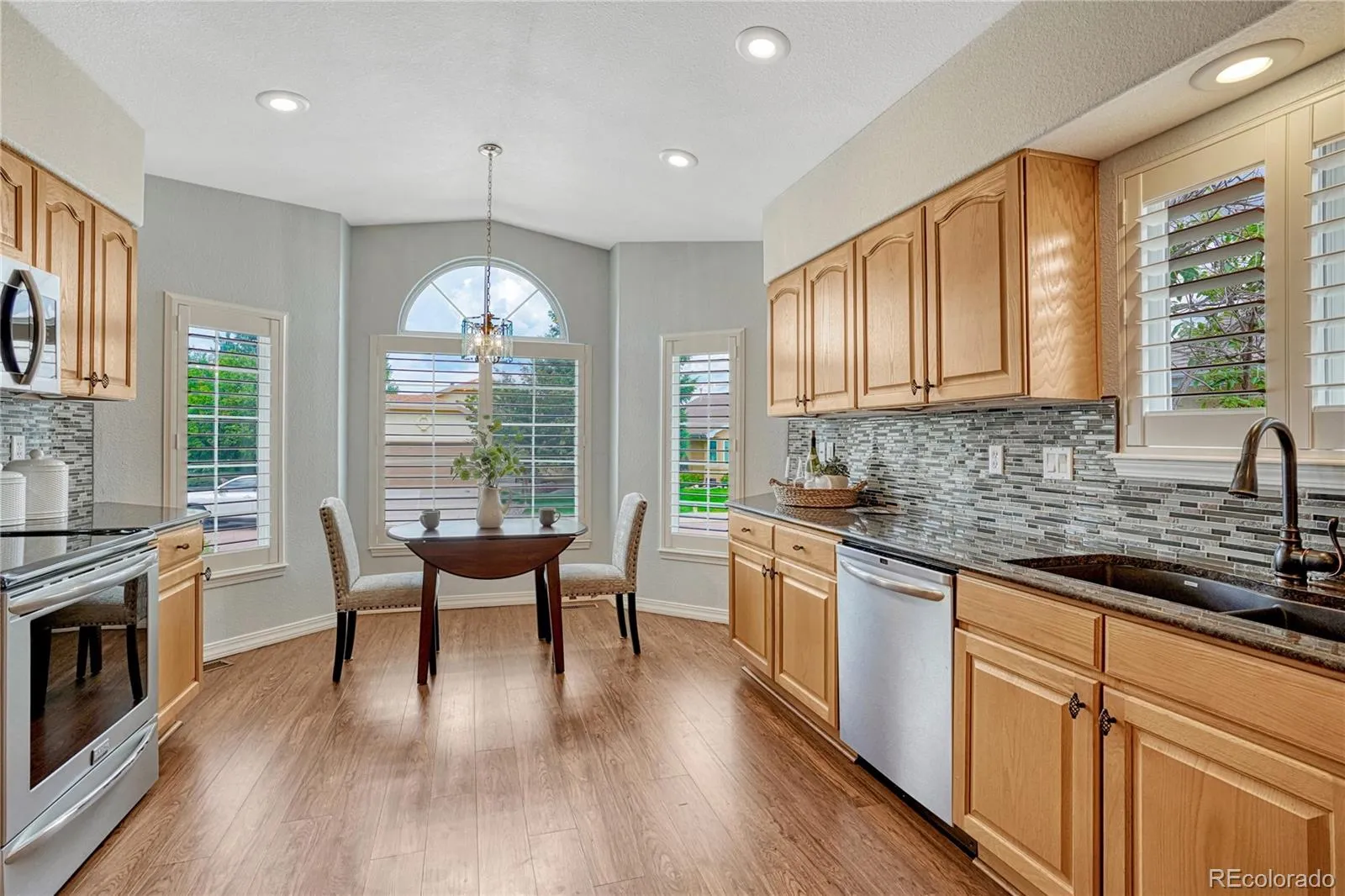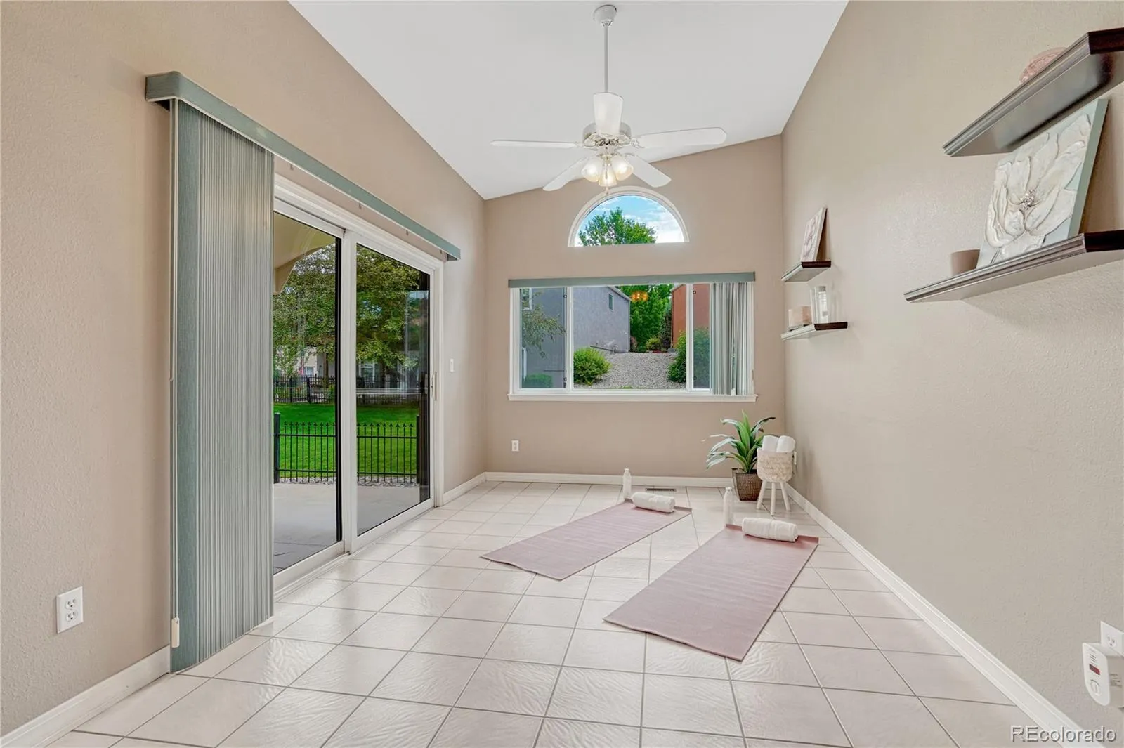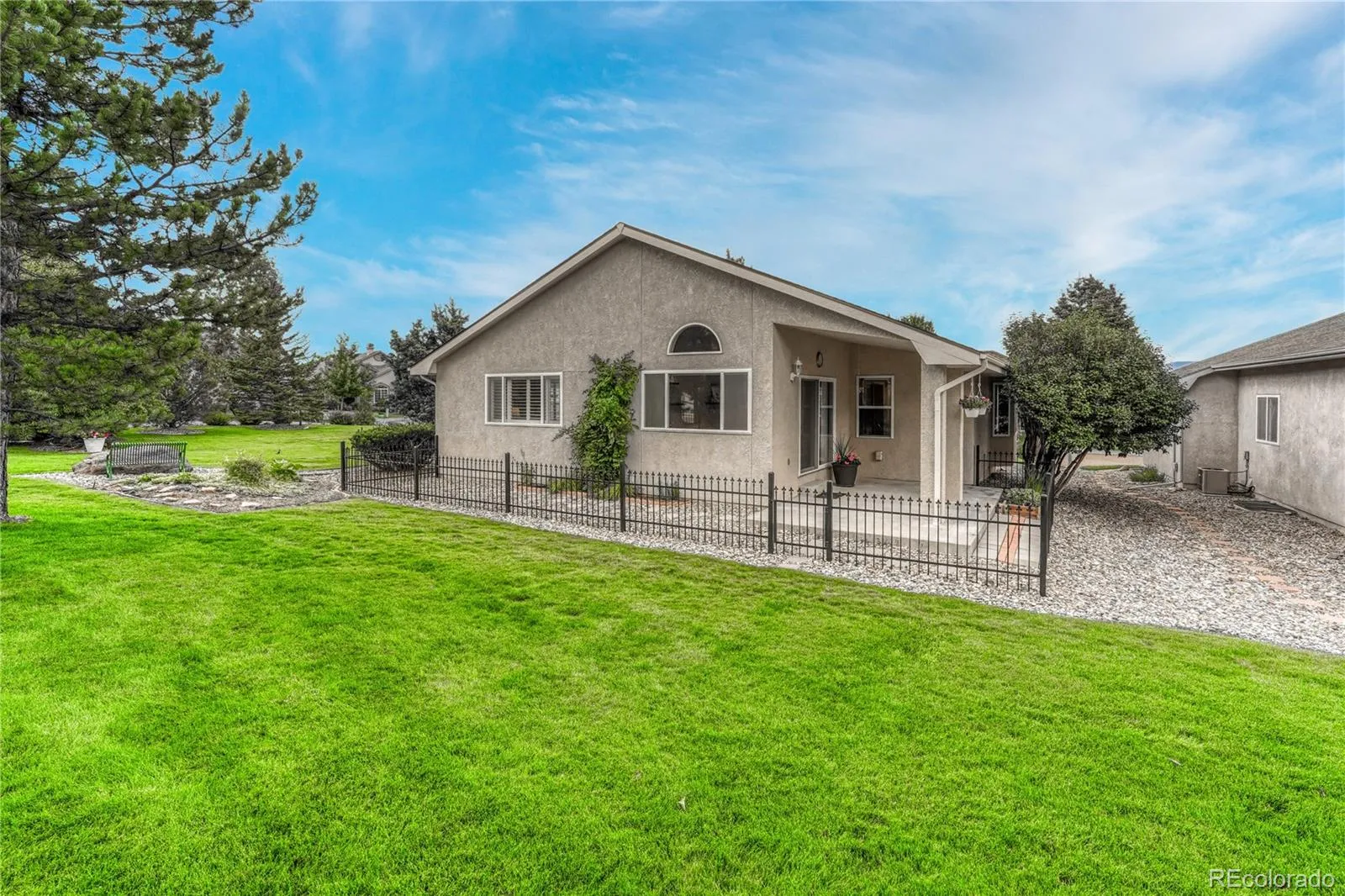 Enjoy low-maintenance main-level living in this inviting 2 bedroom, 2 bath home with oversized 2-car garage, central A/C and 1,713 sq. ft. all thoughtfully designed for comfort and convenience. Step into an open floor plan with luxury vinyl flooring and vaulted ceilings. The great room also features a gas fireplace and, in the adjacent dining area, a bay window. The large eat-in kitchen offers a Pikes Peak peek, plantation shutters, slab granite countertops, graphite sink, pantry and a counter bar. Refrigerator included! Seamlessly make your way to a fantastic flex space which would serve well as a workout space, home office, music or sitting room. Walk-out from this space to a large, covered, private patio…hot tub ready! The spacious primary bedroom features a vaulted ceiling, plantation shutters and ceiling fan. The adjoining ¾ bath has a tile floor, vaulted ceiling, double vanity, walk-in closet and abundant natural light from the skylight. The second bedroom also includes a vaulted ceiling and ceiling fan. The laundry space offers storage and includes the washer and dryer—move-in ready! A full bath will skylight and tile floor round out the space. The oversized garage offers a workbench, window and storage. Outside, enjoy a peaceful setting that opens to a large grassy adjacent lot. HOA fees cover mowing, exterior water, trash, snow removal, pruning/fertilizing and access to the Norwood Recreation Center pool, tennis and pickle ball courts. This home’s location provides access to I-25 in 10 min. and to the Powers Corridor in 7 min. making entertainment, dining, schools and shopping easy and convenient.