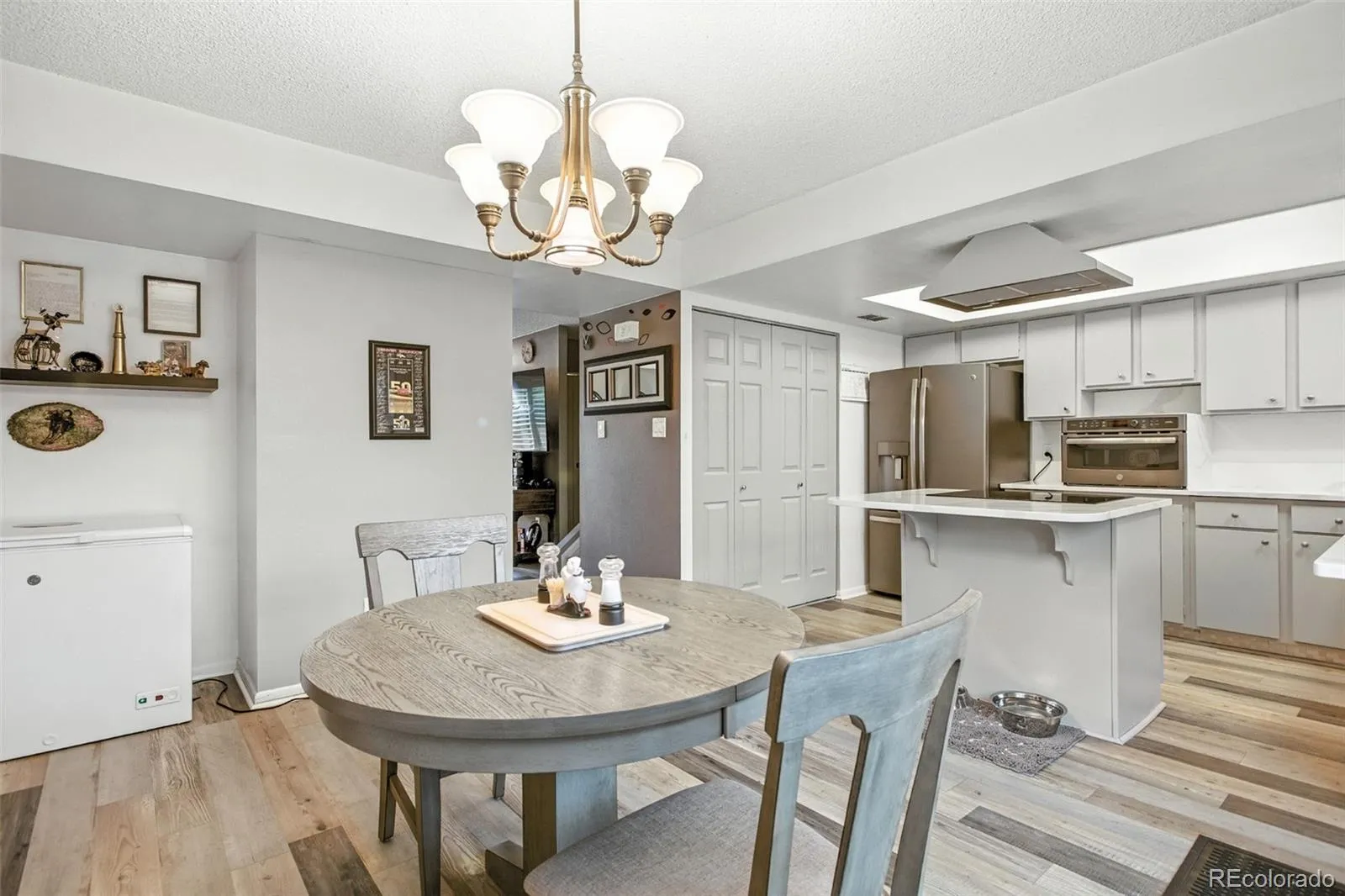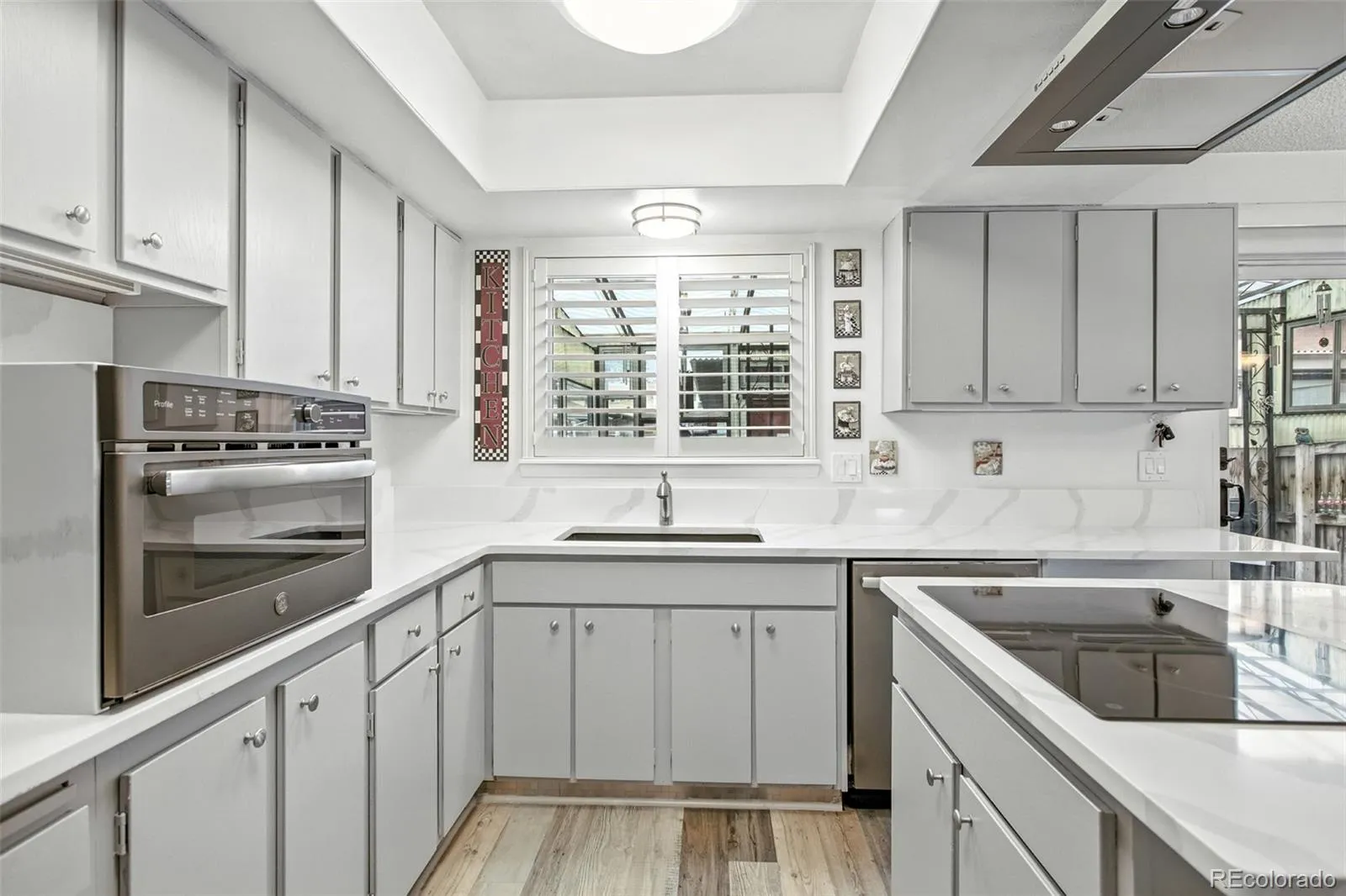 The fully remodeled kitchen is a true centerpiece, showcasing GE Slate appliances, quartz countertops, new cabinetry, & a layout ideal for cooking & entertaining.