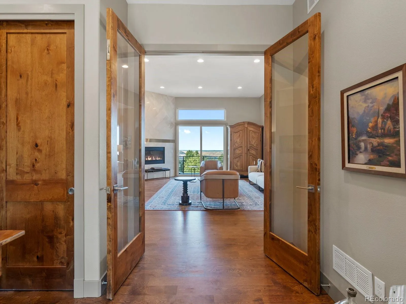 This custom home offers unmatched panoramic views of Denver and the Front Range, giving you the feeling of a private mountain retreat while still being close to the city. Tucked inside the exclusive gated community of Roxborough Park, this property combines privacy, luxury, and Colorado’s natural beauty. Roxborough Park is renowned for its dramatic red rock formations, miles of scenic hiking and biking trails, and world-class golf at both Arrowhead Golf Club and the private Ravenna Country Club. Perfectly positioned on a quiet cul-de-sac lot, this home offers tranquility, privacy, and an incredible outdoor living experience. Step inside and be immediately impressed by soaring ceilings, tall doorways, and thoughtful updates throughout. The main living area flows seamlessly to the lanai-style outdoor living space through expansive sliding glass doors, creating the ultimate indoor-outdoor lifestyle. The kitchen has quartz countertops, a big center island, top-of-the-line appliances, a gas range, and abundant storage. The main-floor primary suite is privately tucked away with sweeping views of Denver, a spa-like bathroom featuring a freestanding soaking tub, timeless finishes, and an oversized walk-in closet. A dedicated home office with French doors and backyard access provides a work-from-home retreat. The main level also includes a guest suite with a private bath and a conveniently located laundry room. The walk-out lower level is bathed in natural light, offering a large entertainment area, two oversized bedrooms with walk-in closets, and two large bathrooms, one being an ensuite guest that feels like a second primary.