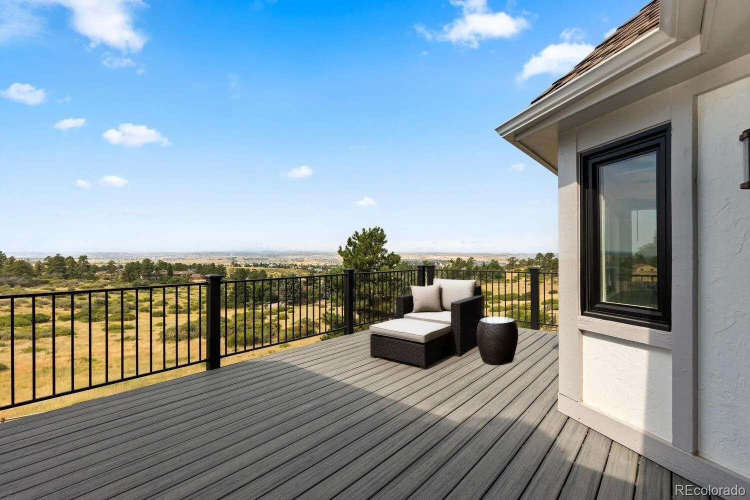 $200,000 PRICE DROP! Commanding, unforgettable, & entirely one-of-a-kind, 7689 N. Sunrise Trail is a nearly 7,500 sq. ft. estate crowning 5 pristine acres in Parker’s prestigious Butterfield enclave where cinematic peak-to-peak views ensure every sunset feels like a work of art! With $350K+ in upgrades—including a remodeled Primary Suite bath, new windows throughout, basement kitchen remodel, fresh interior/exterior paint, & new asphalt driveway—this estate balances timeless grandeur with modern elegance. Step inside to the brick herringbone foyer wrapped in timeless shiplap walls, setting the tone for warmth & elegance throughout. The Great Room boasts a dramatic floor-to-ceiling fireplace with a wall of windows that frame the Rocky Mountains in breathtaking panoramas. A corner coffee bar adds charm, while the gourmet kitchen shines w/marble counters, maple cabinetry, gas stove, & a conversational island. An adjacent sunlit breakfast nook offers the perfect setting for casual meals w/views that stretch for miles. A main-level bedroom w/updated ensuite bath, private office, elegant dining room, & stylish laundry/mudroom complete the level. Luxury’s on repeat as you head upstairs to the Primary Suite retreat featuring a newly remodeled 5 piece en-suite bath with dual quartz vanity, freestanding soaking tub, glass shower, & walk-in closet. Down the hall, the perks keep stacking: 3 generous bedrooms—one with a refreshed en-suite, two w/direct deck access, & another full bath. Take it to the top—literally. The 4th level is part penthouse and part playground & makes the perfect guest suite! The walkout basement boasts a remodeled kitchen bar area for mixing, mingling, & margaritas; a full bath; a massive gym/7th non-conforming bedroom & endless room to host, lounge, or live it up. Freedom meets opportunity with RR zoning, well & septic—bring your horses or build an outbuilding; so many options all in the heart of Parker. The views will stop you & this home will move you.